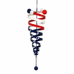 Stripes and stars spin with elegance as a gentle breeze sets this Patriotic Hanging Spinner in motion! The 3D kinetic design brings a sense of wonder and illusion as the colorful red white and blue hanging spinner comes alive. Spinning wind cups add an extra design detail at the top of this beautifully hand painted patriotic spinner.