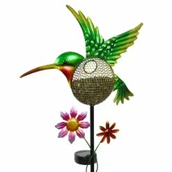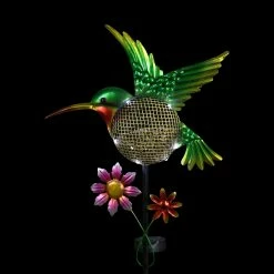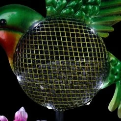 Feed birds day and night with this beautifully hand painted Solar Hummingbird Mesh Bird Feeder Garden Stake. Solar design illuminates at dusk with LED lights. This piece of art is easily placed anywhere in your garden and welcomes birds to feed from its convenient metal mesh basket. Adds instant charm to your garden and makes a wonderful gift for the bird watching enthusiast!