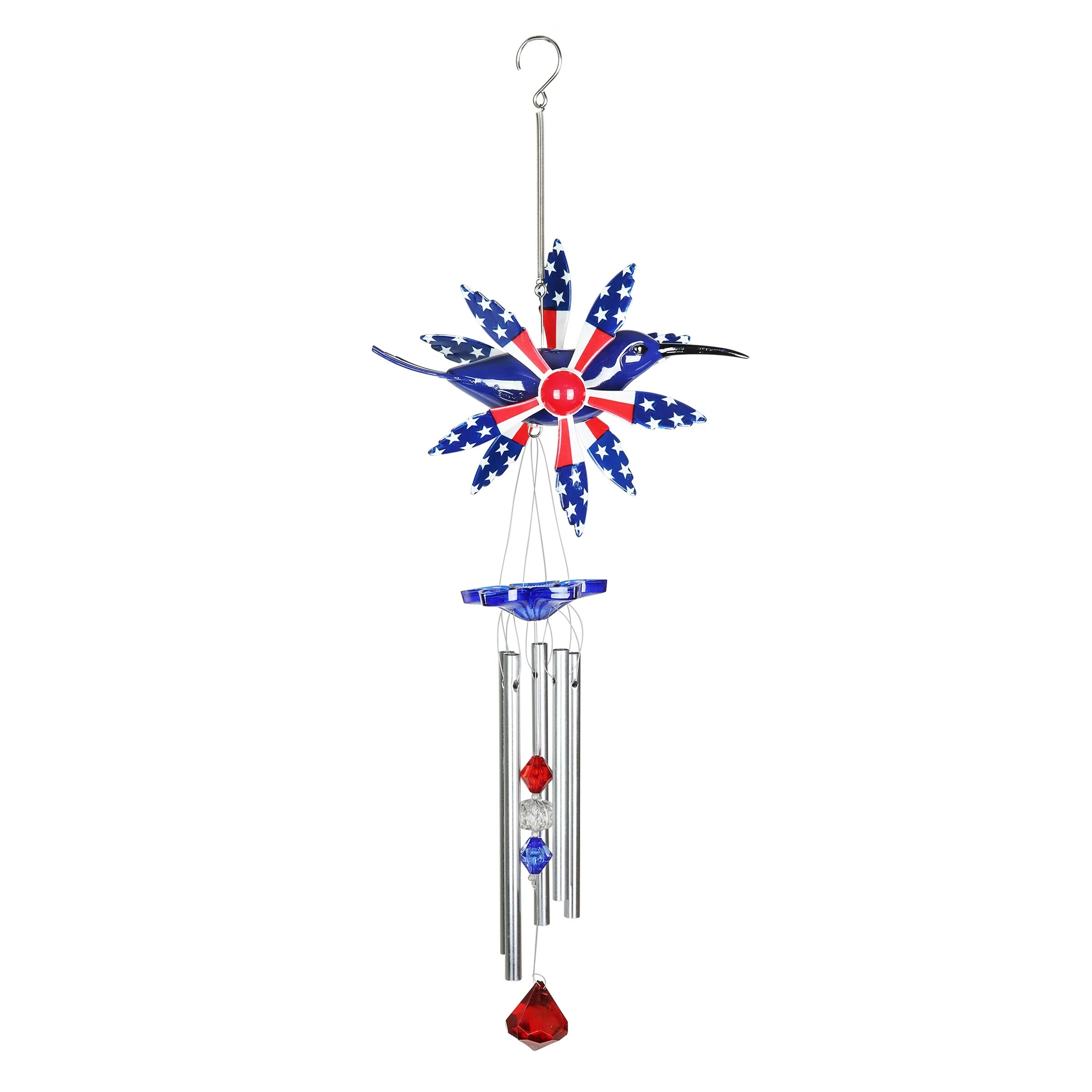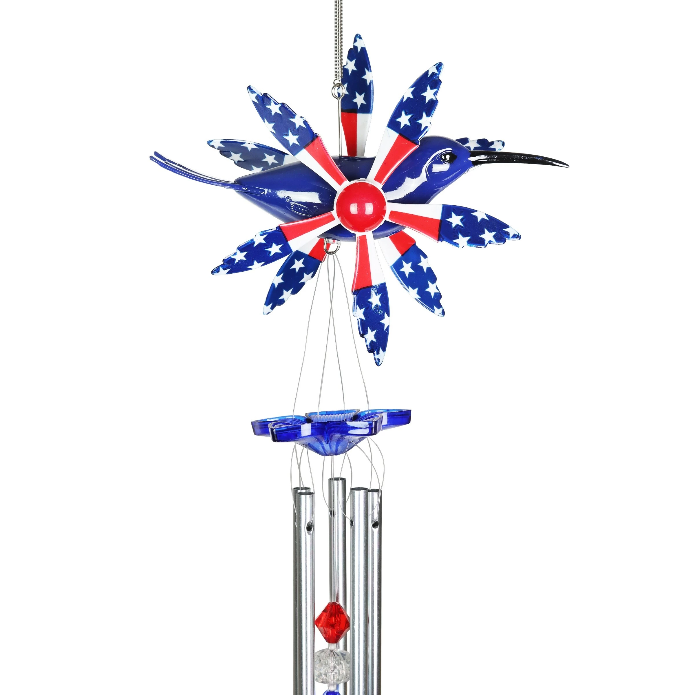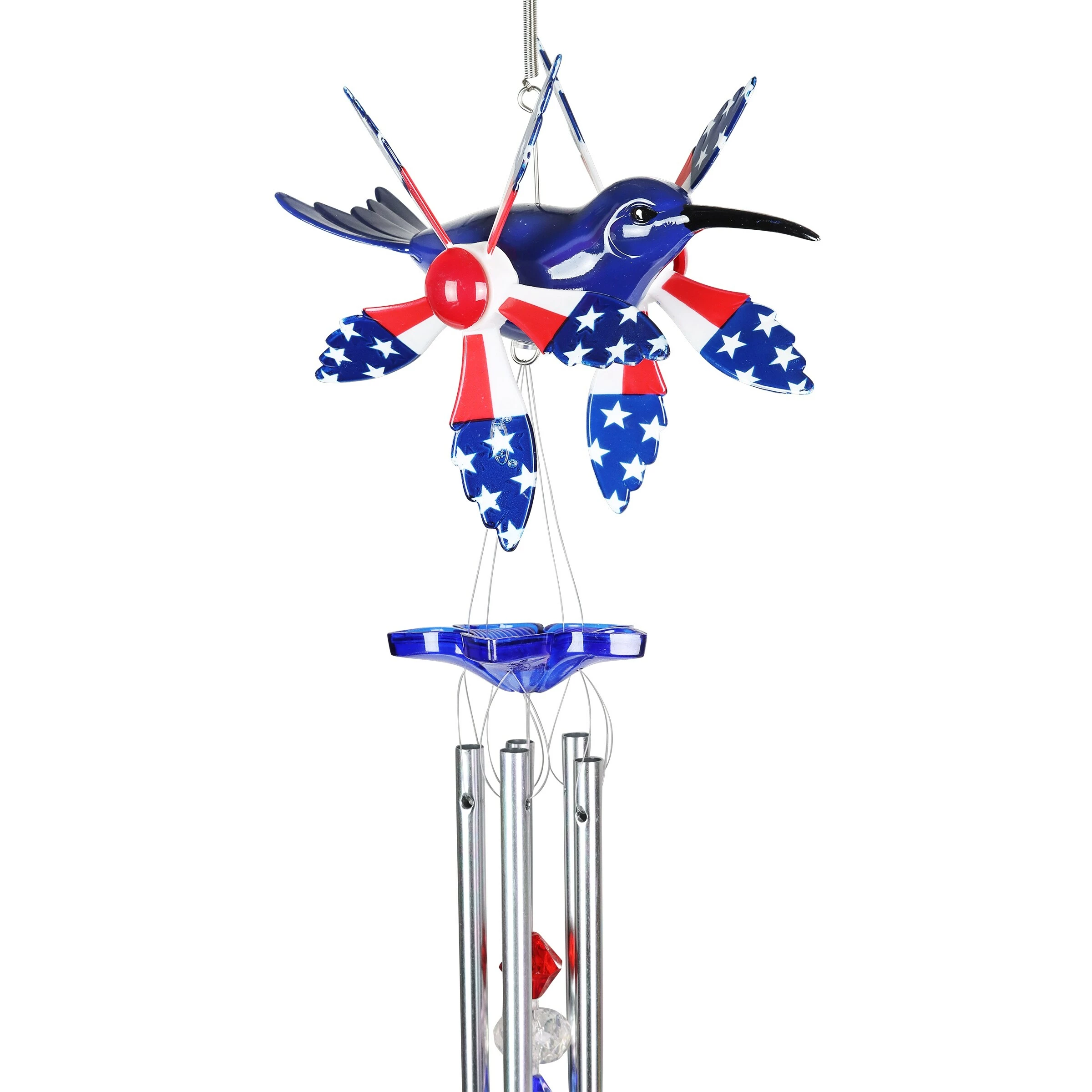 Enjoy the relaxing sounds of wind chimes as a gentle breeze passes through this beautifully hand painted Patriotic Hummingbird Wind Chime. The center of this Whirligig will spin adding even more movement and fun! This charming wind chime adds a pop of patriotic pride with its stripes and stars design. Add color and sweet-sounding music to any home. Makes a great gift and wonderful addition to your garden!