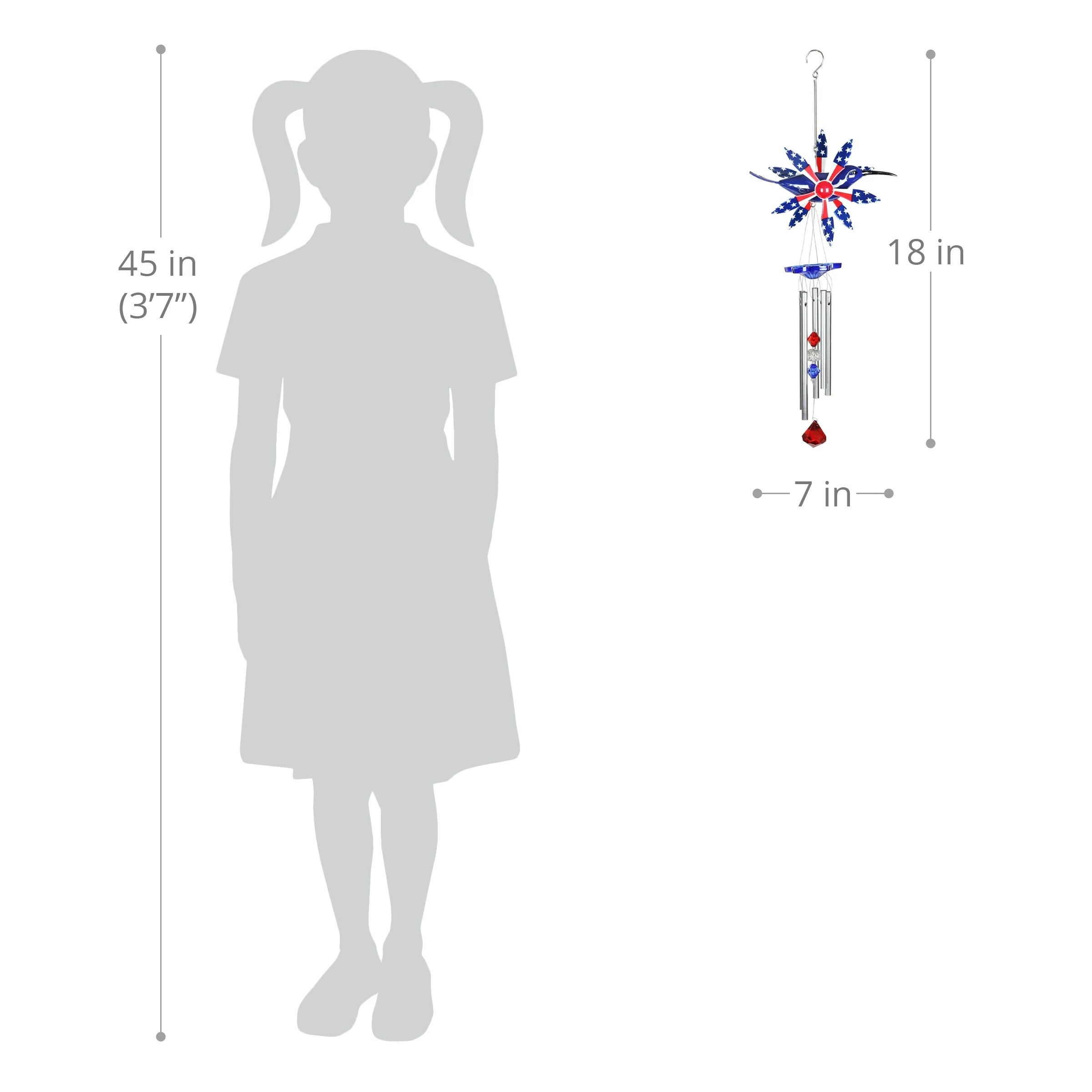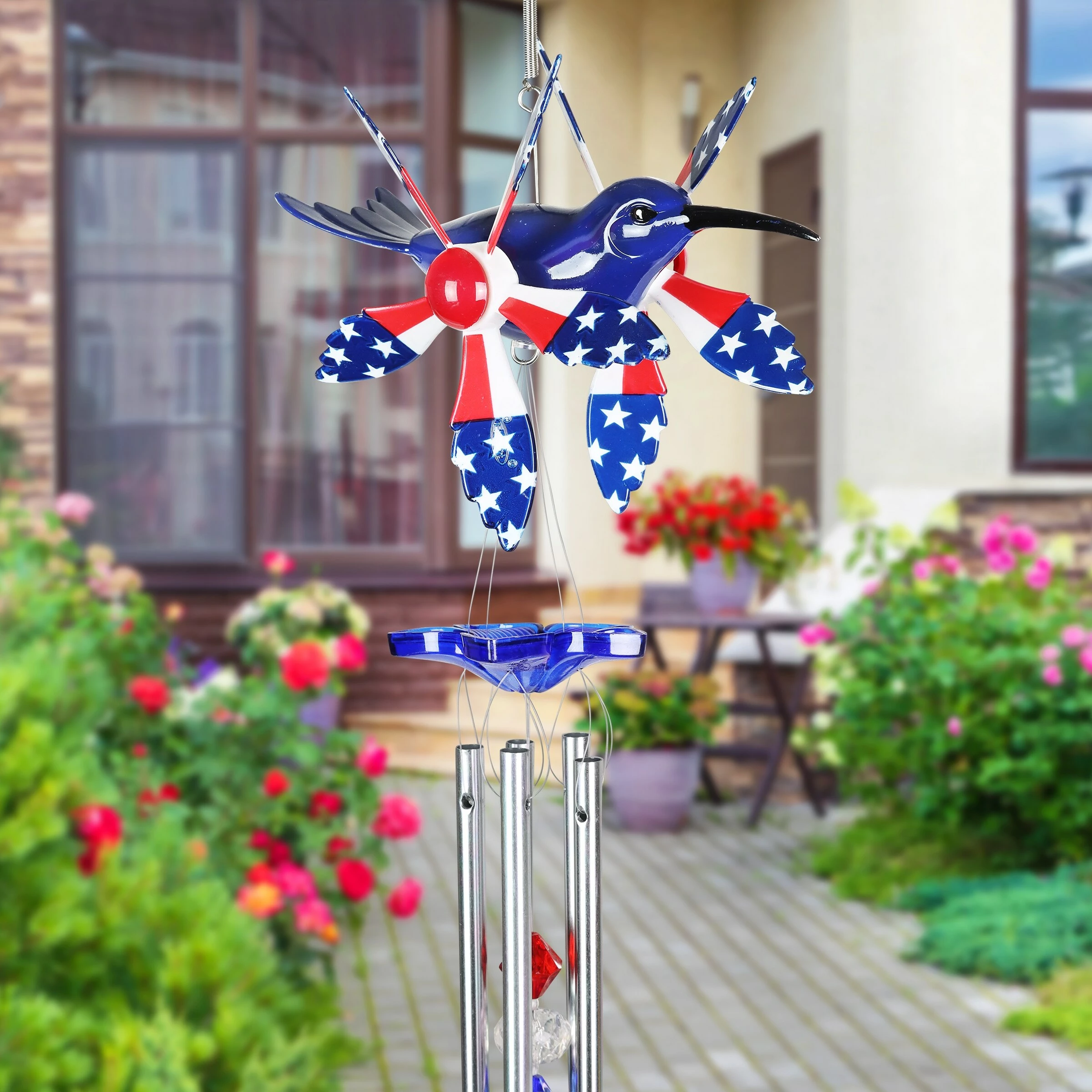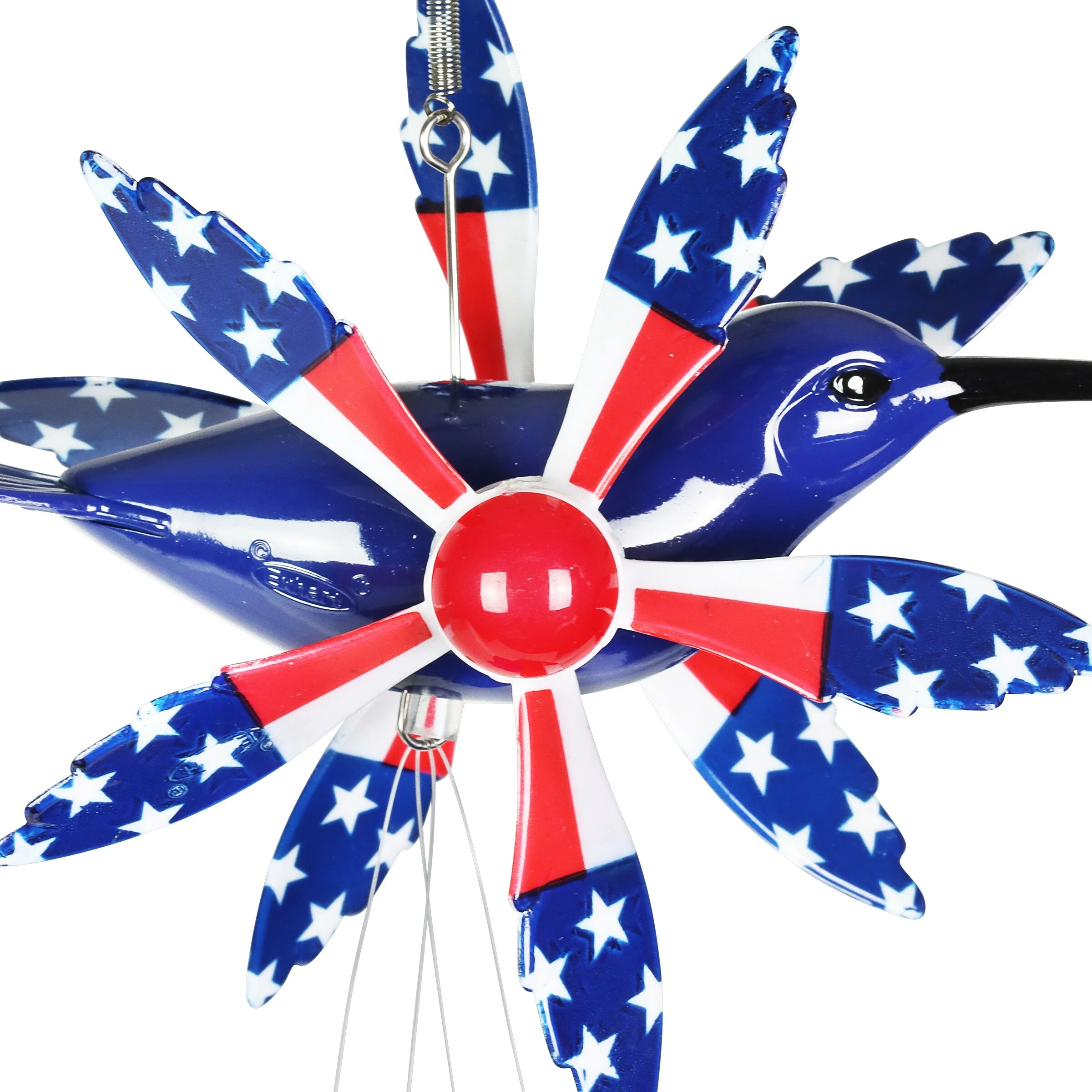 Enjoy the relaxing sounds of wind chimes as a gentle breeze passes through this beautifully hand painted Patriotic Hummingbird Wind Chime. The center of this Whirligig will spin adding even more movement and fun! This charming wind chime adds a pop of patriotic pride with its stripes and stars design. Add color and sweet-sounding music to any home. Makes a great gift and wonderful addition to your garden!