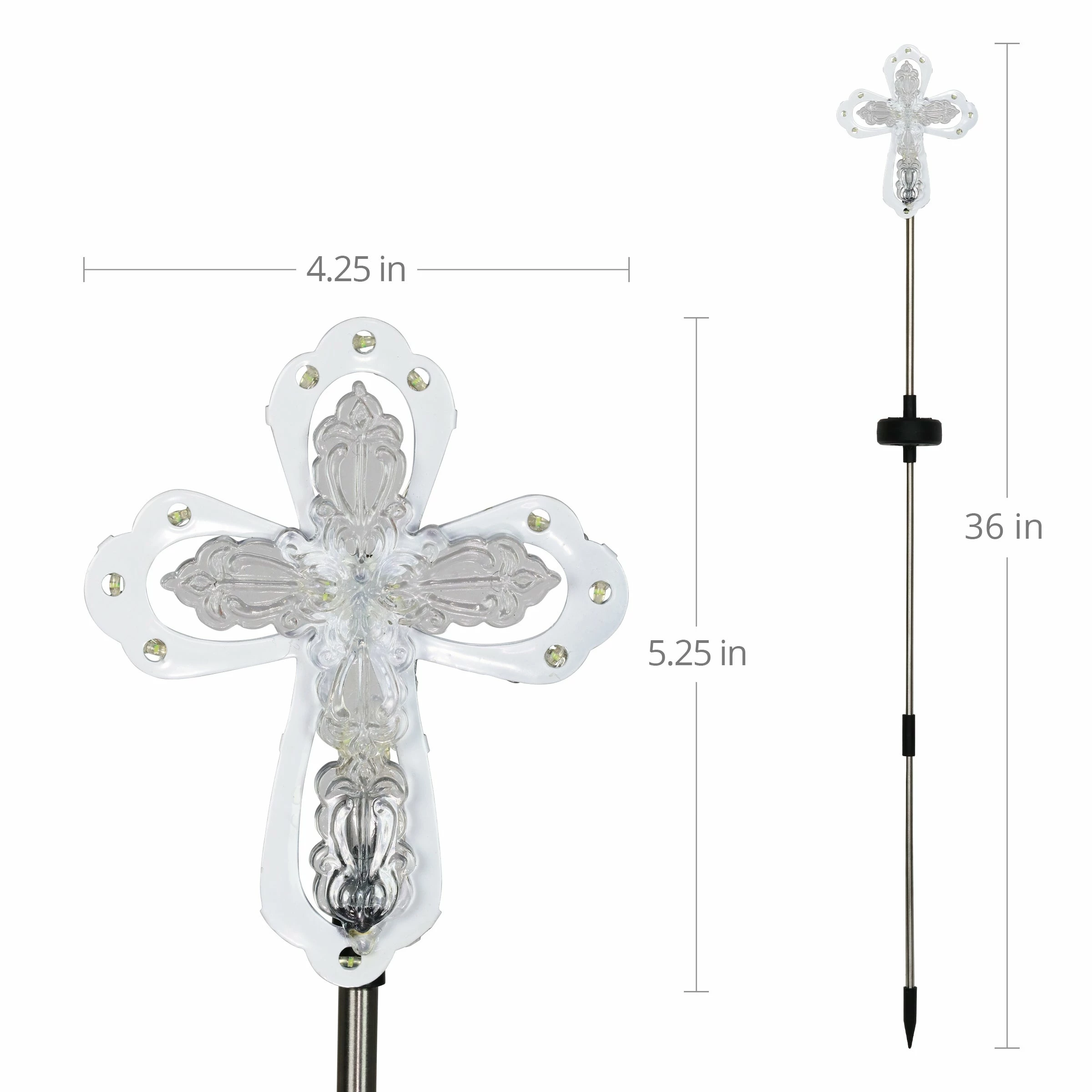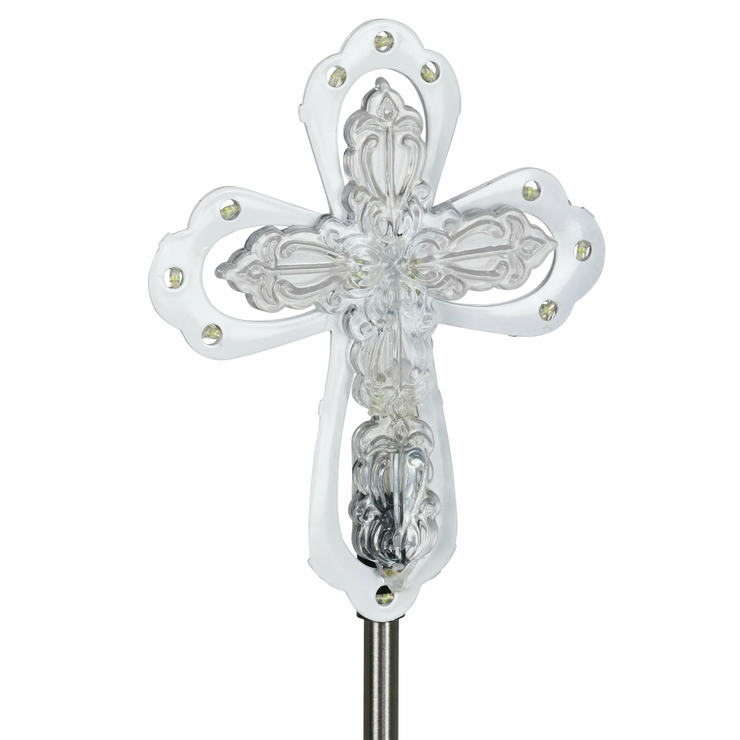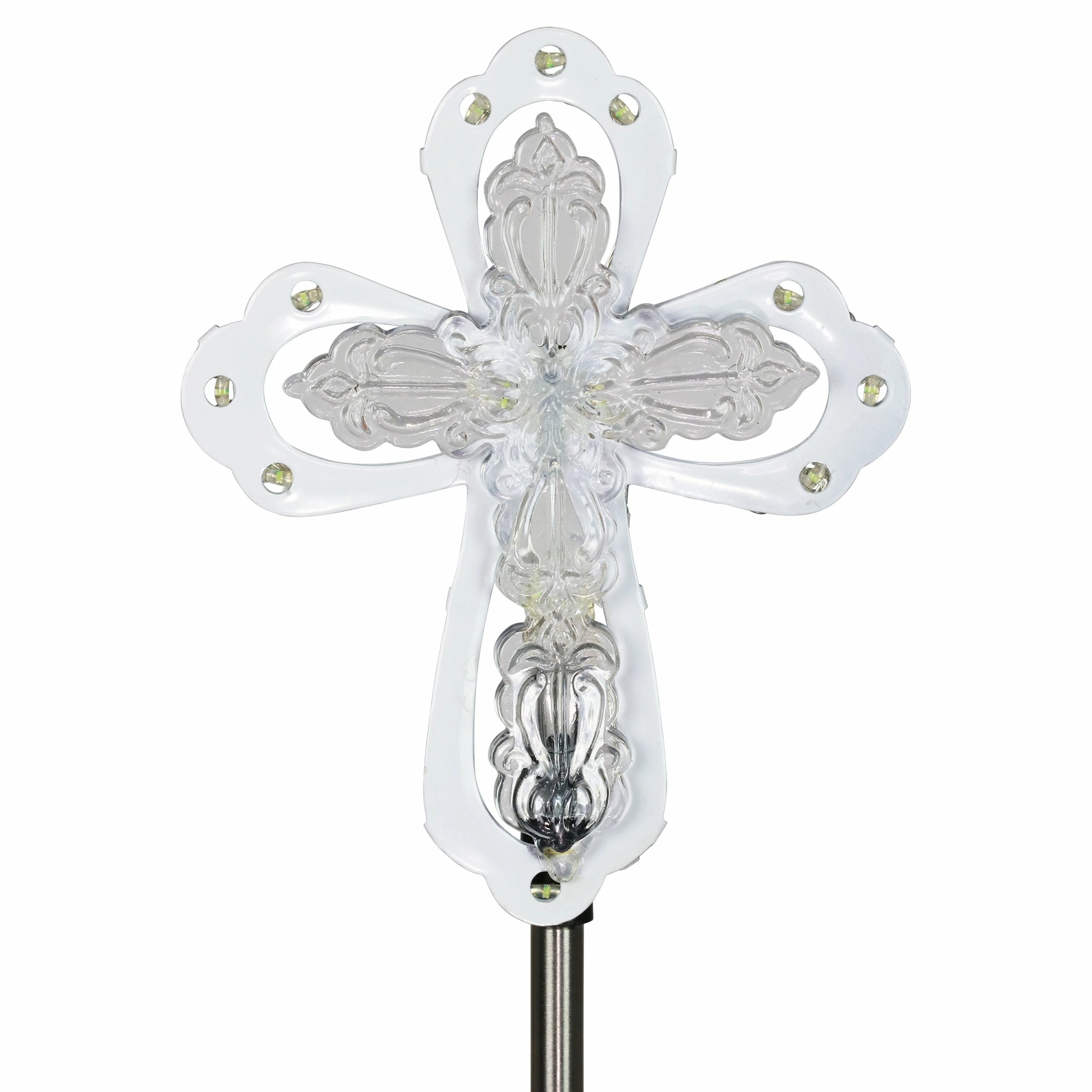 Allow your faith, values and personality to shine through your garden decor choices! This exquisitely designed solar acrylic and metal cross garden stake does just that. As the sun sets and dusk settles in, your cross automatically glows with 13 LED lights. An energy efficient solar panel will charge in the sun during the day and automatically illuminate at dusk. Makes a beautiful and thoughtful gift of love and protection. This beautiful piece honors your faith and can also serve as a special garden marker for your loved ones. This is a very special piece any way you choose to display it.