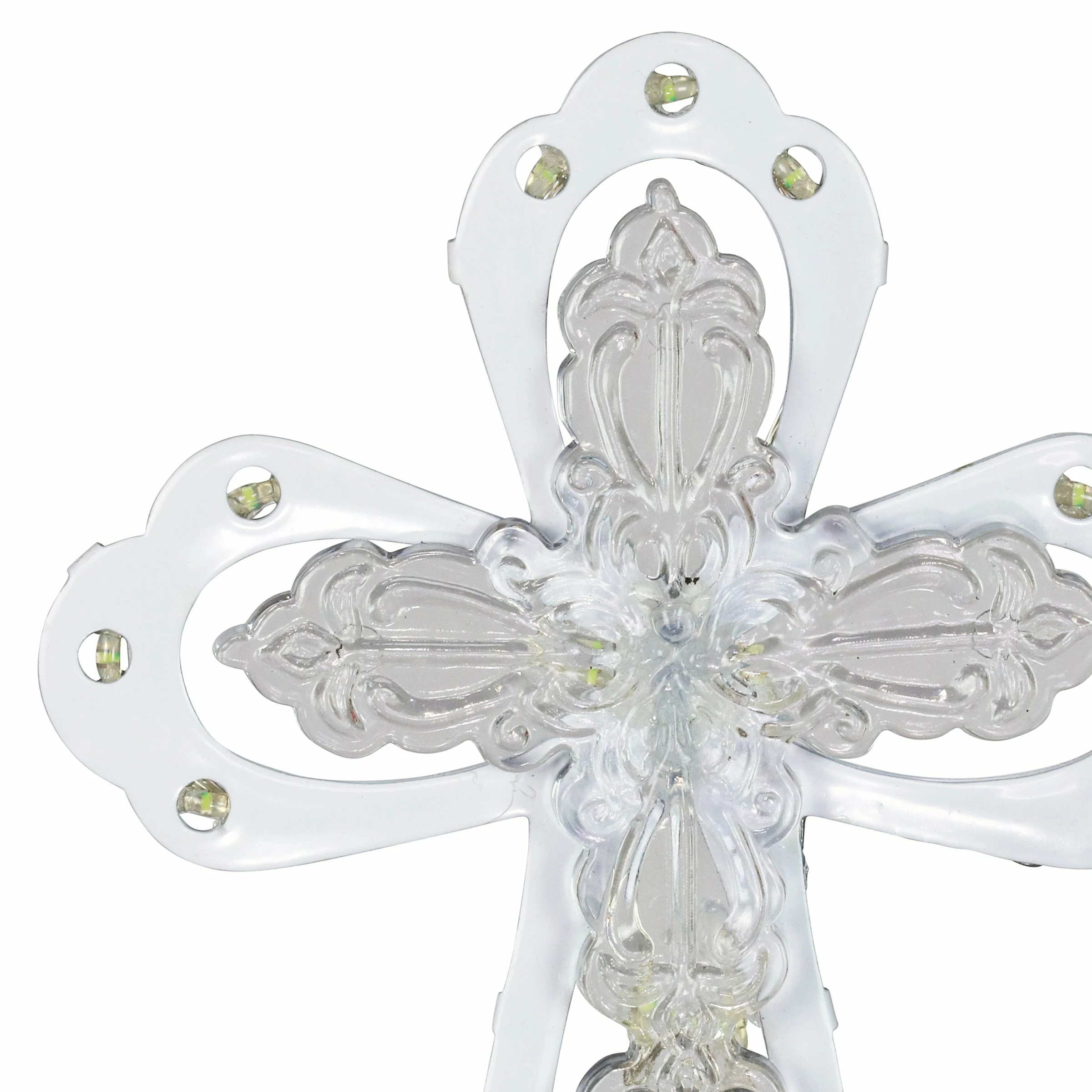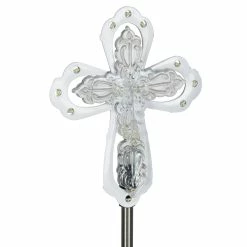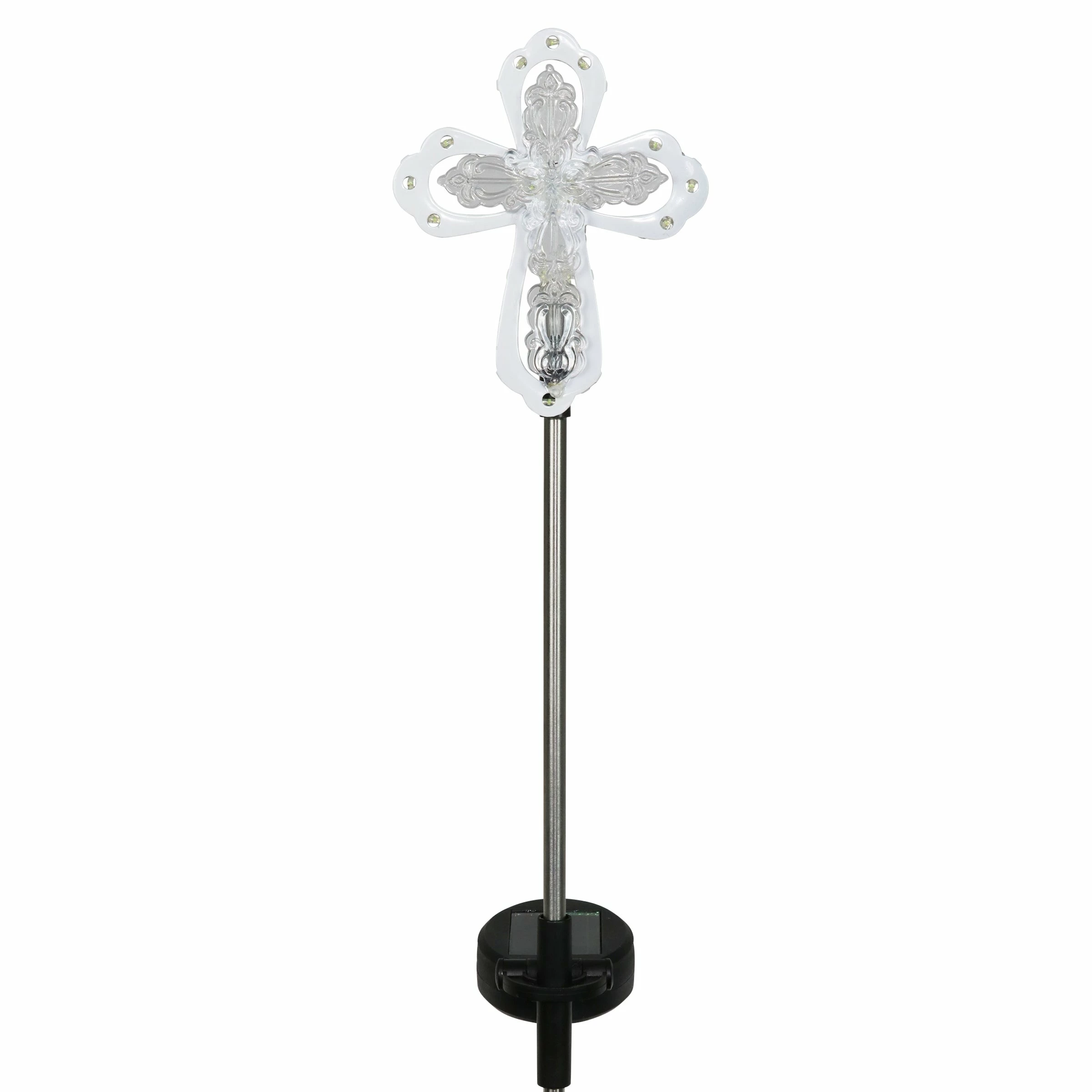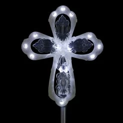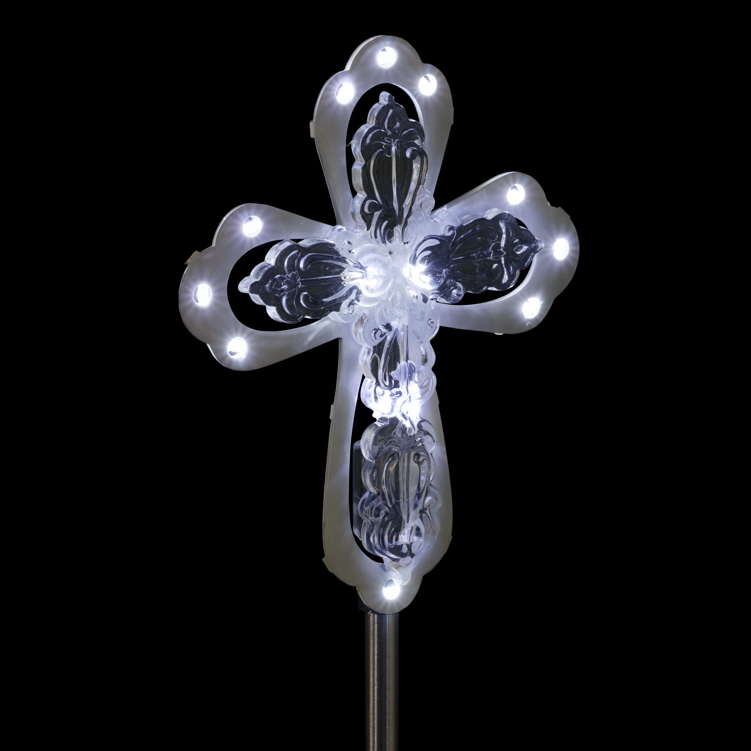 Allow your faith, values and personality to shine through your garden decor choices! This exquisitely designed solar acrylic and metal cross garden stake does just that. As the sun sets and dusk settles in, your cross automatically glows with 13 LED lights. An energy efficient solar panel will charge in the sun during the day and automatically illuminate at dusk. Makes a beautiful and thoughtful gift of love and protection. This beautiful piece honors your faith and can also serve as a special garden marker for your loved ones. This is a very special piece any way you choose to display it.