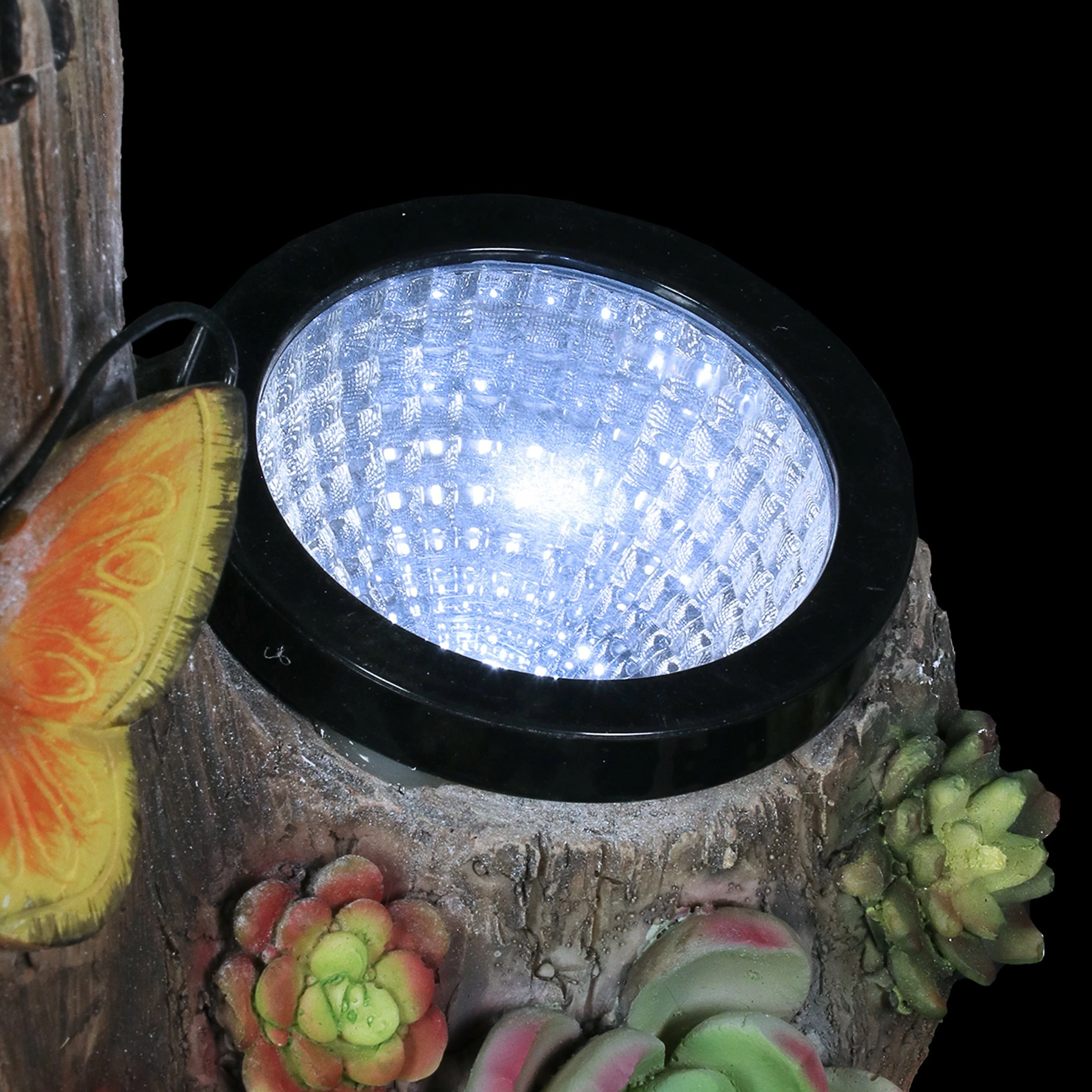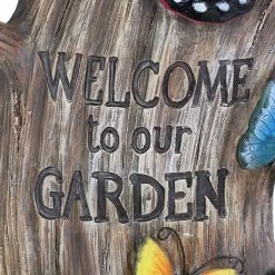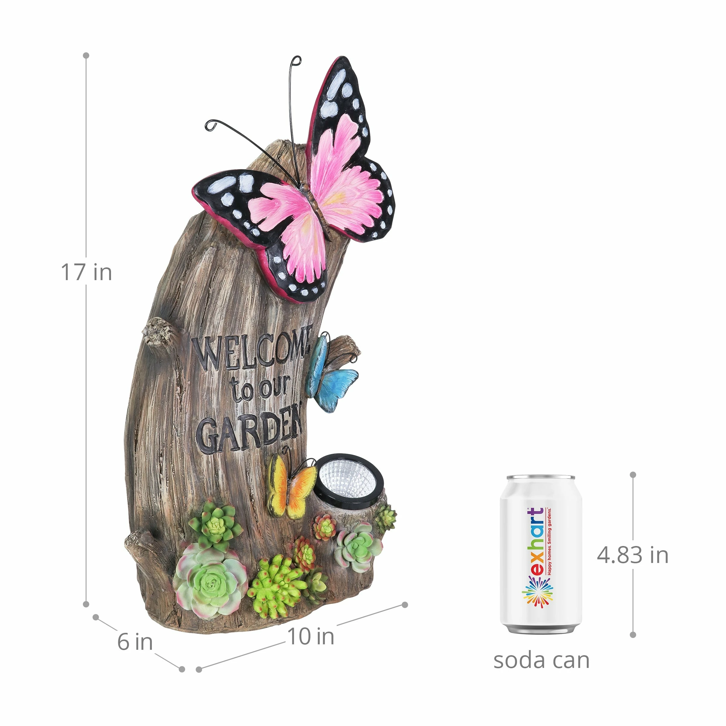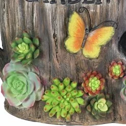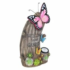 Greet friends and neighbors with this adorable illuminating “Welcome to our Garden” Tree Stump Statue. The solar powered LED light automatically glows at dusk so you can enjoy this sign day and night. Beautifully hand painted butterflies and succulents make this a whimsical and charming addition to your home.