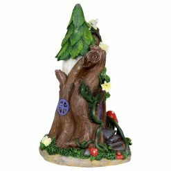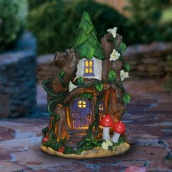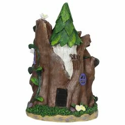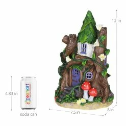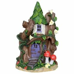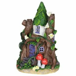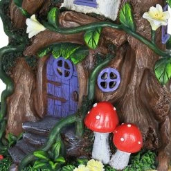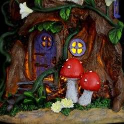 This solar fairy house will instantly captivate your imagination and warm your heart! Enjoy its beautifully hand-painted details including purple doors and windows, creeping flowered vines, and red mushrooms. This fairy house is sure to bring a smile to your face and a sense of whimsy to your space.