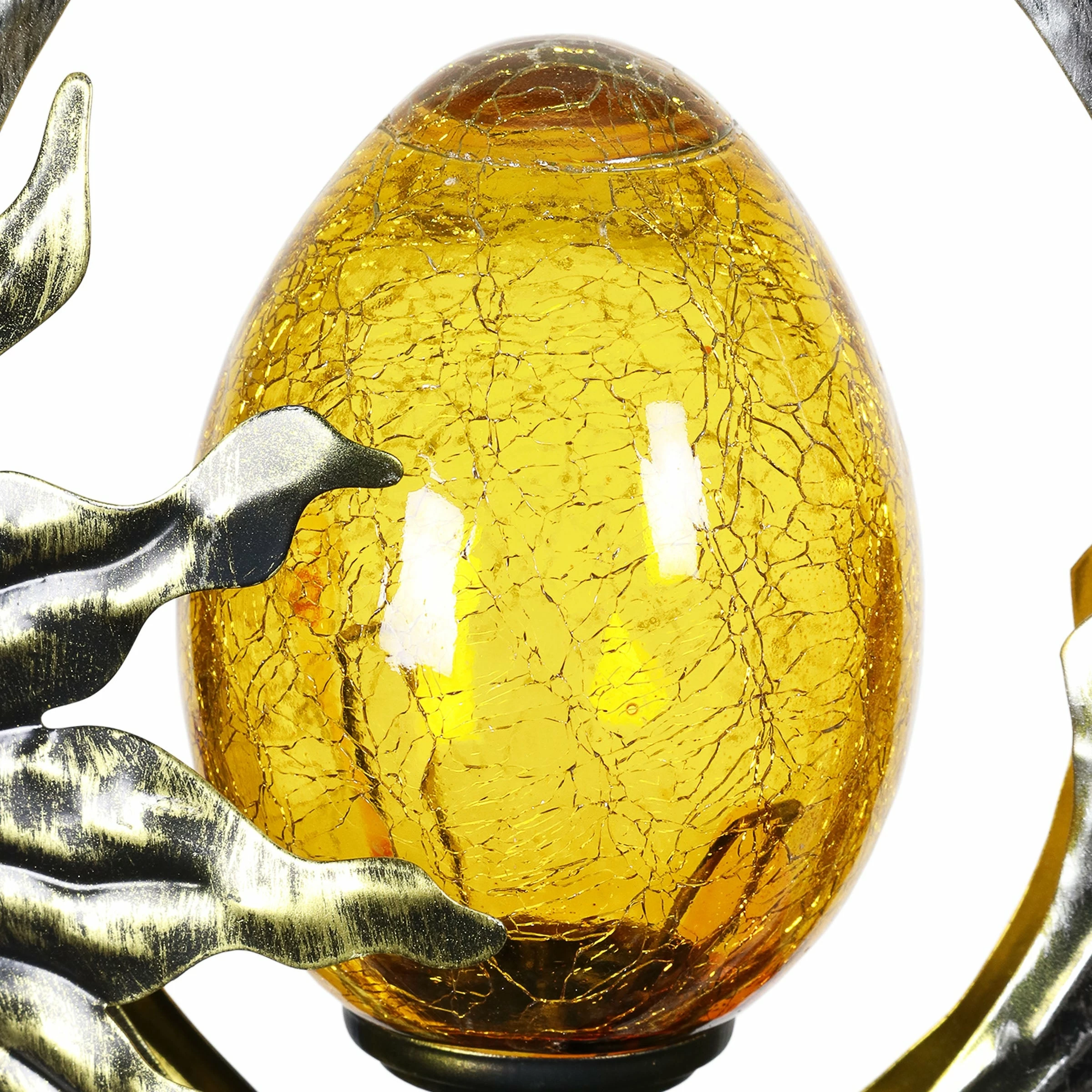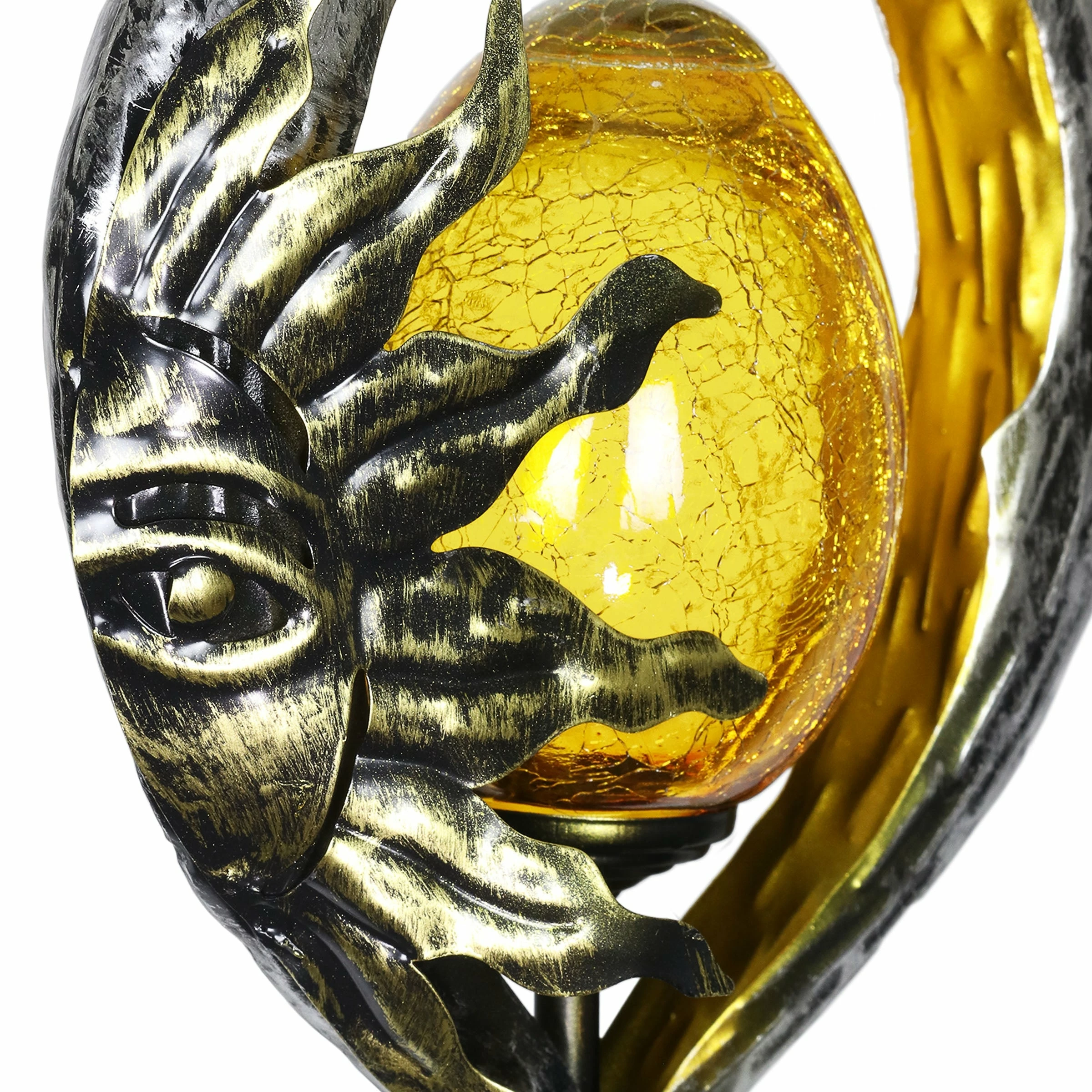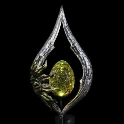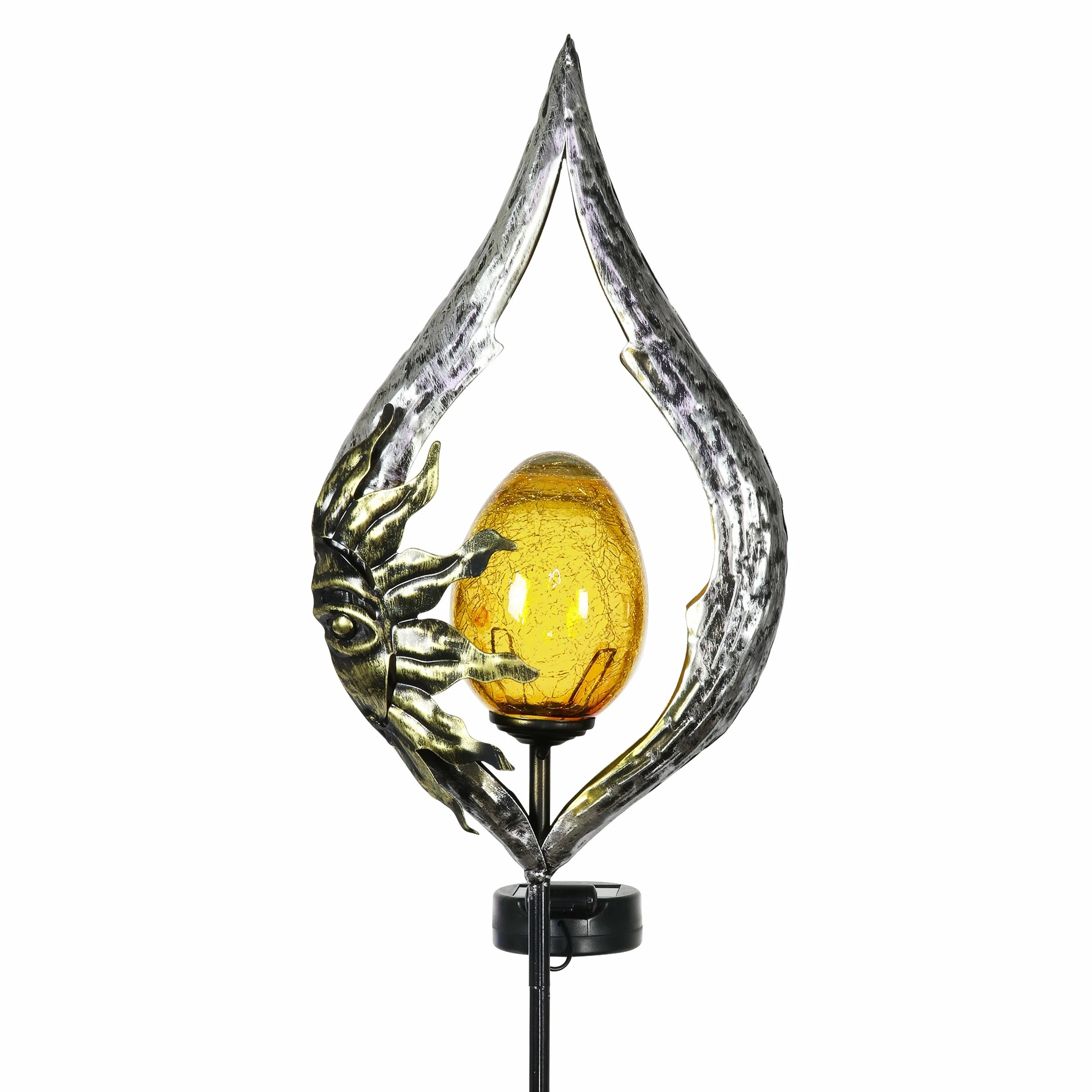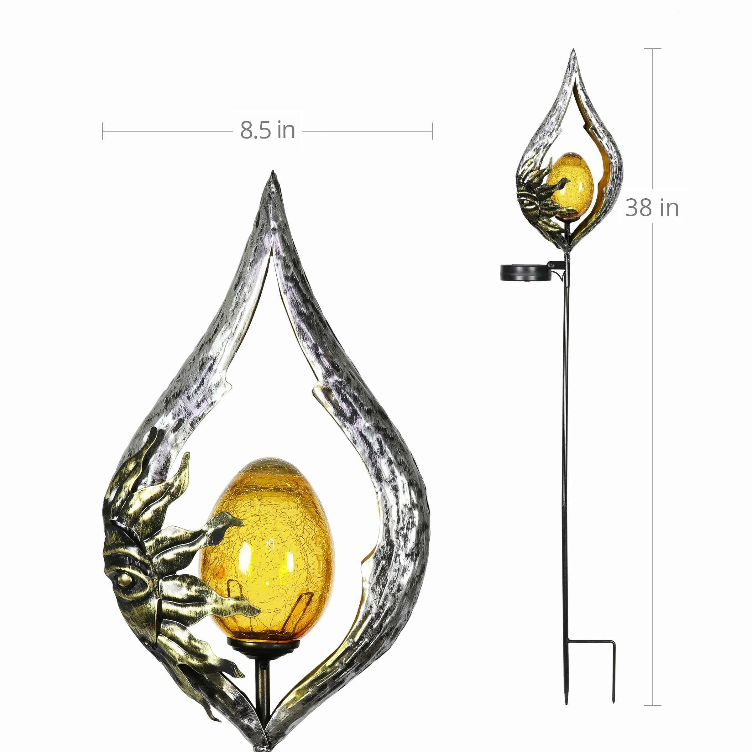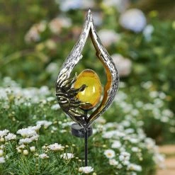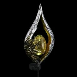 Decorate your garden with a glowing garden stake that speaks to your sense of style! An illuminating glass ball is framed in silver teardrop shaped metal adorned with a beautiful gold sun, adding a celestial touch to your landscape. The amber glass ball at the center illuminates with solar powered LED light. With an energy efficient solar panel, this garden stake will charge in the sun during the day and automatically glow at dusk. It’s what we like to call, effortless elegance! Makes a wonderful gift idea too.