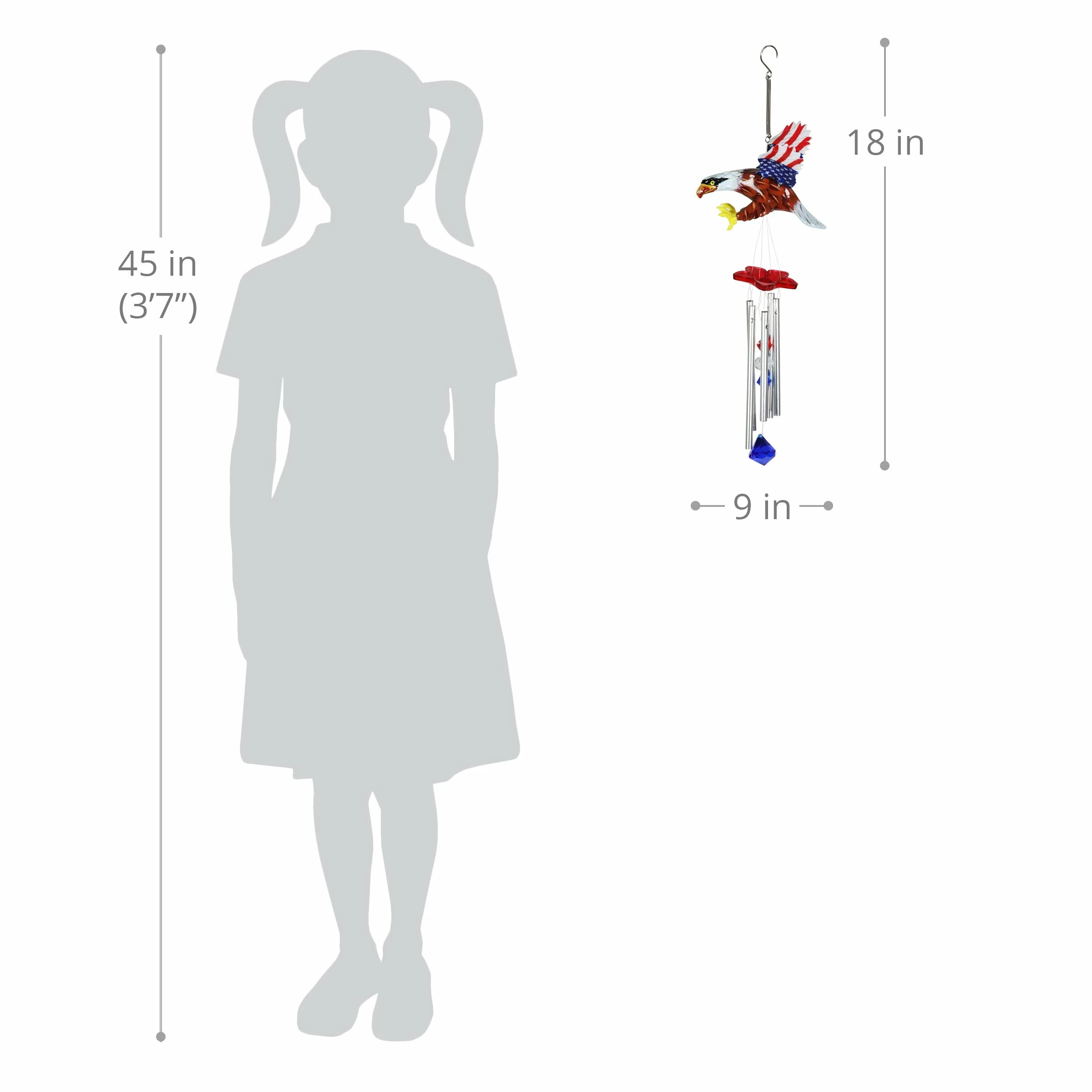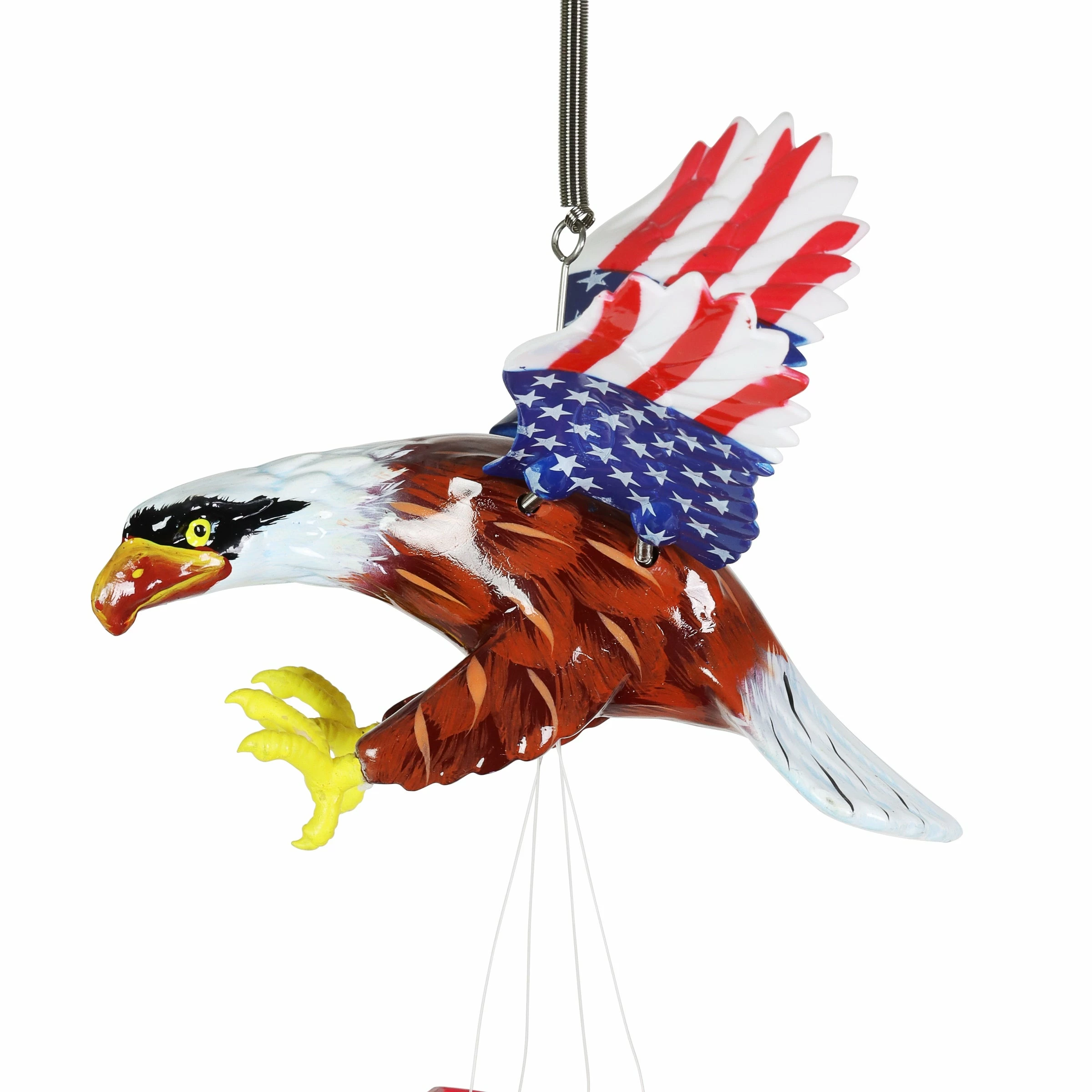 Enjoy the relaxing sounds of wind chimes as a gentle breeze passes through this beautifully hand painted Patriotic Eagle Wind Chime. The WindyWings will gently glide up and down simulating flight as the metal tuned chimes sing with delight! This charming wind chime adds a pop of patriotic pride with its stripes and stars design. Add color and sweet-sounding music to any home!