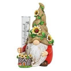 Fun meets function with this charming rain gauge garden gnome statue! Beautifully hand painted details include his flowered vine burlap hat with a lady bug, and a stone cottage base for the rain gauge. The easy-to-read glass rain gauge makes this piece of art not only adorable and fun but also practical. A wonderful addition to any garden and great gift for the whimsical at heart!