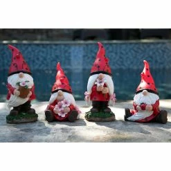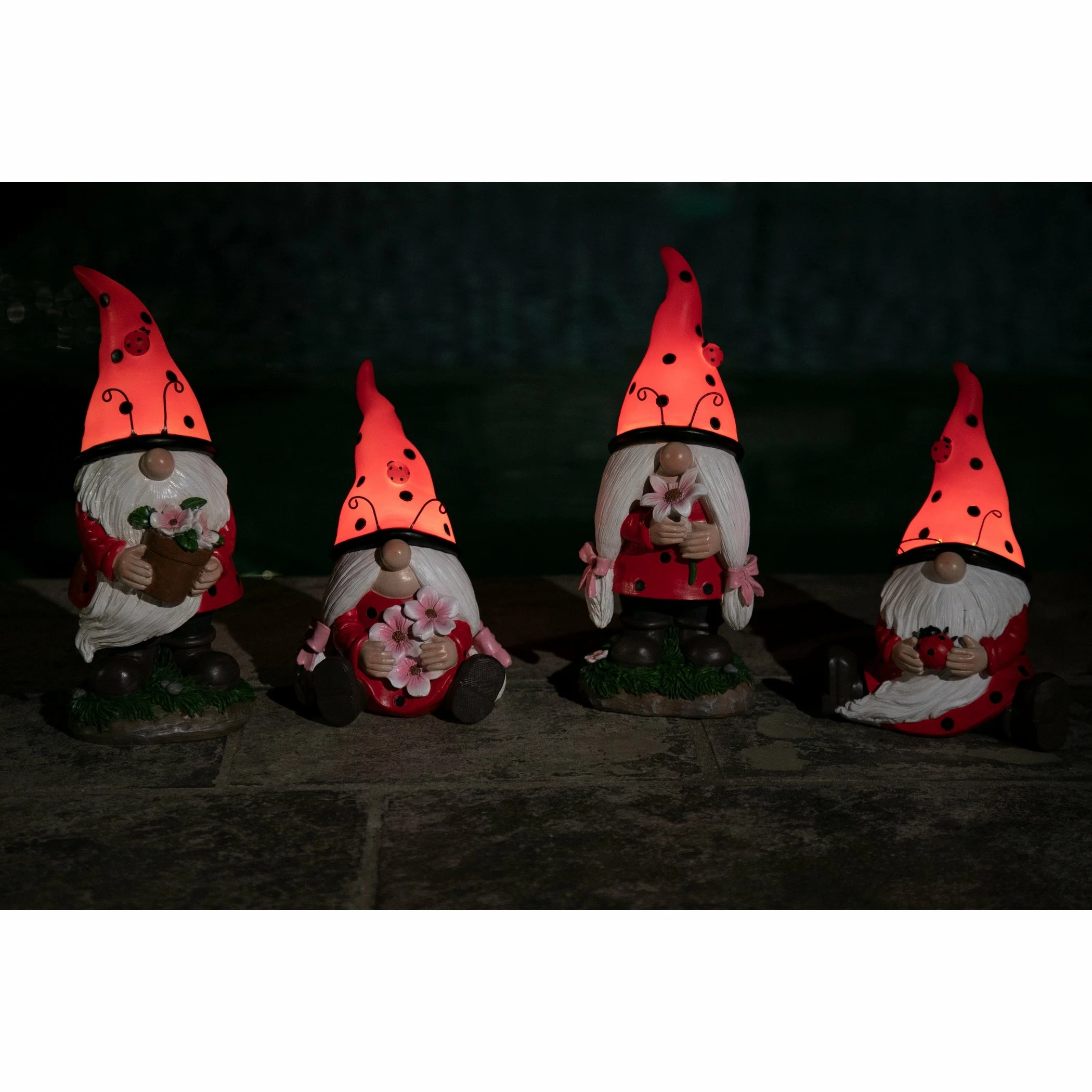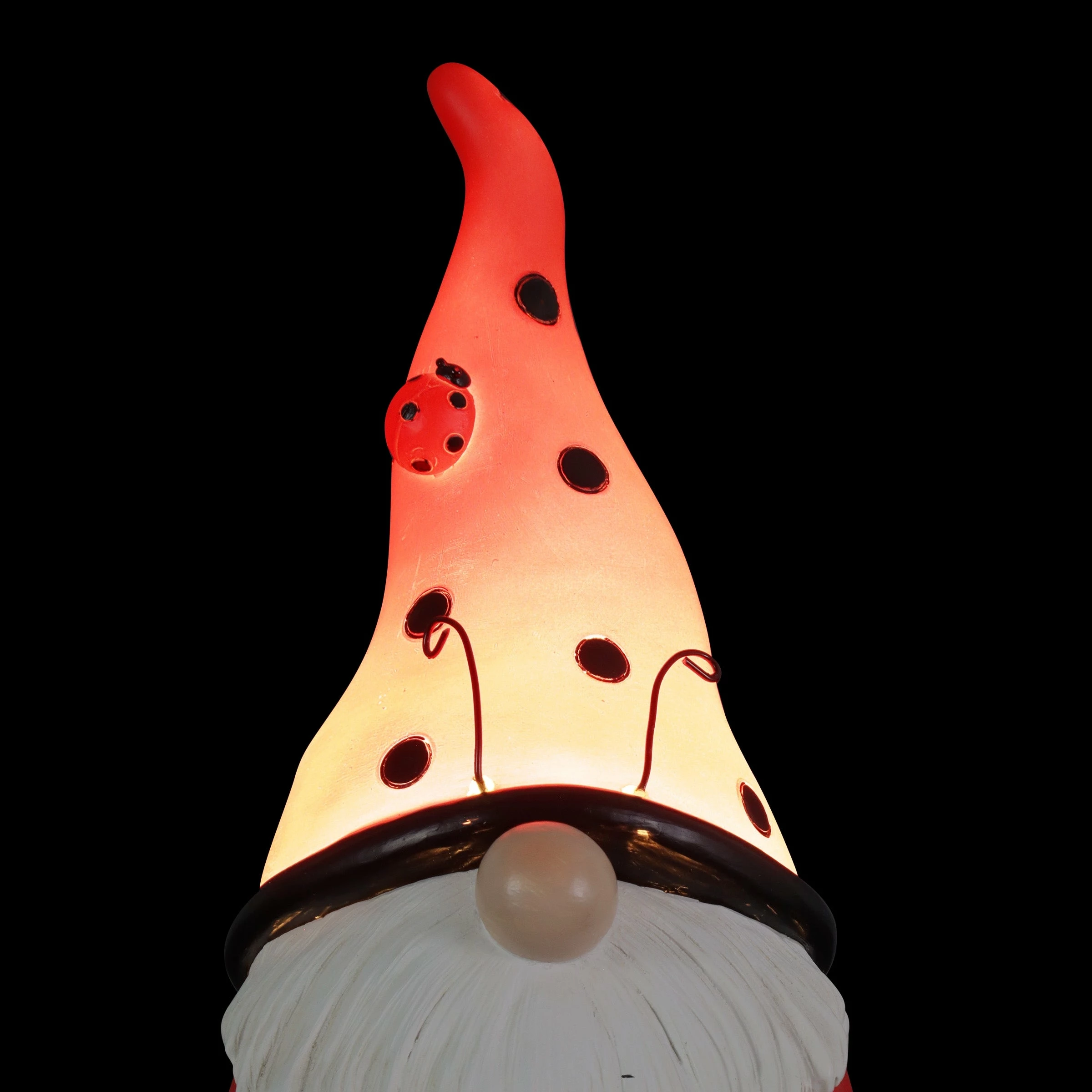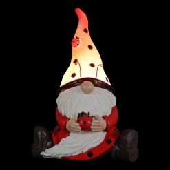- Solar powered LED light automatically illuminates the gnome’s hat at dusk