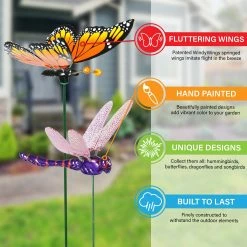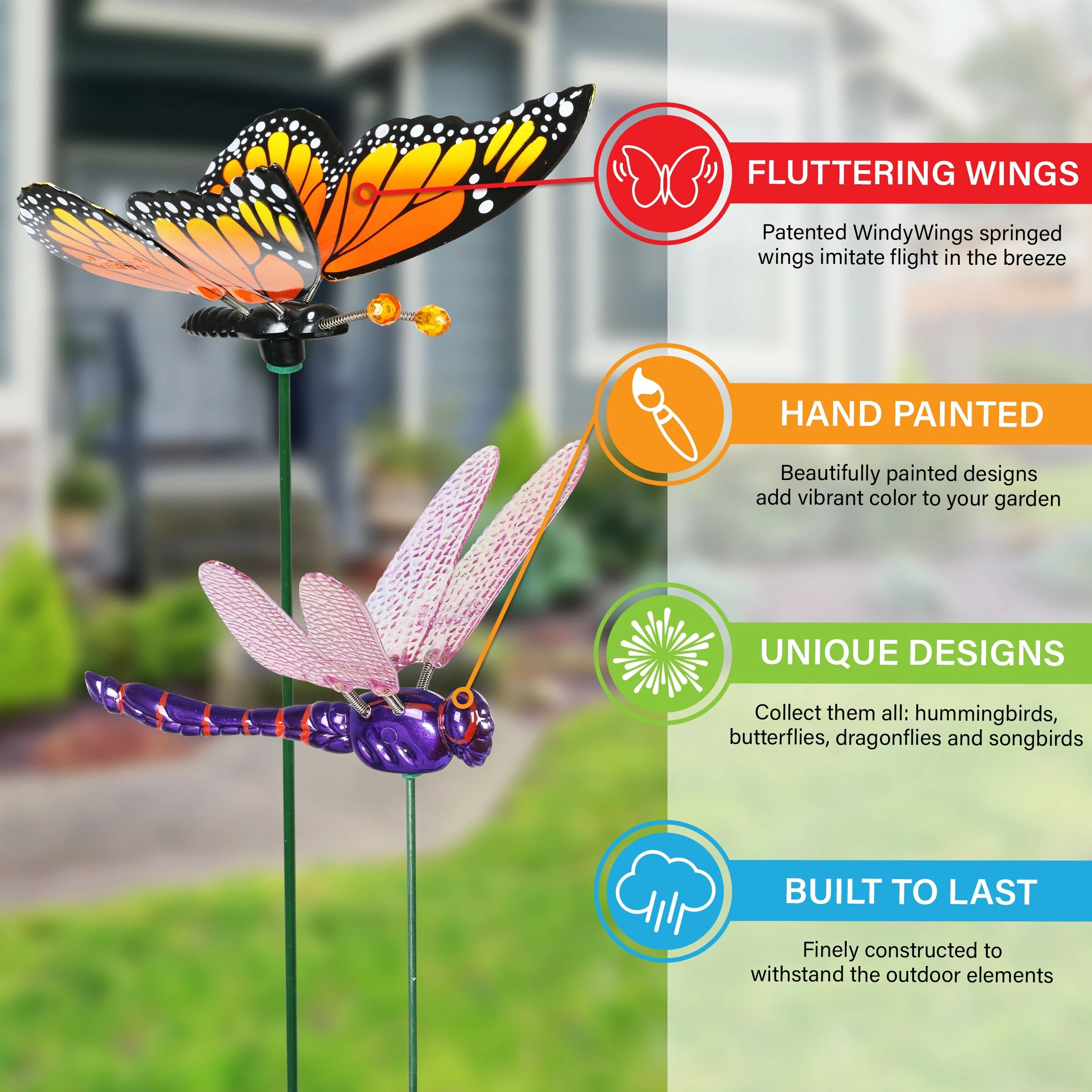 Enjoy the beauty and movement of hand painted garden stakes in delightfully designed birds, flying insects, and butterflies. As a gentle breeze passes through, the WindyWings will flutter up and down simulating flight. Makes a charming addition to any home and a wonderful gift for the nature enthusiast!