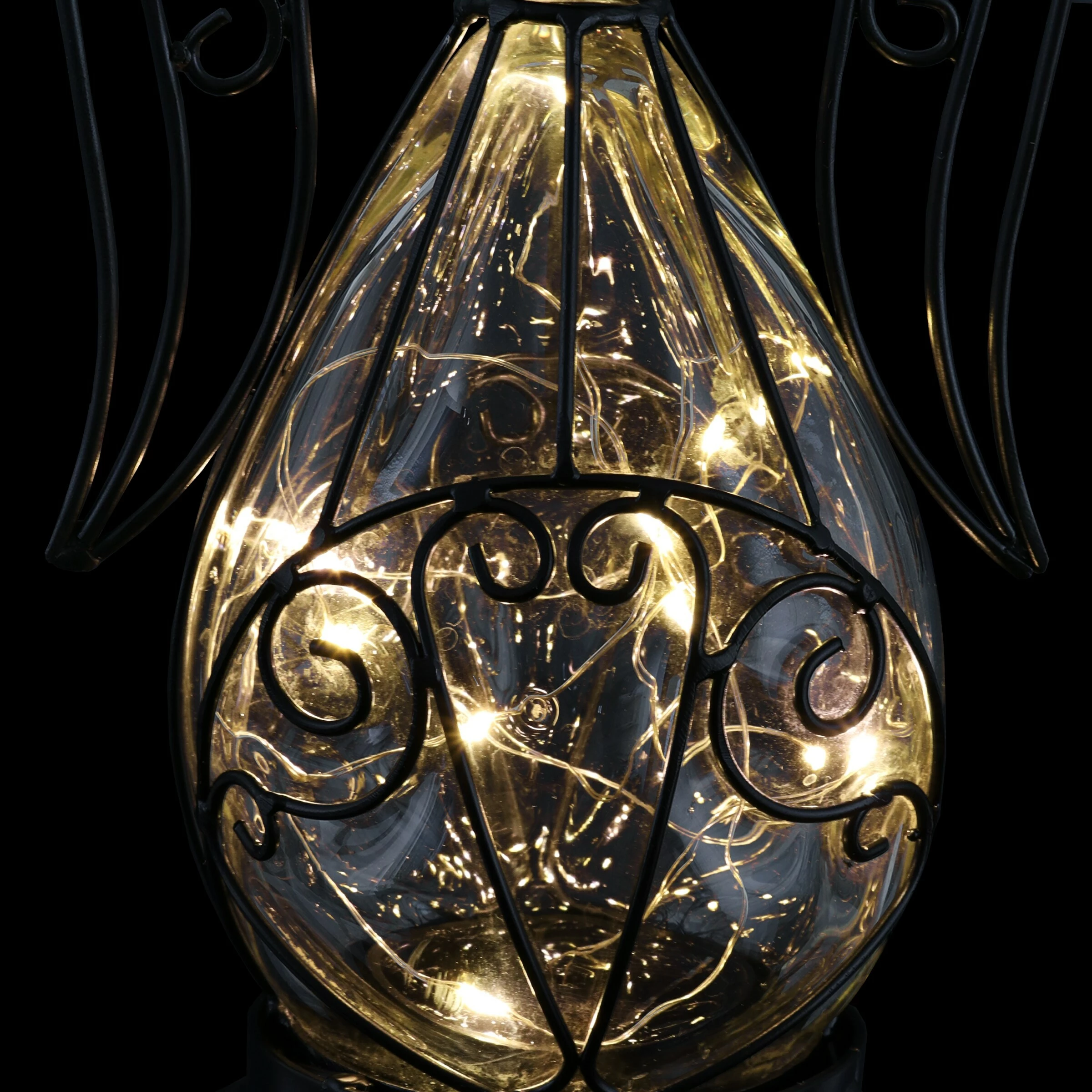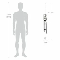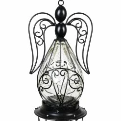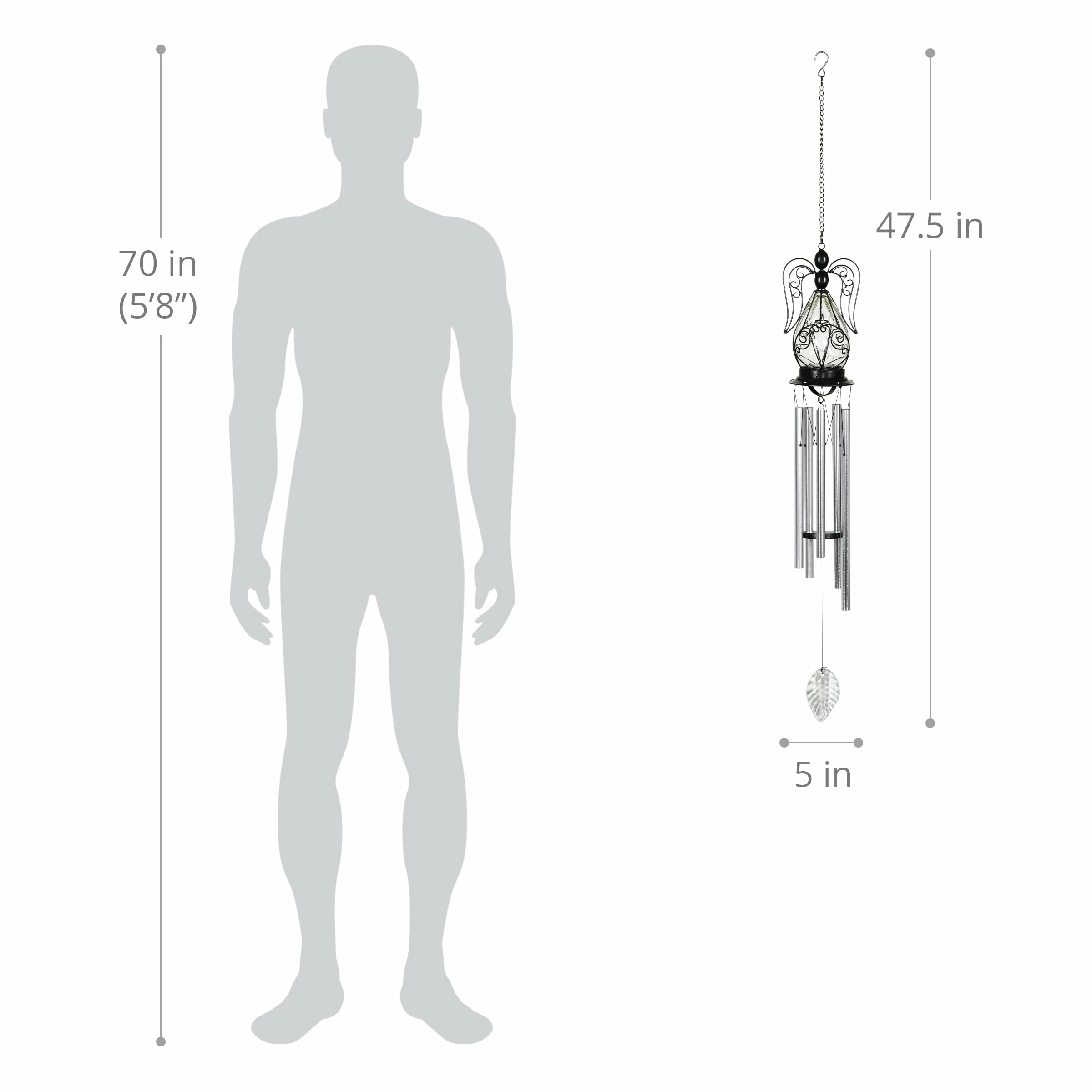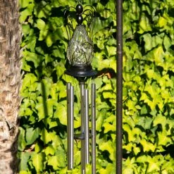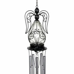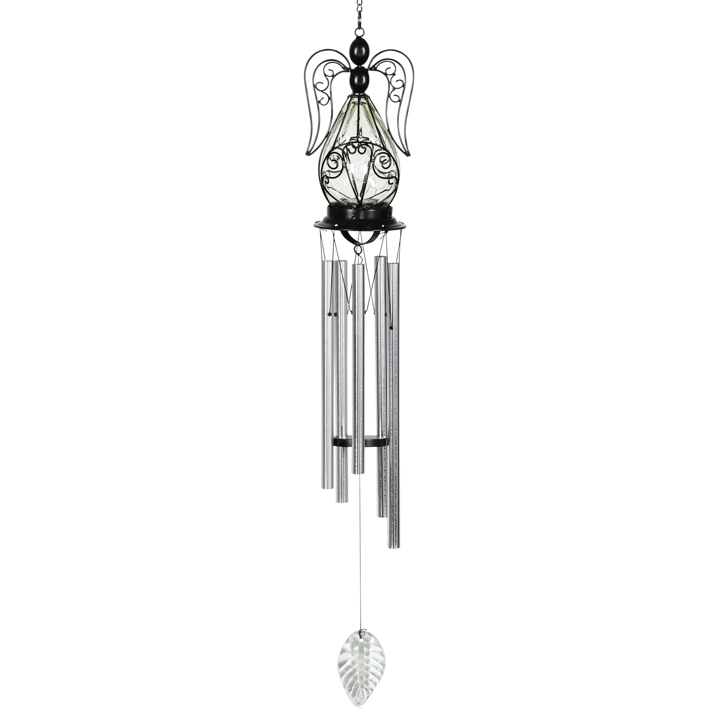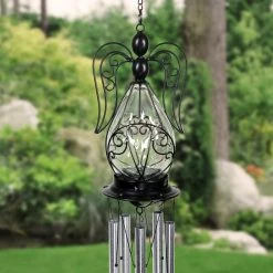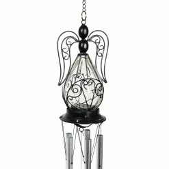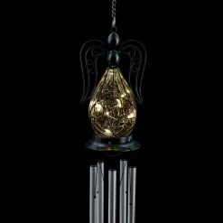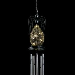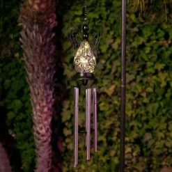 Enjoy the relaxing sounds and warm light of this heavenly solar angel wind chime. A gentle breeze will begin the music of the charms while the solar-powered LED will automatically illuminate at dusk, adding a magical glow to your garden. This beautiful glass and metal angel is a wonderful reminder that you are loved and protected.
