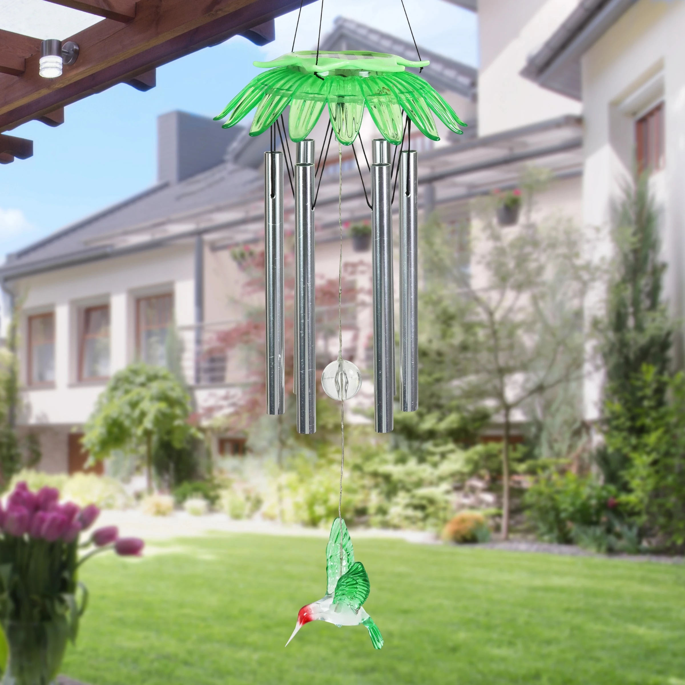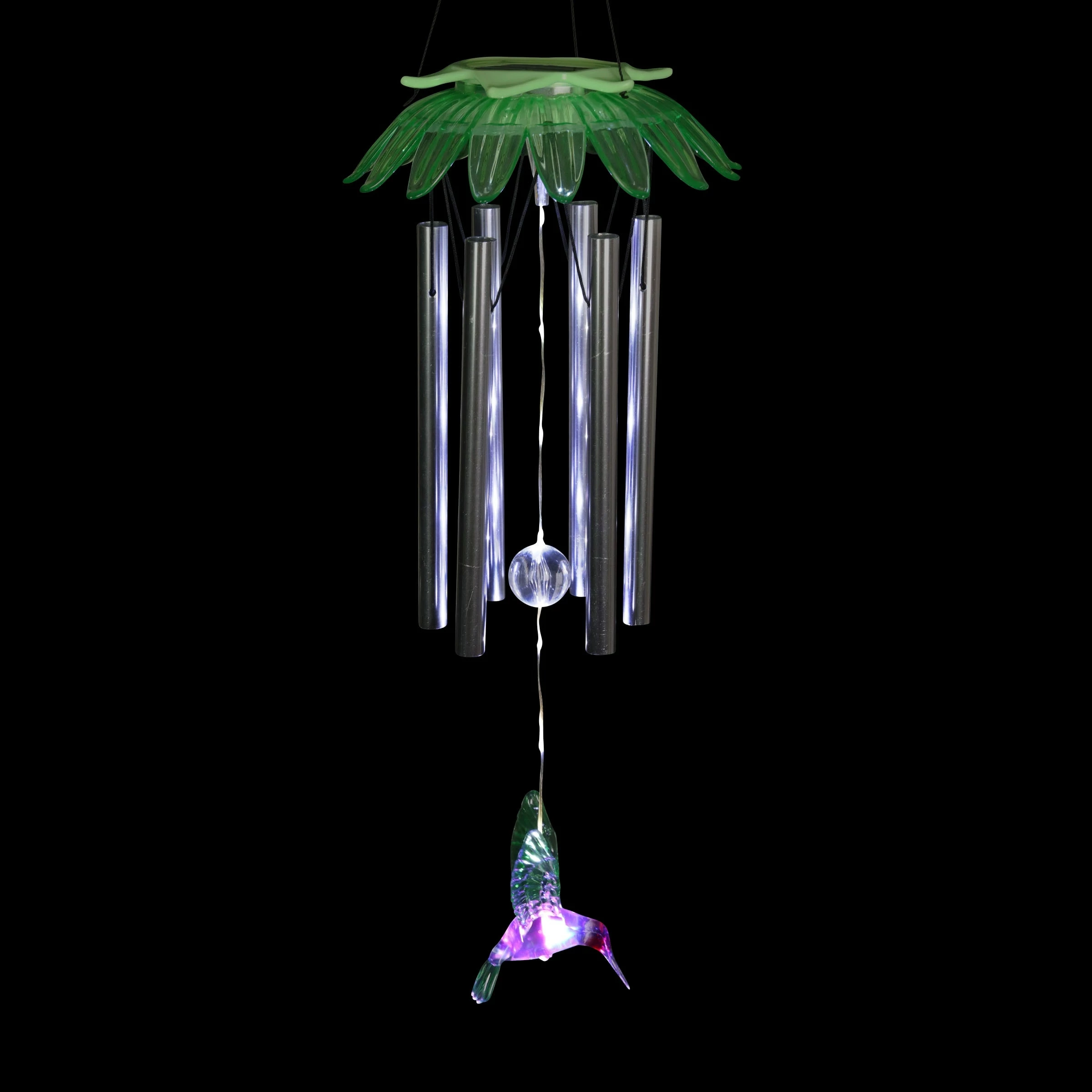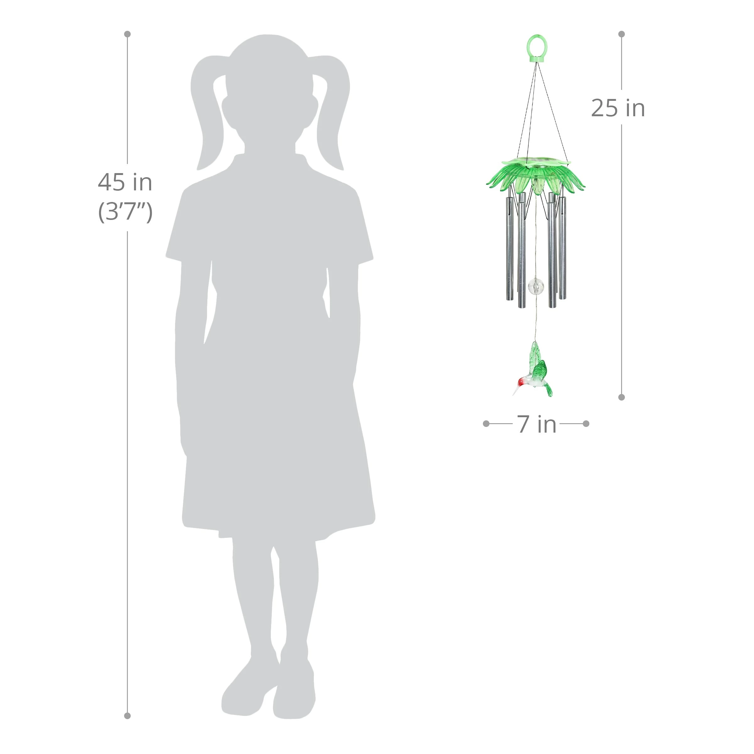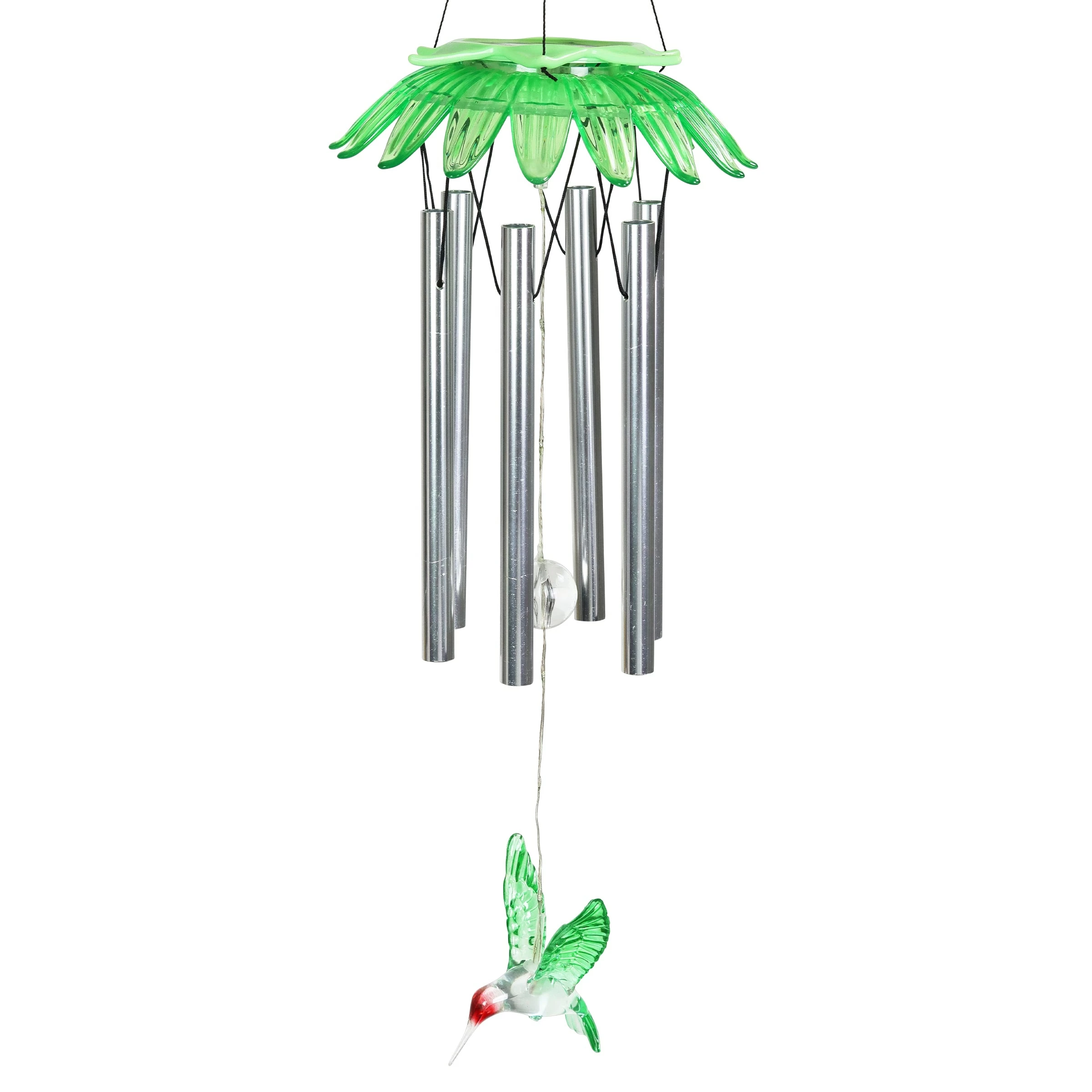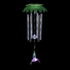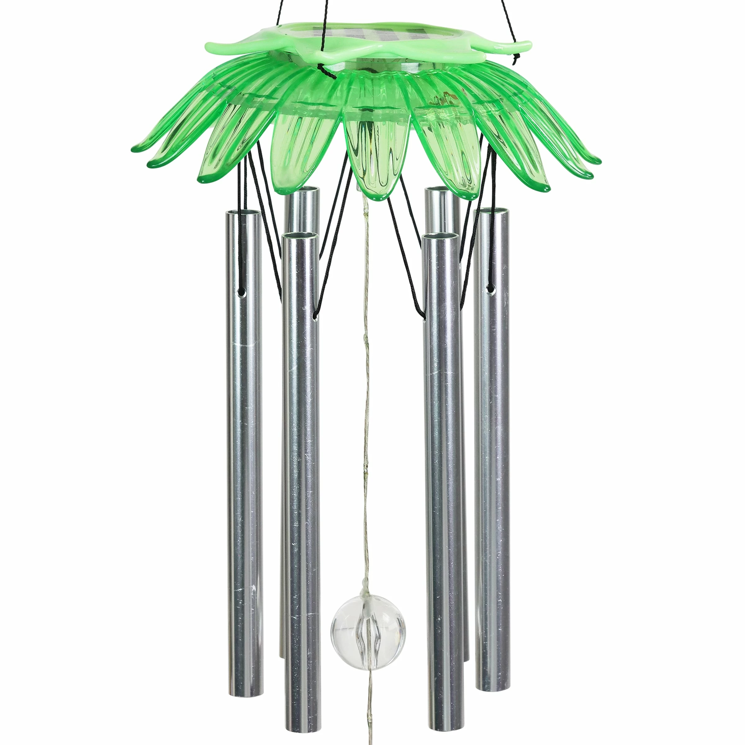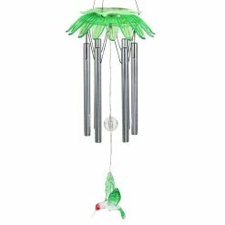 Enjoy the relaxing sounds of hand tuned metal chimes as a gentle breeze passes through this beautiful Solar Green Flower Wind Chime. As dusk sets in, your Solar Angel will automatically illuminate in your garden! Makes a cherished gift and a wonderful addition to your home, patio or garden! This charming wind chime adds a pop of color and sweet-sounding music to any home!