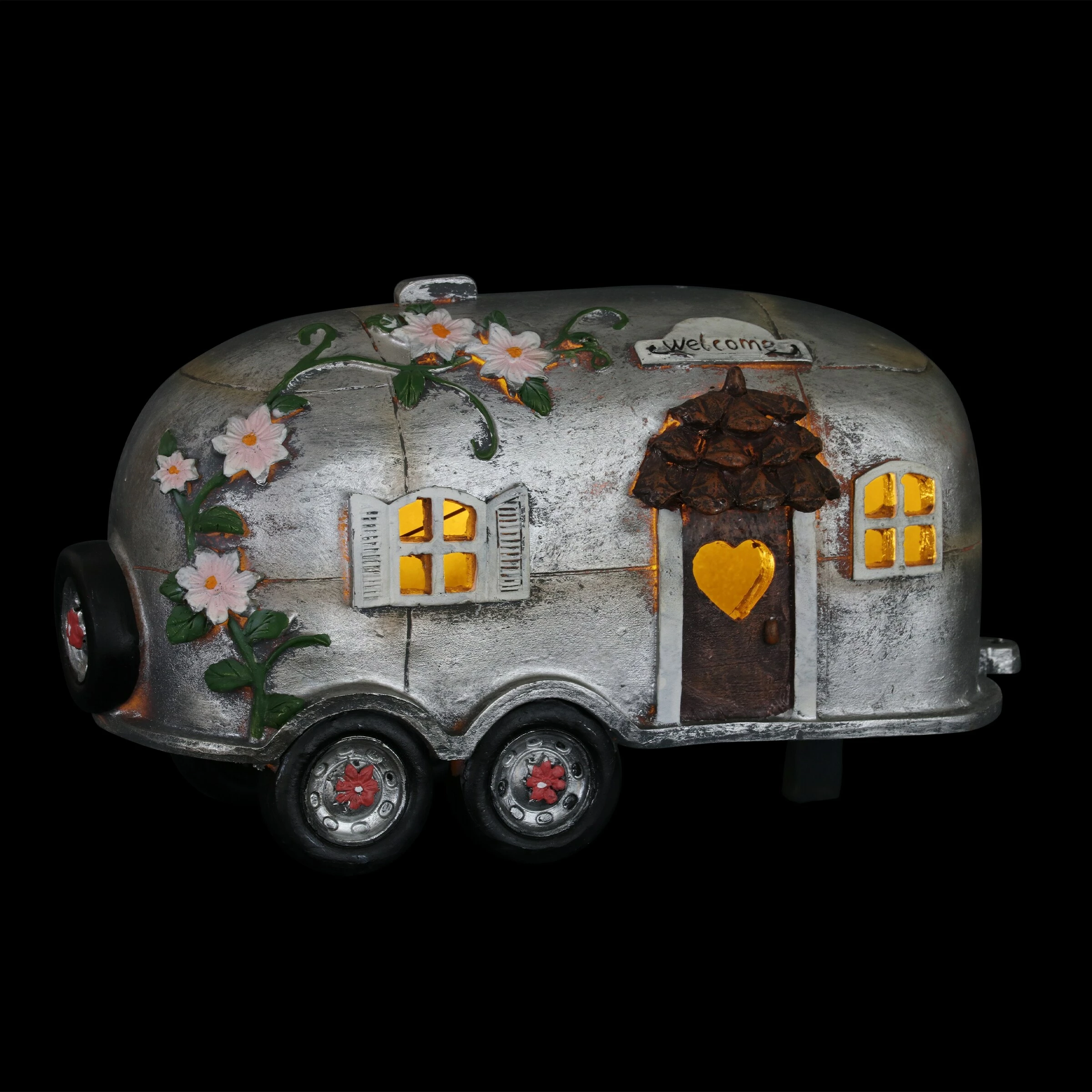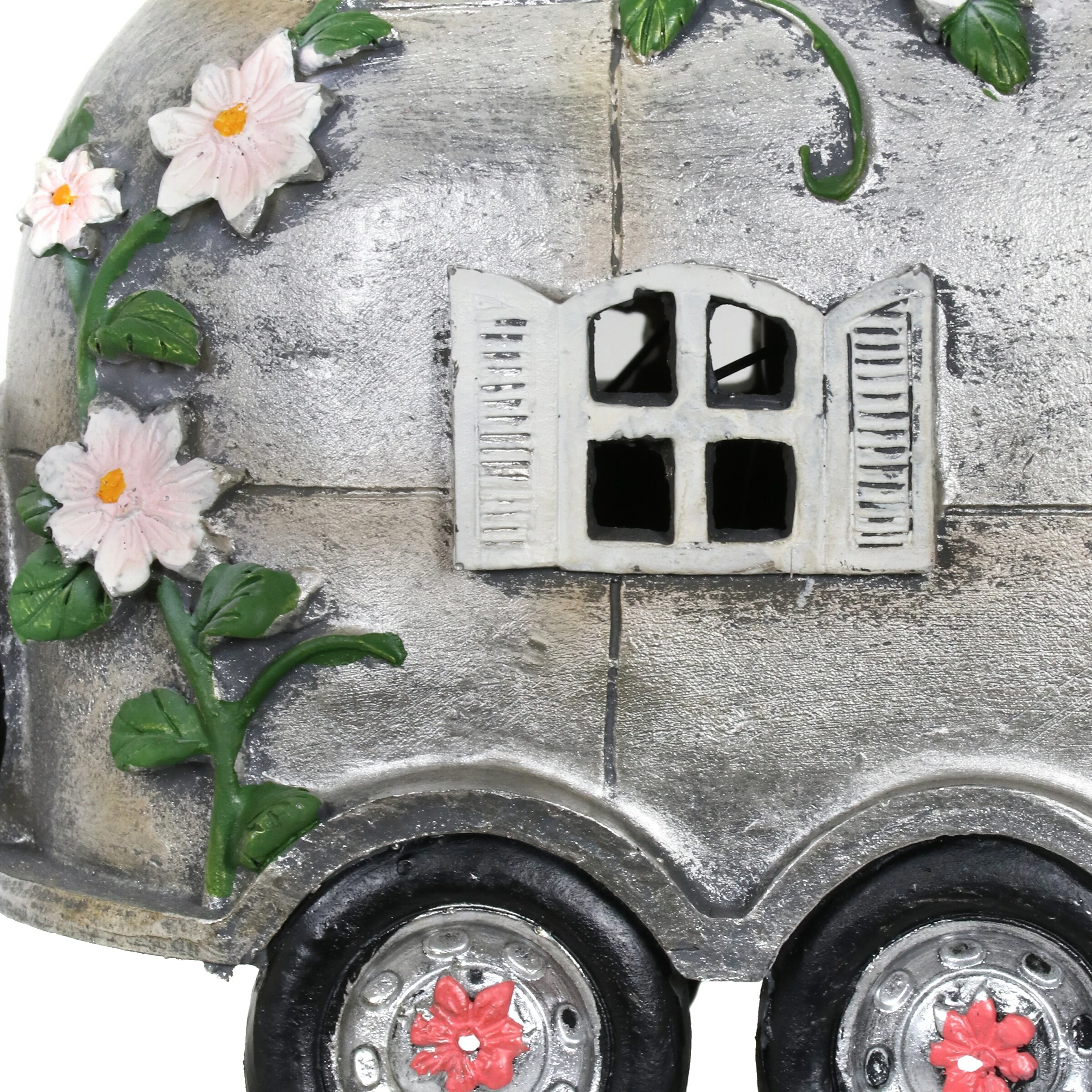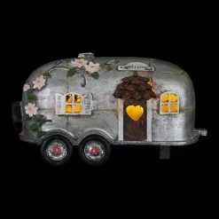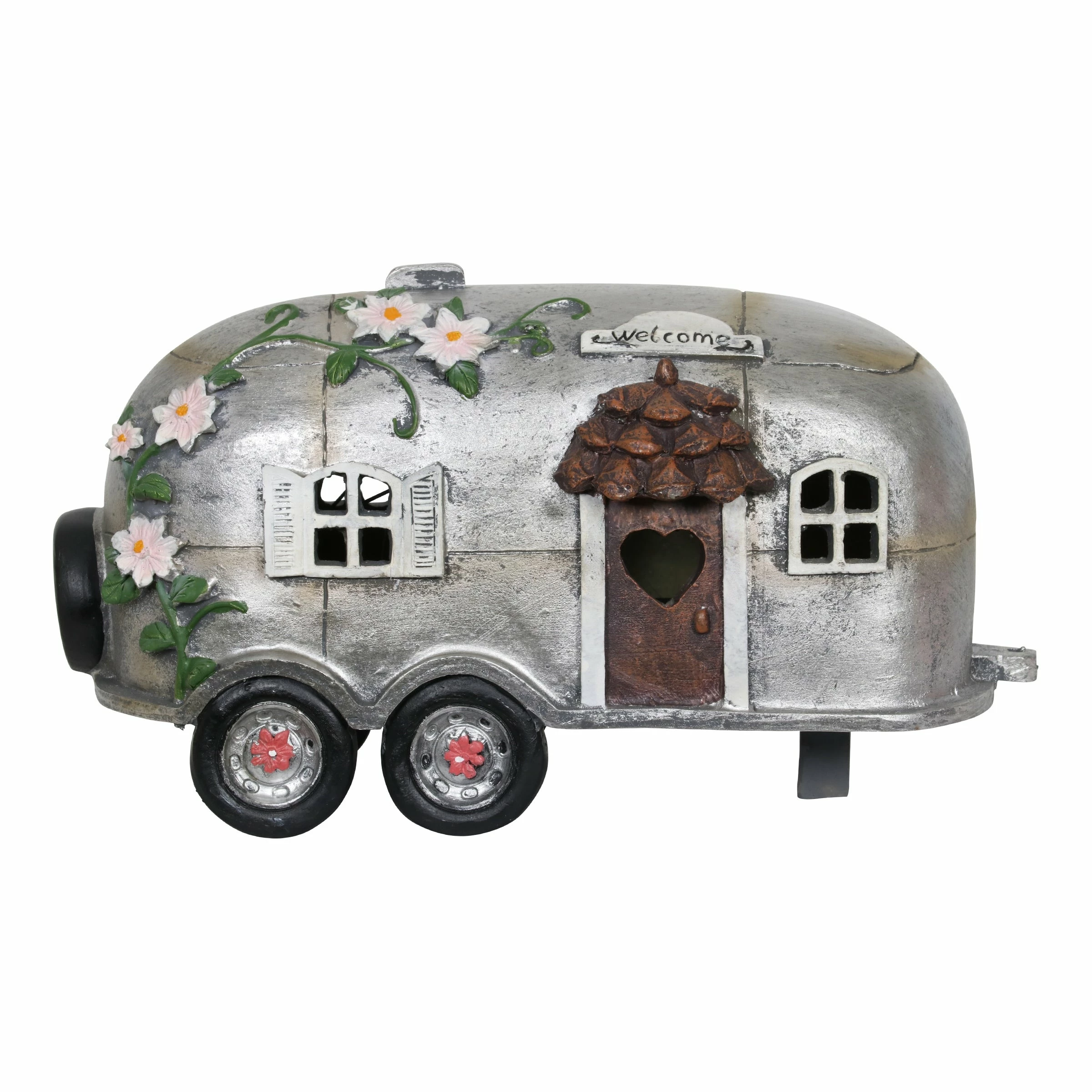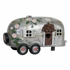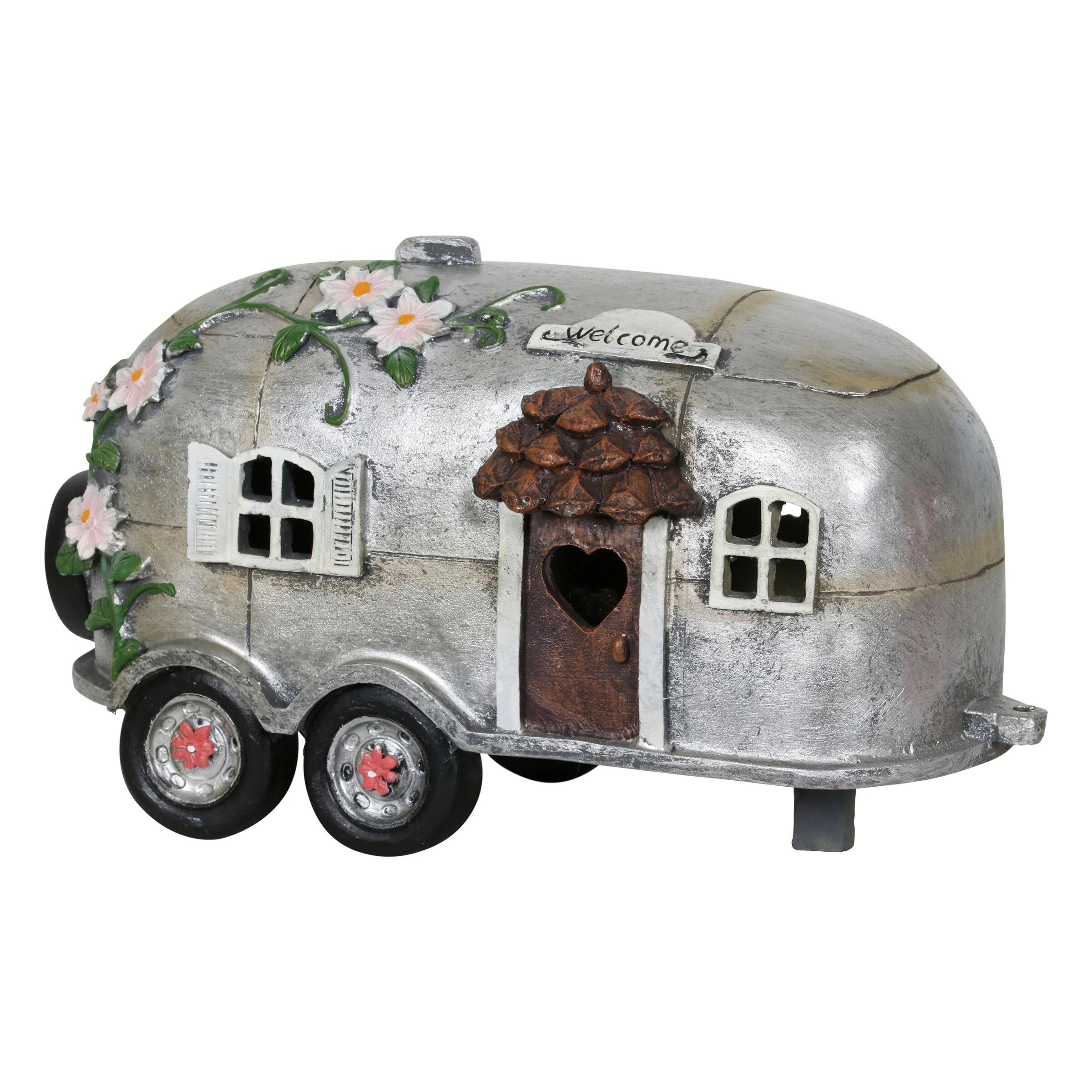 A flower adorned solar silver camping trailer for fairies on the go! Solar-powered LED lights will automatically illuminate this adorable camper at dusk. Hand painted with beautifully detailed windows, wheels, and front door, this adorable camper adds instant charm to your garden.