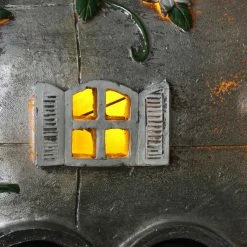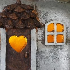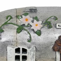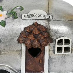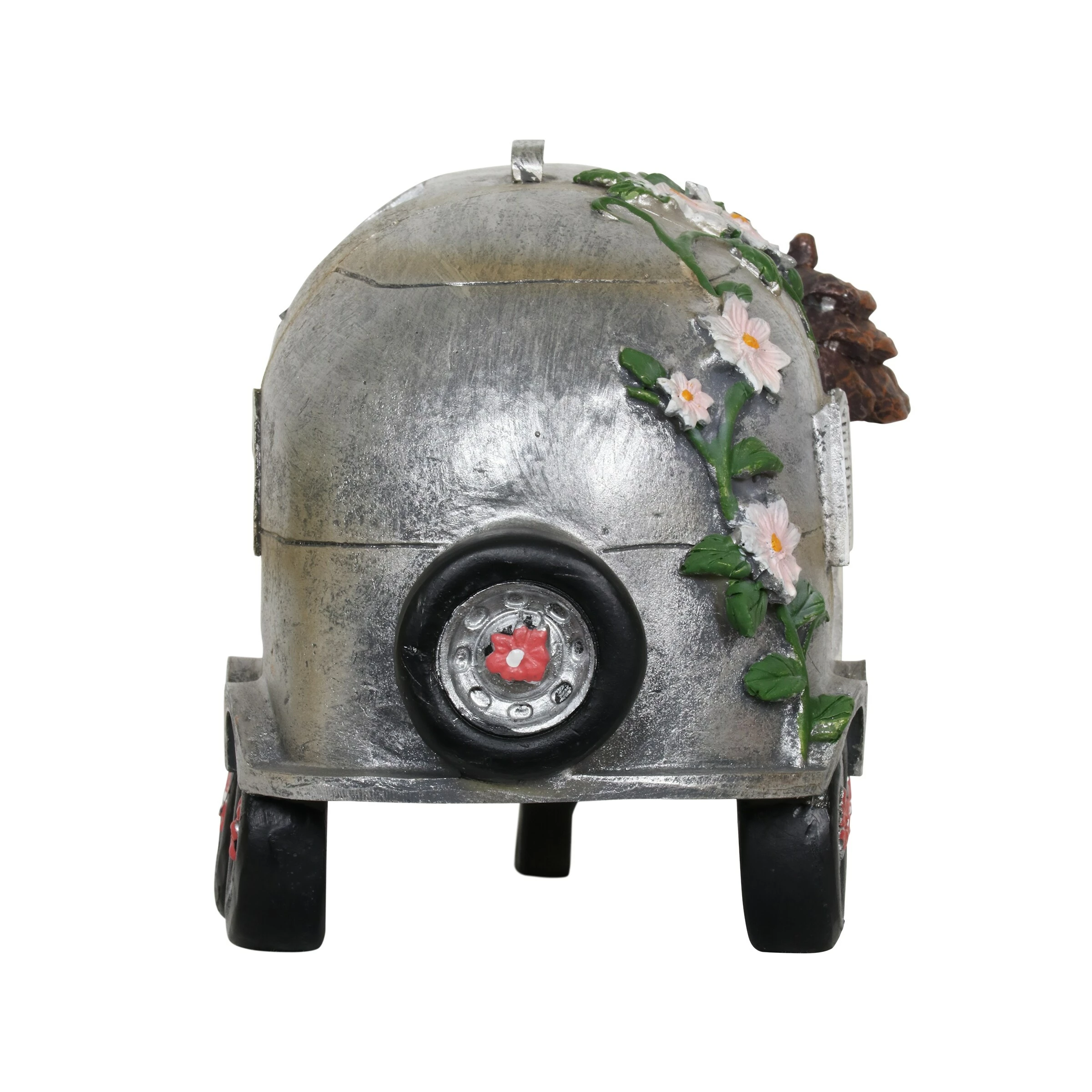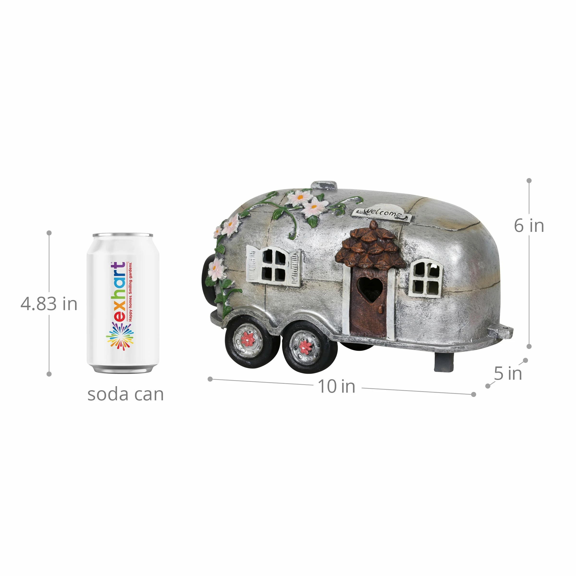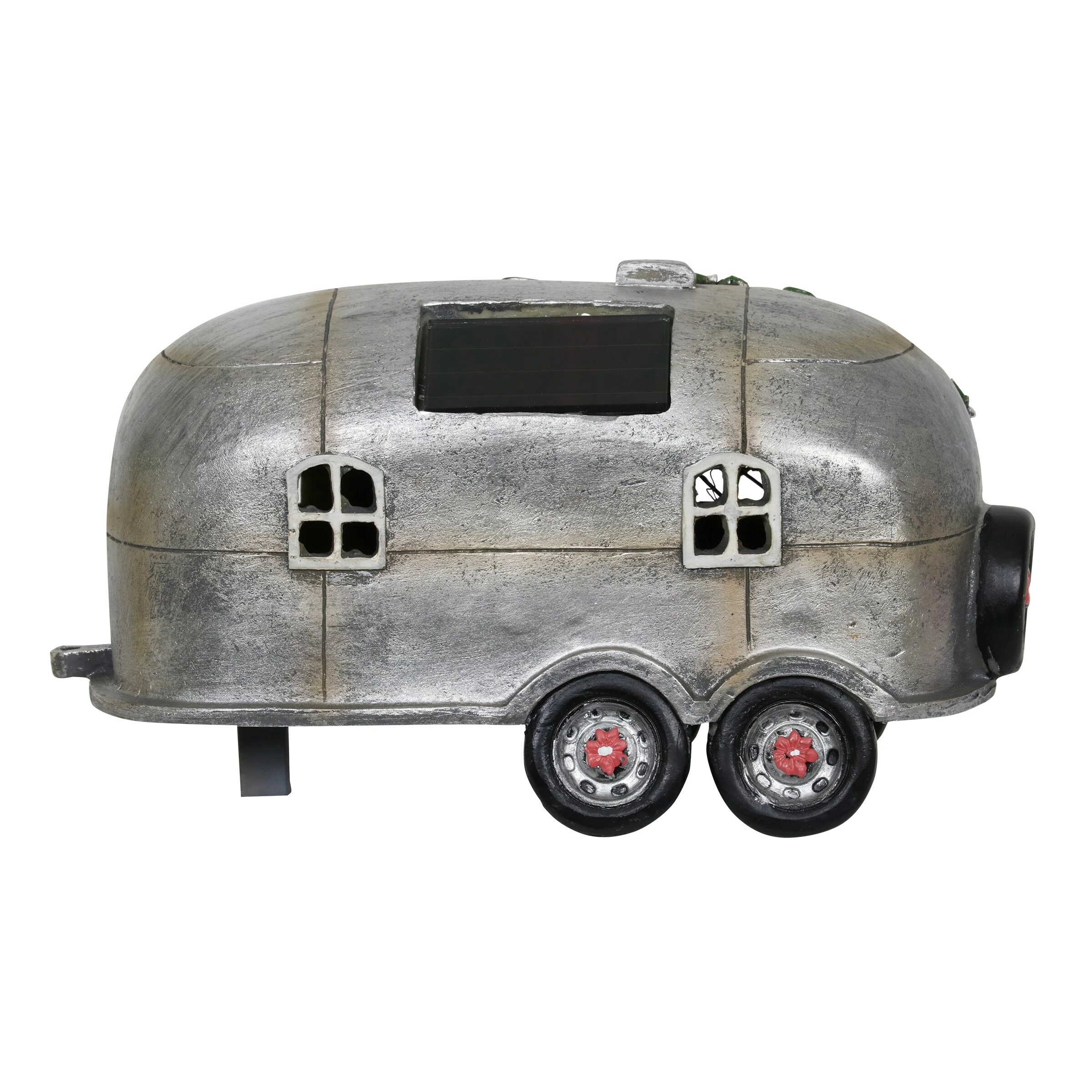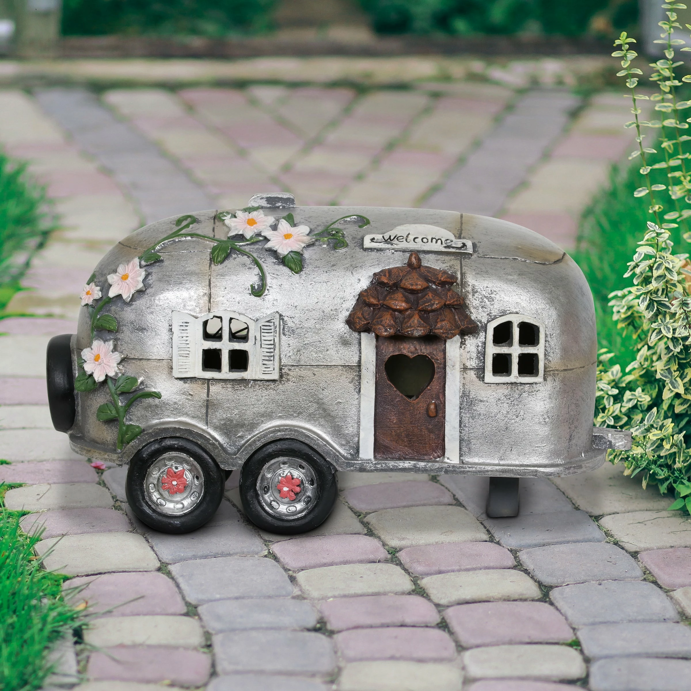 A flower adorned solar silver camping trailer for fairies on the go! Solar-powered LED lights will automatically illuminate this adorable camper at dusk. Hand painted with beautifully detailed windows, wheels, and front door, this adorable camper adds instant charm to your garden.