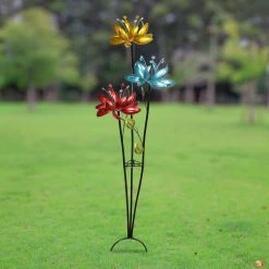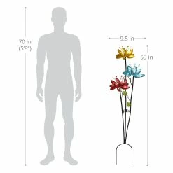 Three spinning tropical flowers add a burst of color and movement to your garden! This triple kinetic flower spinner breathes beauty and life into your garden effortlessly. All it needs is just a simple breeze to start the show and set each of the three flowers into motion. This piece of art is crafted in metal, beautifully hand-painted in metallic metallic colors and then UV treated to resist fading. Makes a wonderful addition to your home and a great gift for the garden enthusiast.