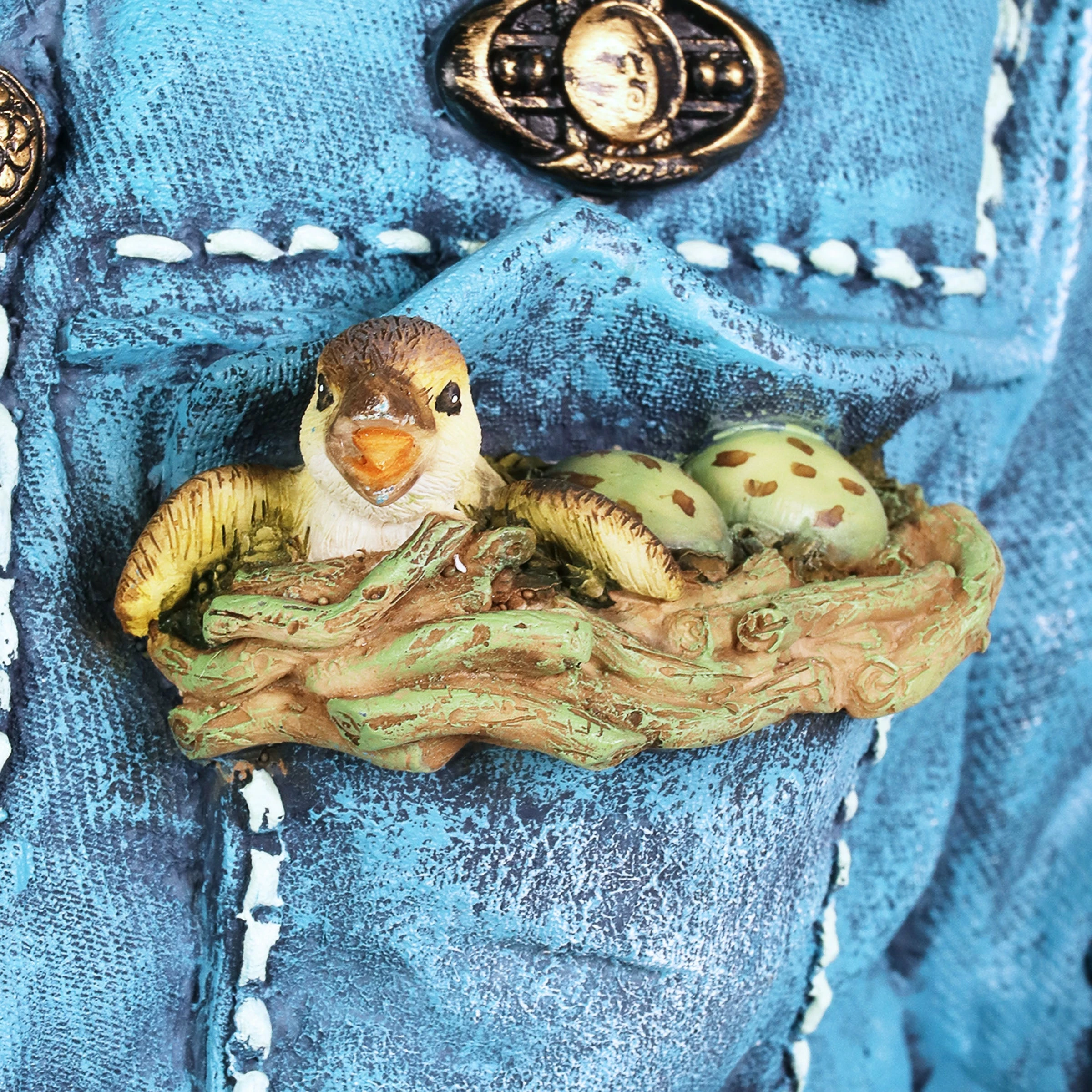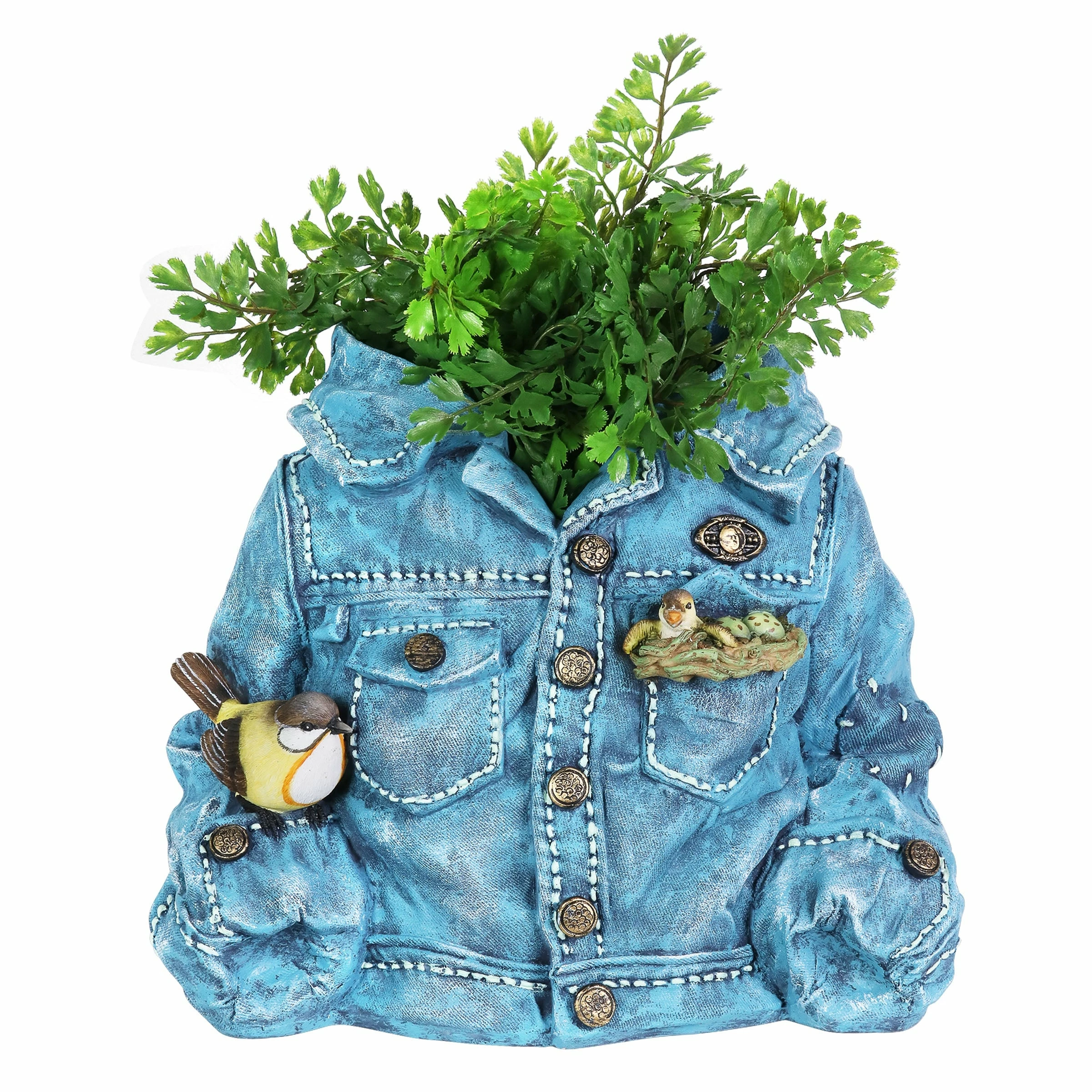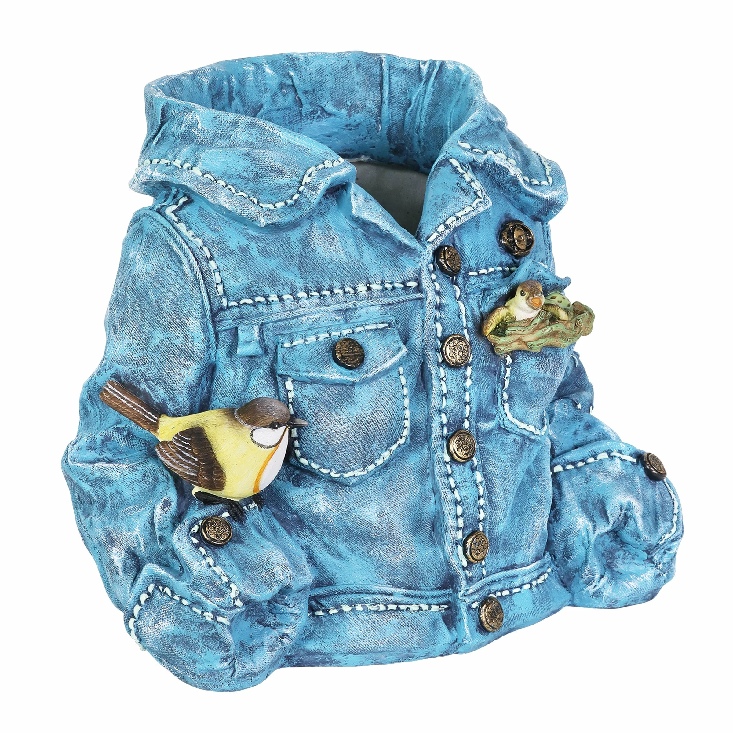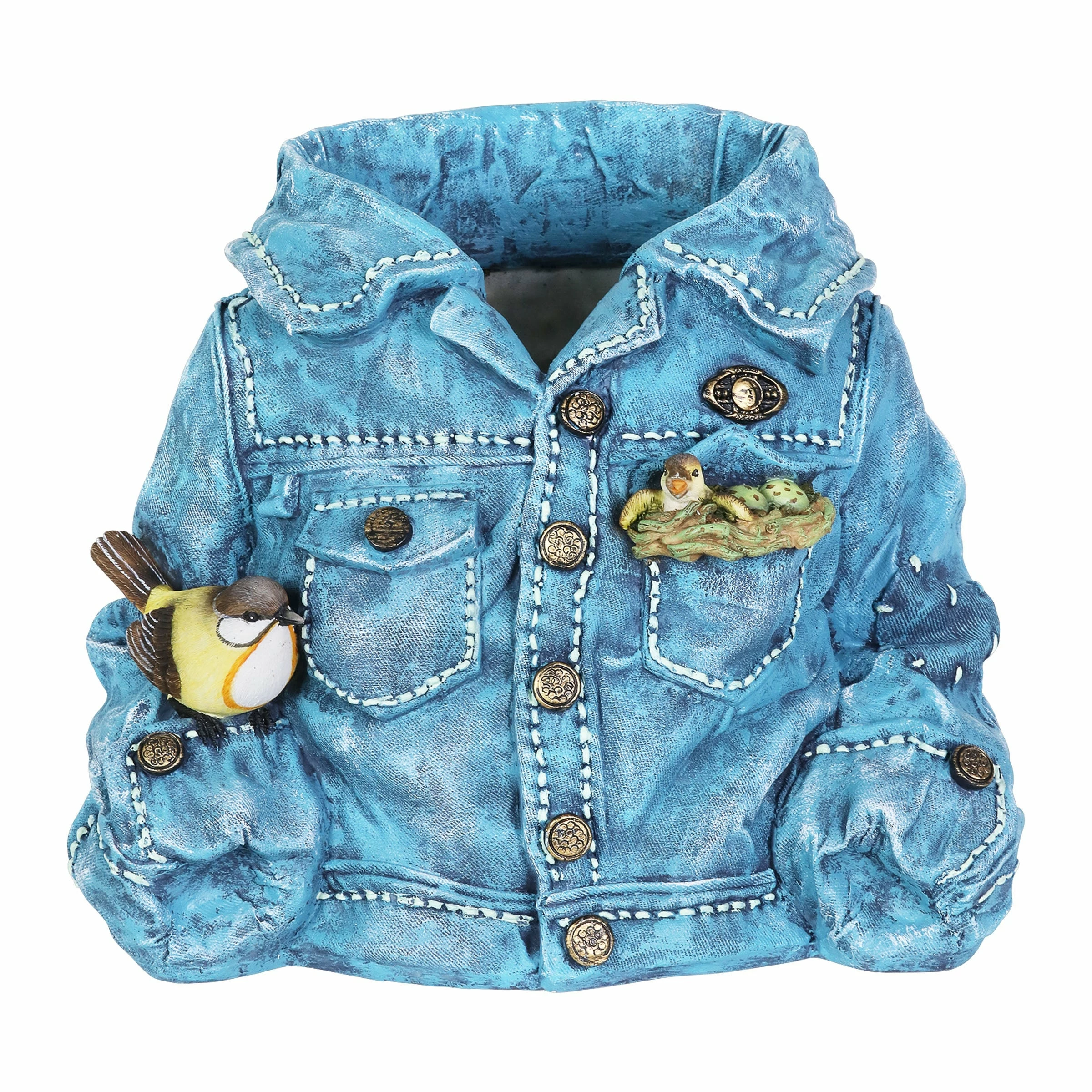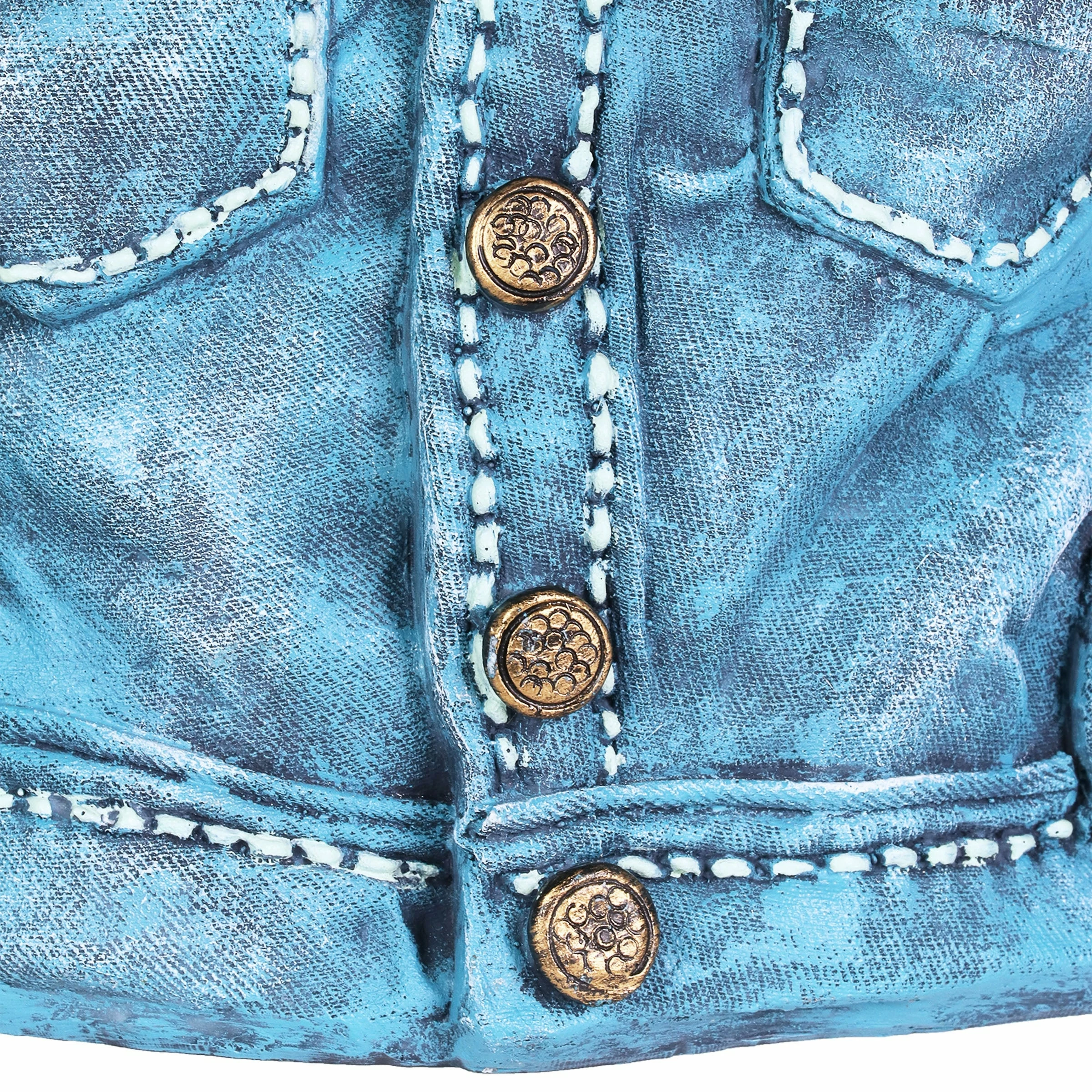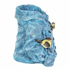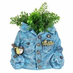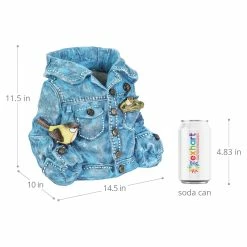 This adorable denim jacket planter evokes that familiar feeling when you put on your favorite worn-in comfort blues! It just feels like home. Simply add your choice of plant, herb or flower for a personal touch. You’ll enjoy this beautifully hand painted planter for years to come.