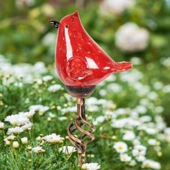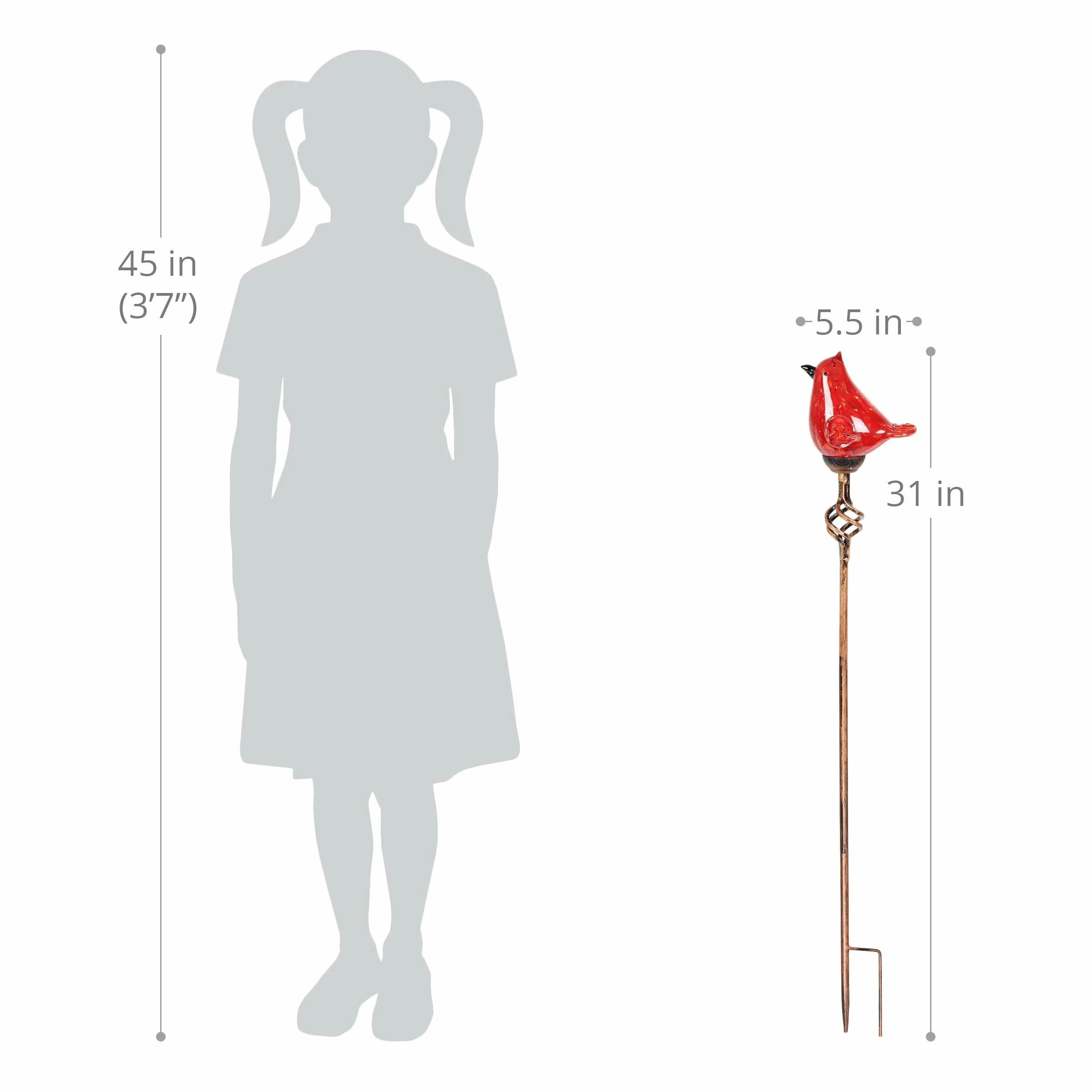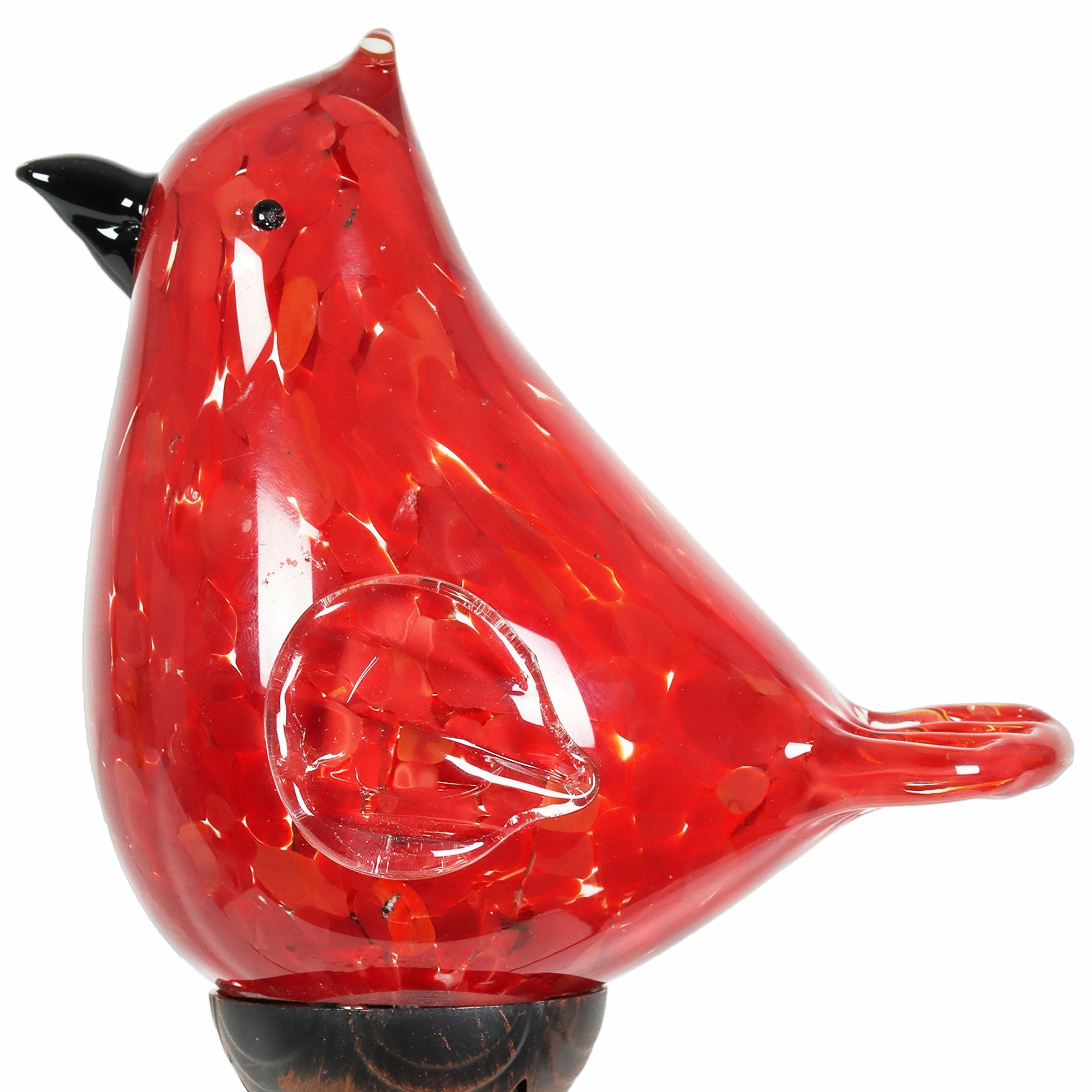 This exquisite Solar Red Cardinal Garden Stake adds gorgeous color and life to your garden day and night. As the sun sets and dusk settles in, the beautiful hand blown glass design will glow from within. The spiraling metal finial adds an extra touch of elegance to your landscape. Representing love and devotion, the red cardinal makes a thoughtful gift and a charming addition to your home.