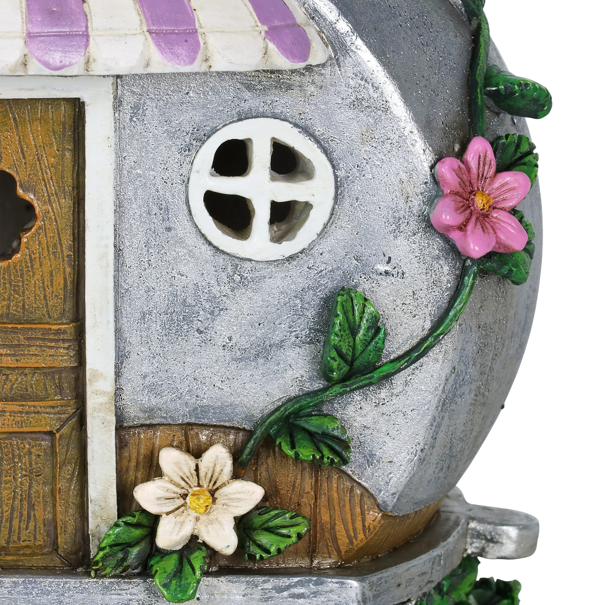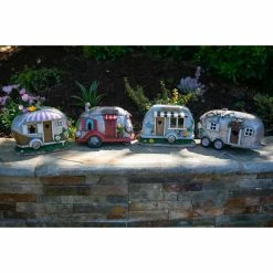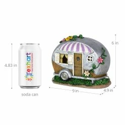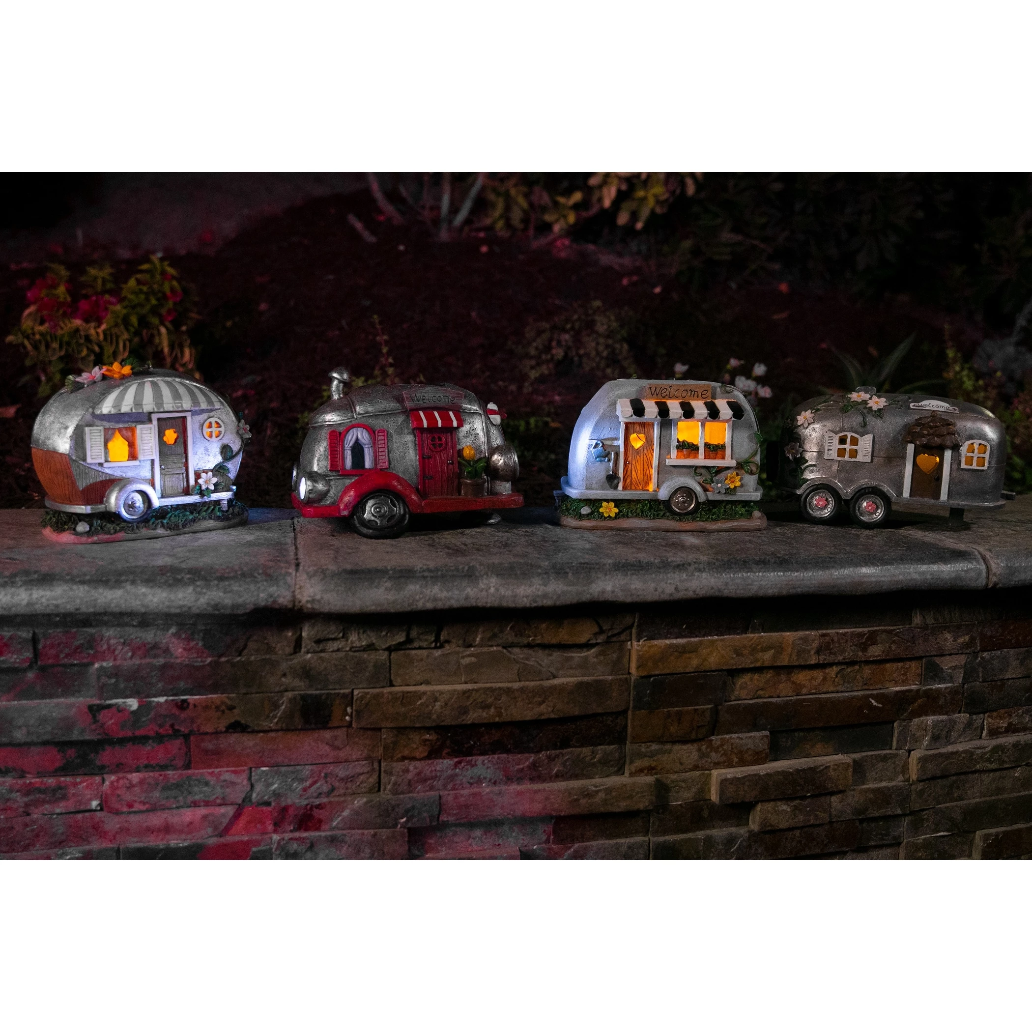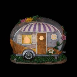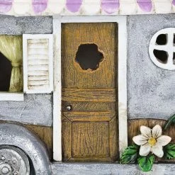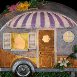 Cruise down memory lane in this charming Solar Silver Retro Camper Garden Statue! With its wooden looking door and side panels, creeping flower vines, lavender striped awning and many other beautifully hand painted details, this solar lit statue brings a sense of fun and nostalgic charm to your garden! The solar powered light will automatically illuminate at dusk from within the camper, adding even more fun in the evenings. This garden art is sure to warm your heart and add a touch of charm to your garden day or night!