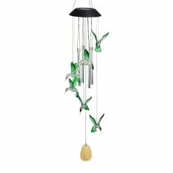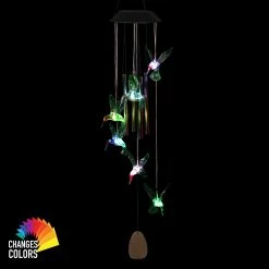 Relaxing chimes and color changing cascading hummingbirds make this exquisite wind chime a feast for the senses! The hand tuned metal chimes will sing in the breeze. Solar powered color-changing LED lights will charge during the day and automatically illuminate at dusk, adding color, light and charm to your home! Makes a wonderful addition to your patio, yard or garden and an impressive gift for the garden enthusiast!