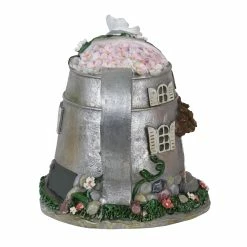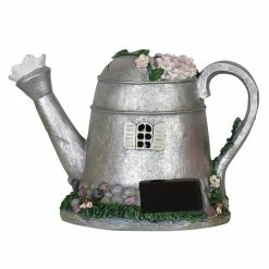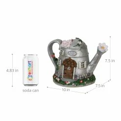 A fairy tale solar tea pot is transformed into an endearing fairy house complete with realistic wooden door, shutters, and flower details! This charming tea pot will illuminate from within at dusk every evening, sparking intrigue and delight. With a built-in energy efficient solar panel, this garden statue will charge during the day and automatically glow at dusk. Adds a perfect touch of whimsy to any outdoor space! An adorable addition to your home or garden that is sure to captivate your heart and add wonder to your garden!