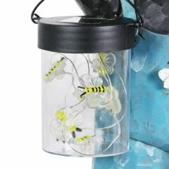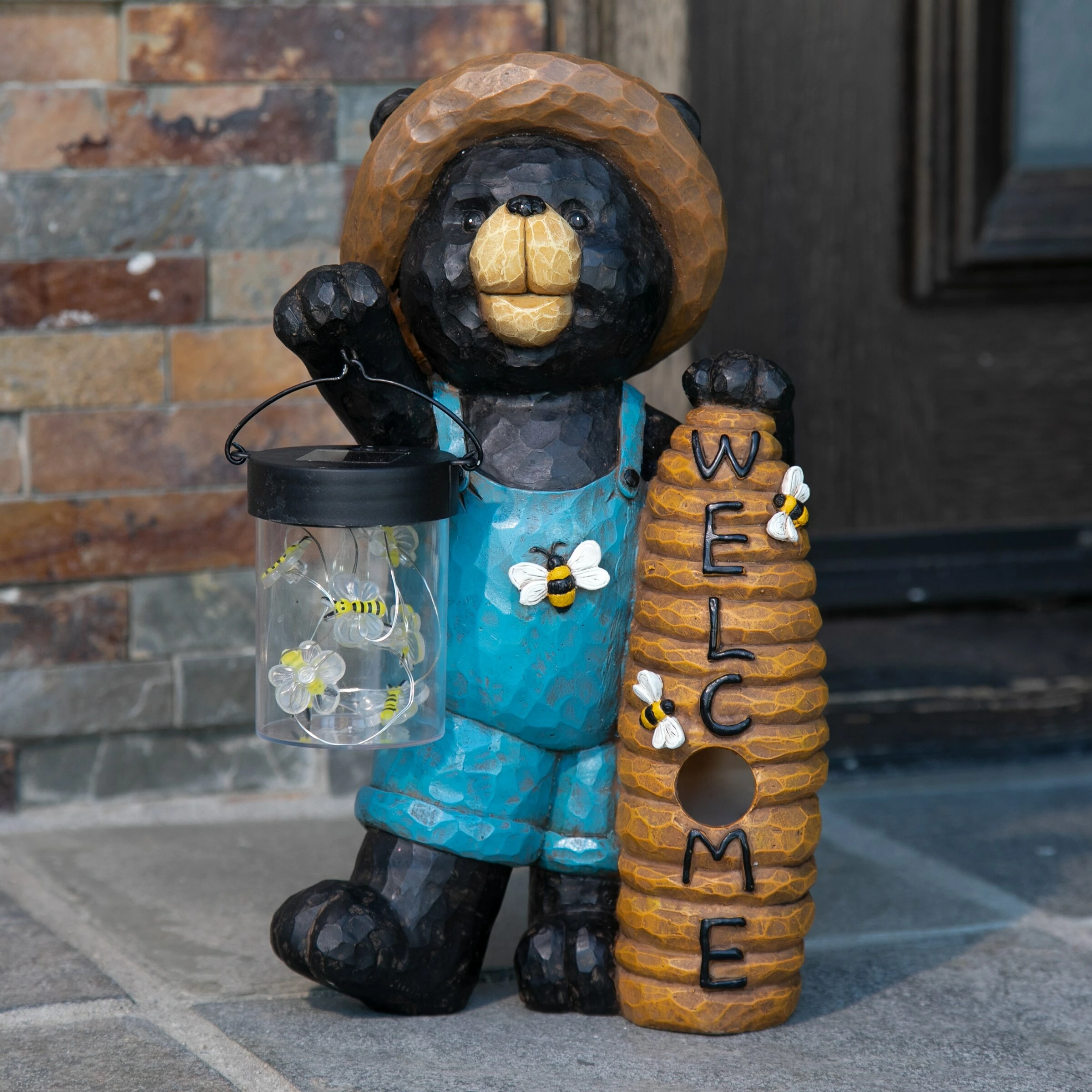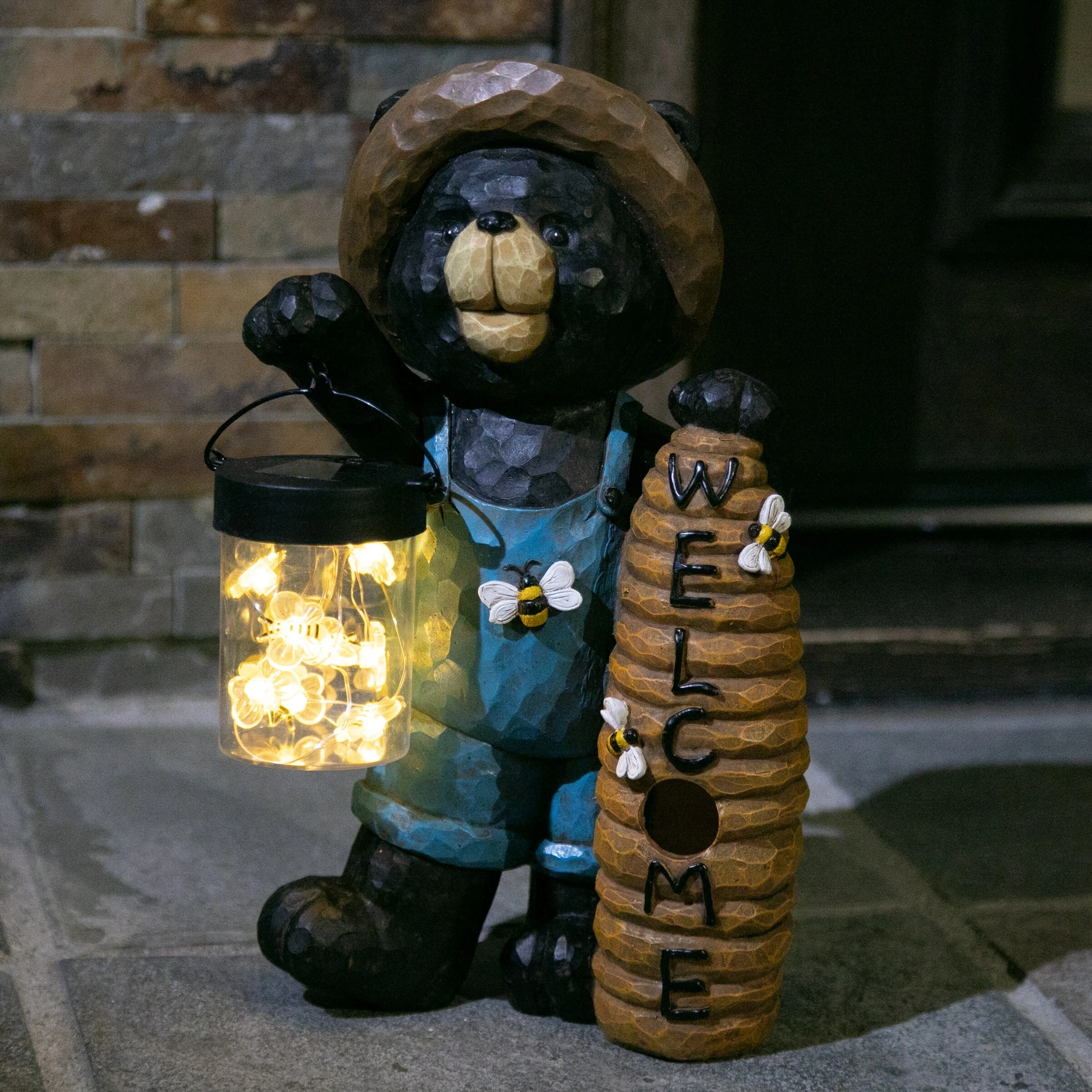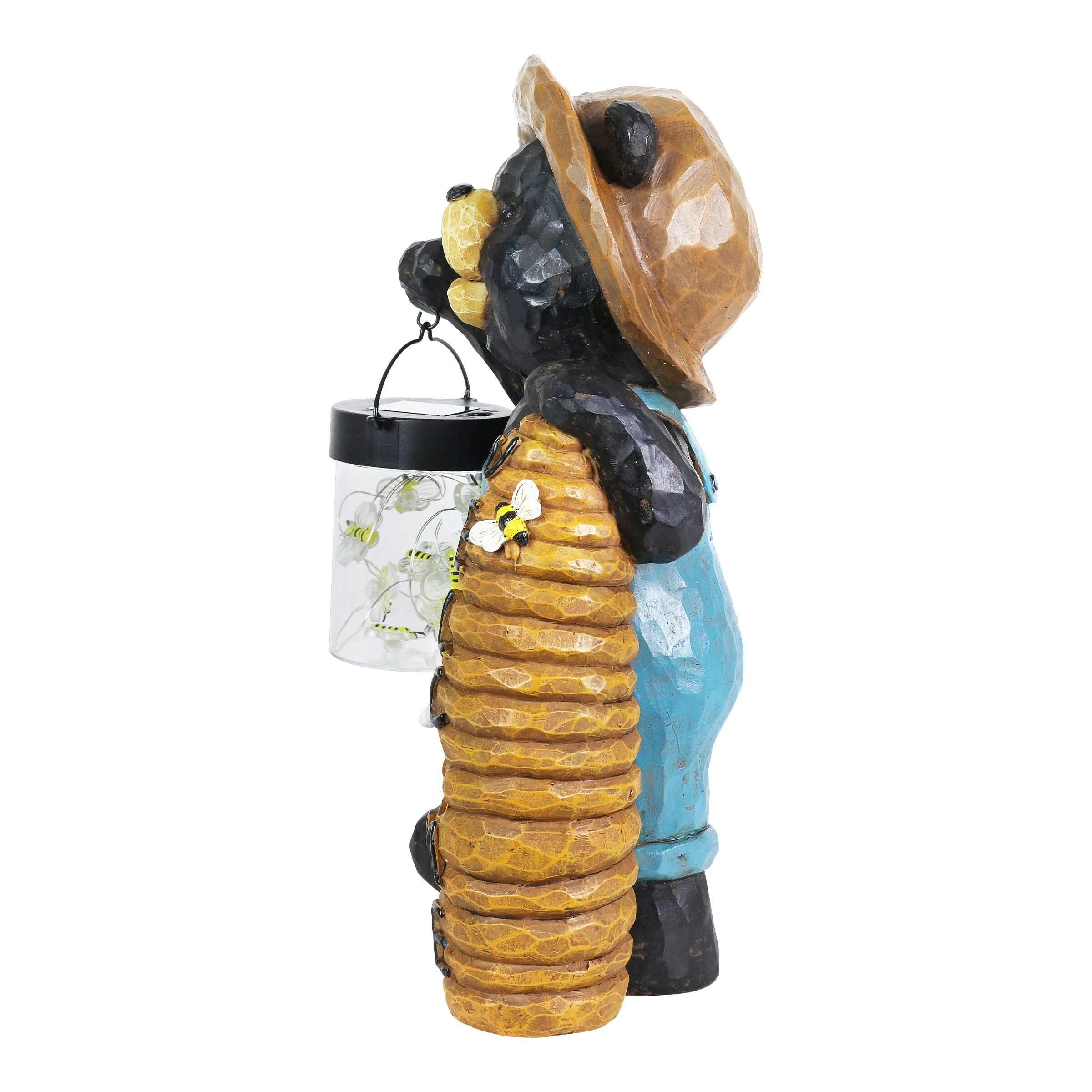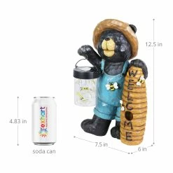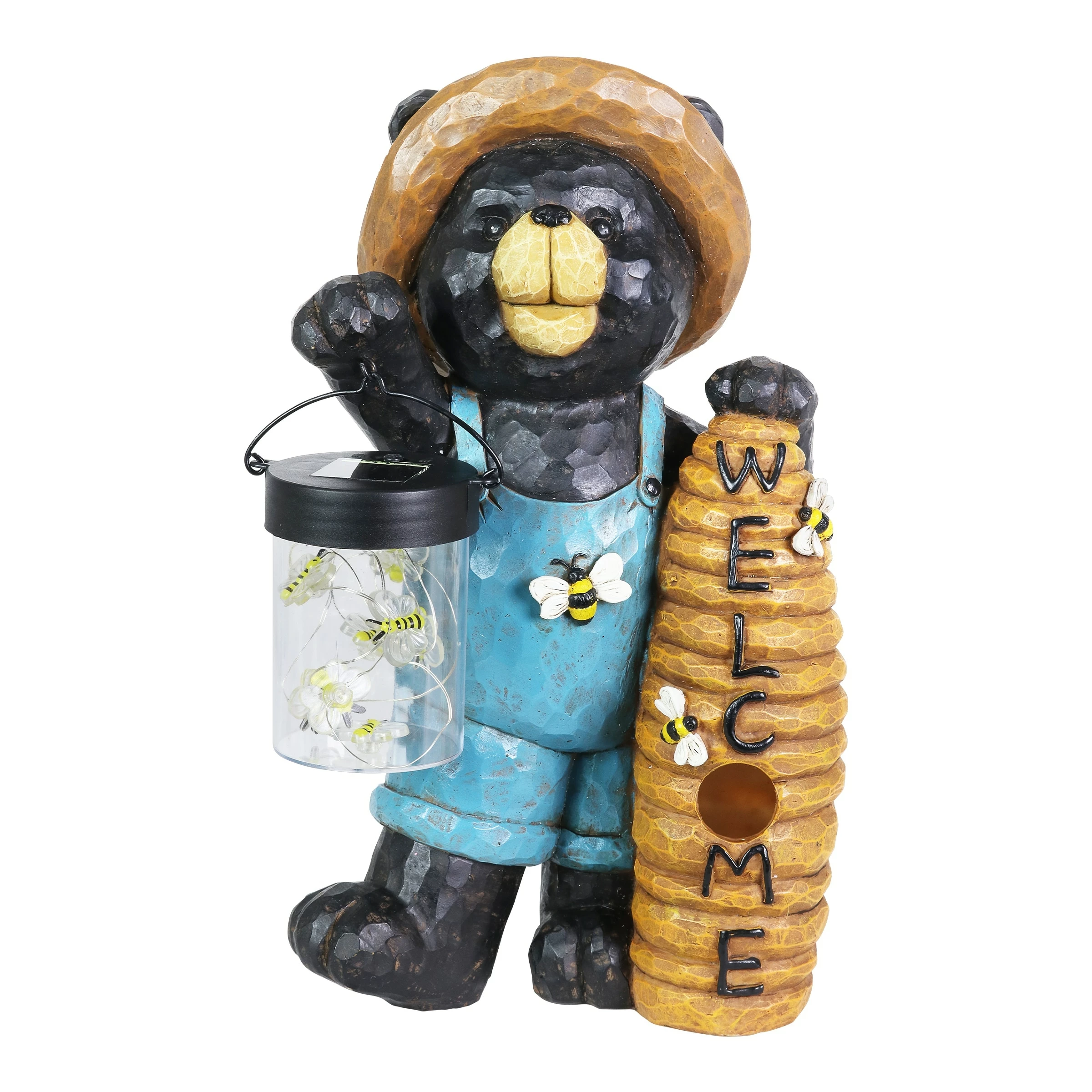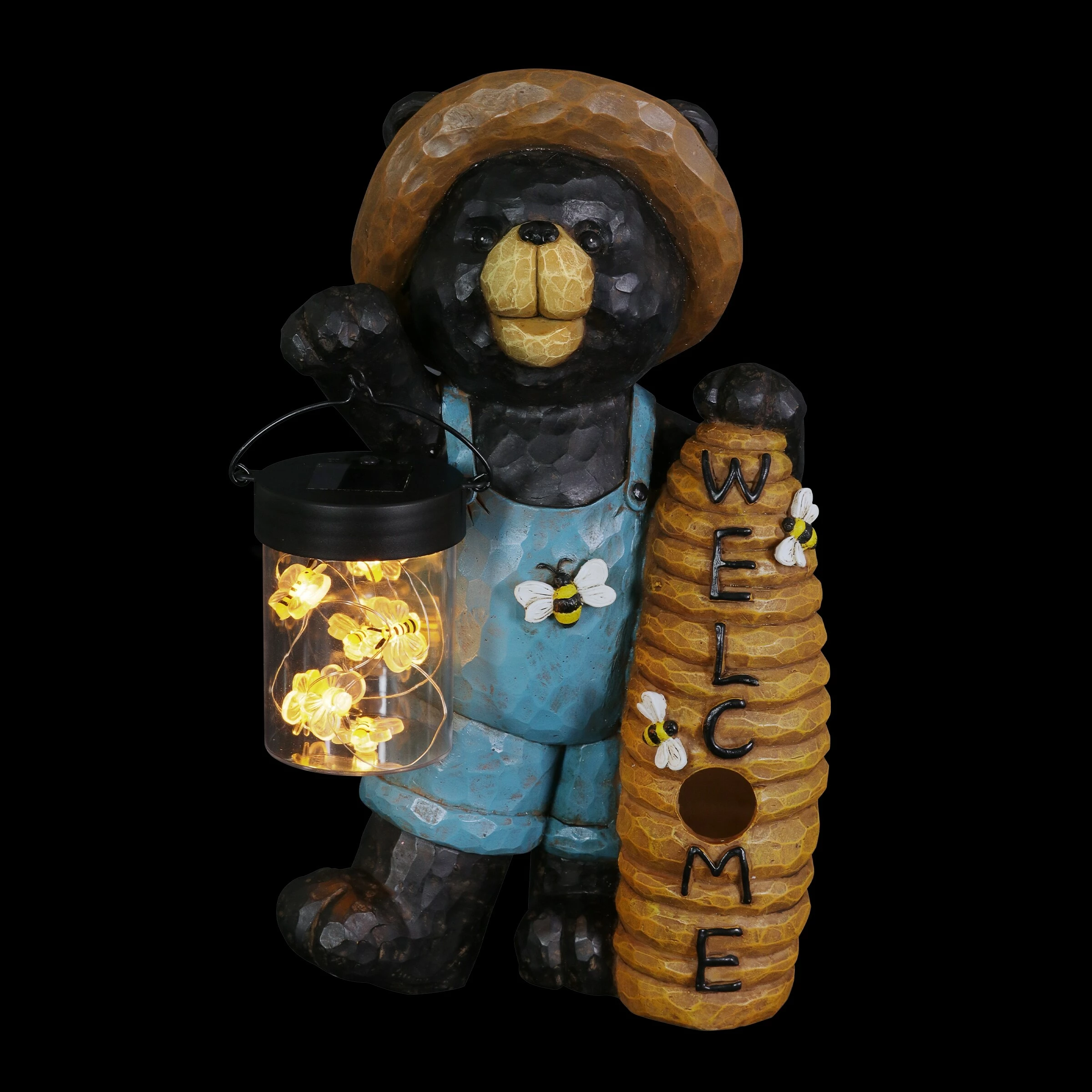 This adorable solar powered bear statue is carrying a jar full of illuminating LED bumblebees! At dusk, the LED lights will magically illuminate in the jar, bringing this adorable garden art to life! His beehive welcomes guests as he captures your heart with his endearing smile. Beautiful hand painted details make this bear look like he was carved from wood, but he is crafted from durable resin. Makes a wonderful addition to your home or garden!