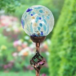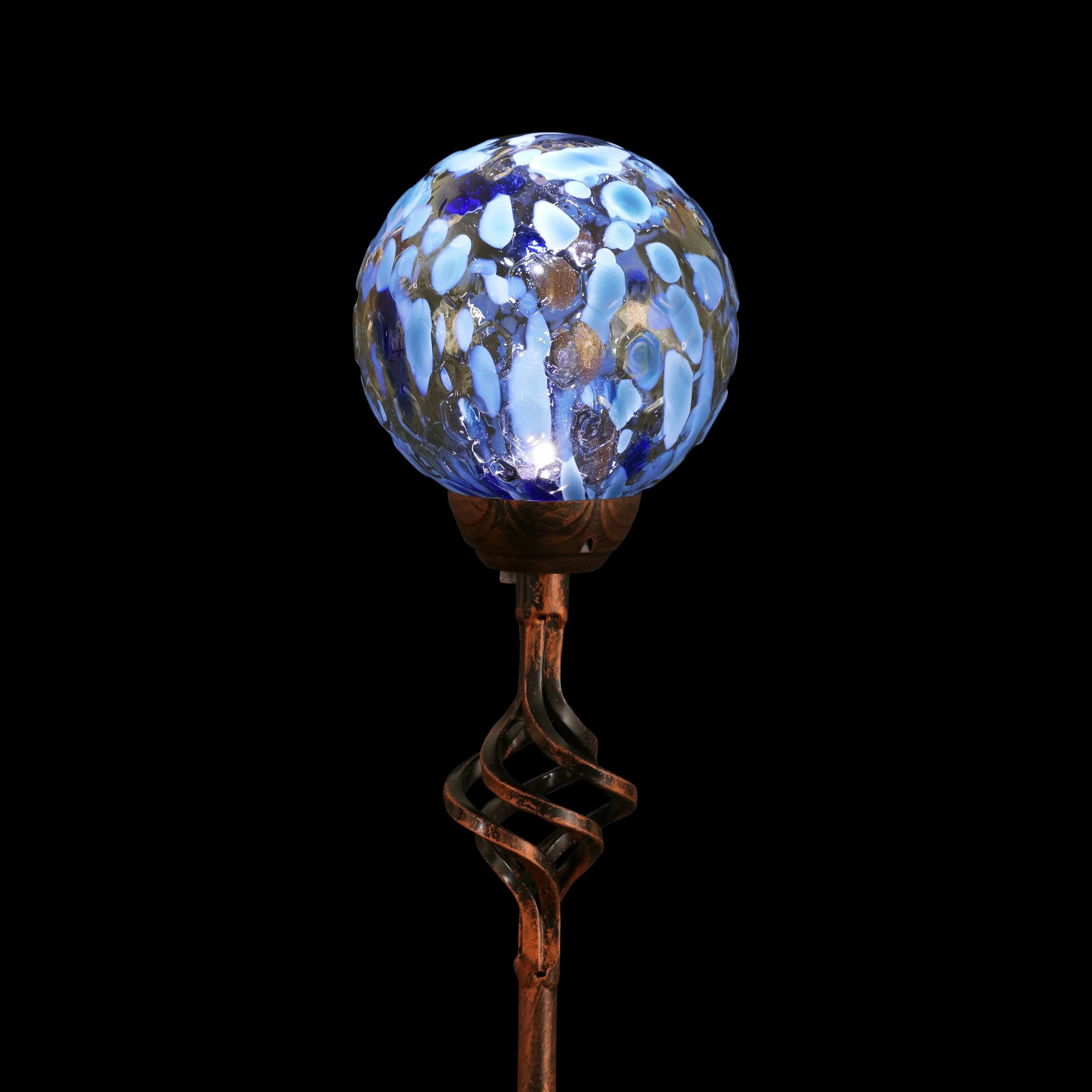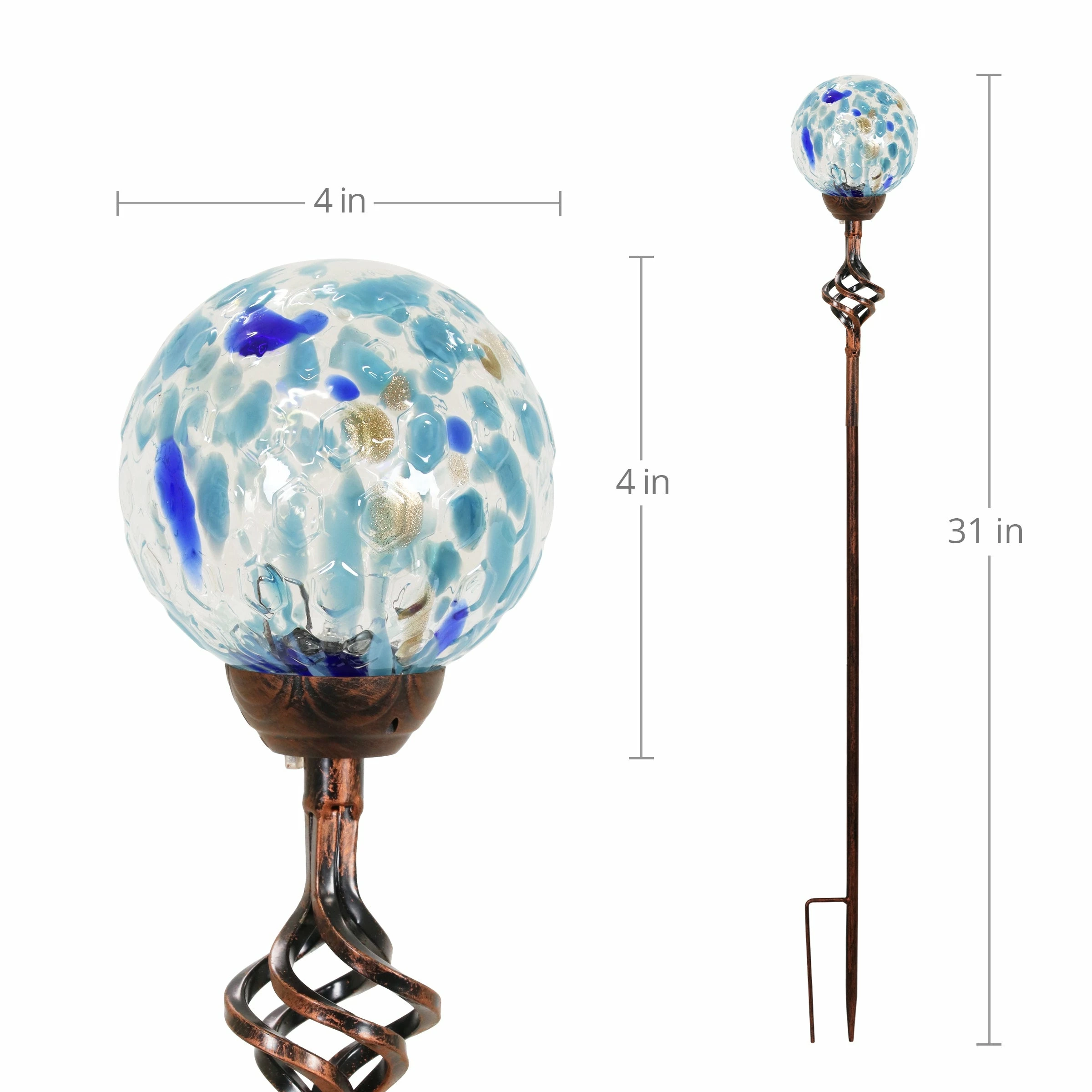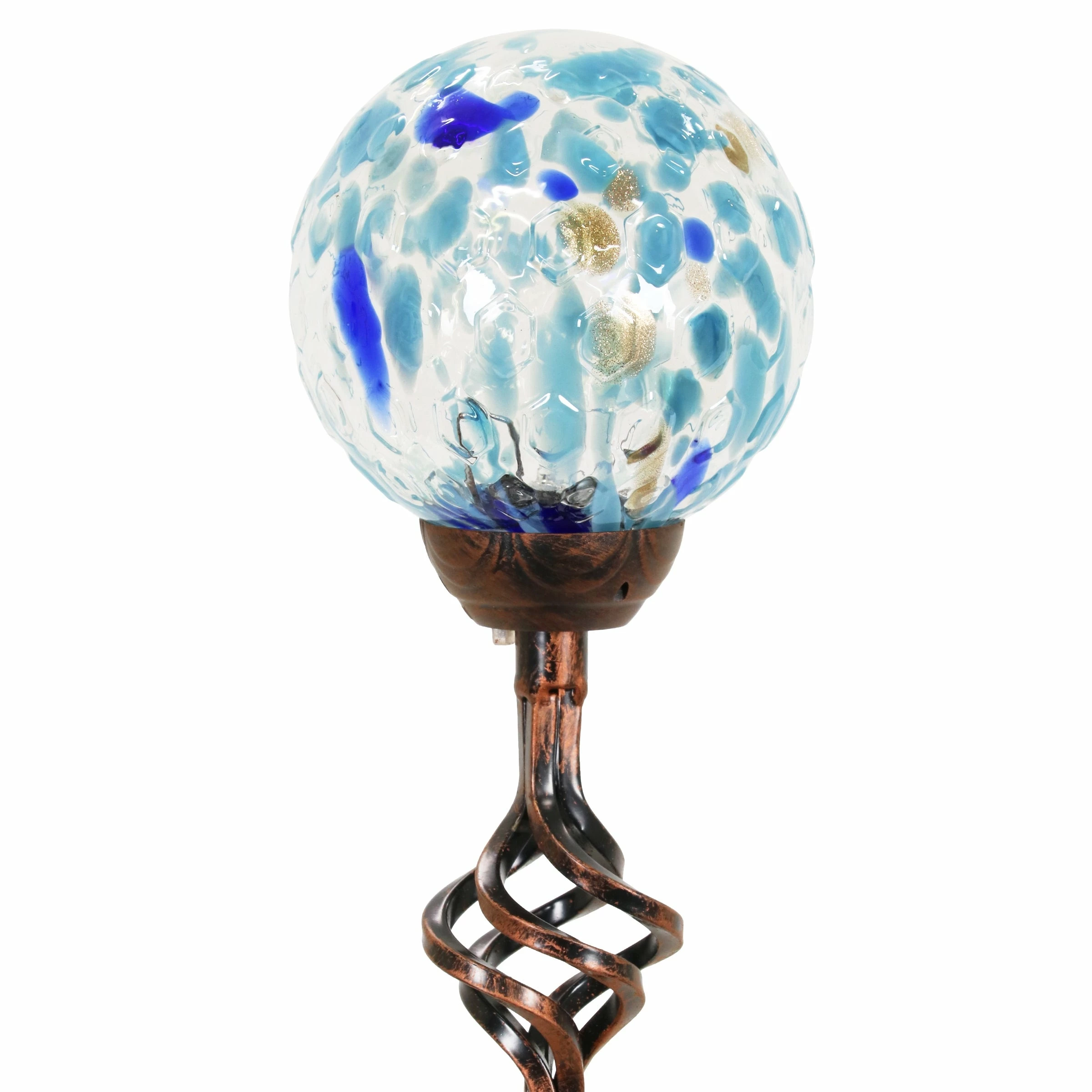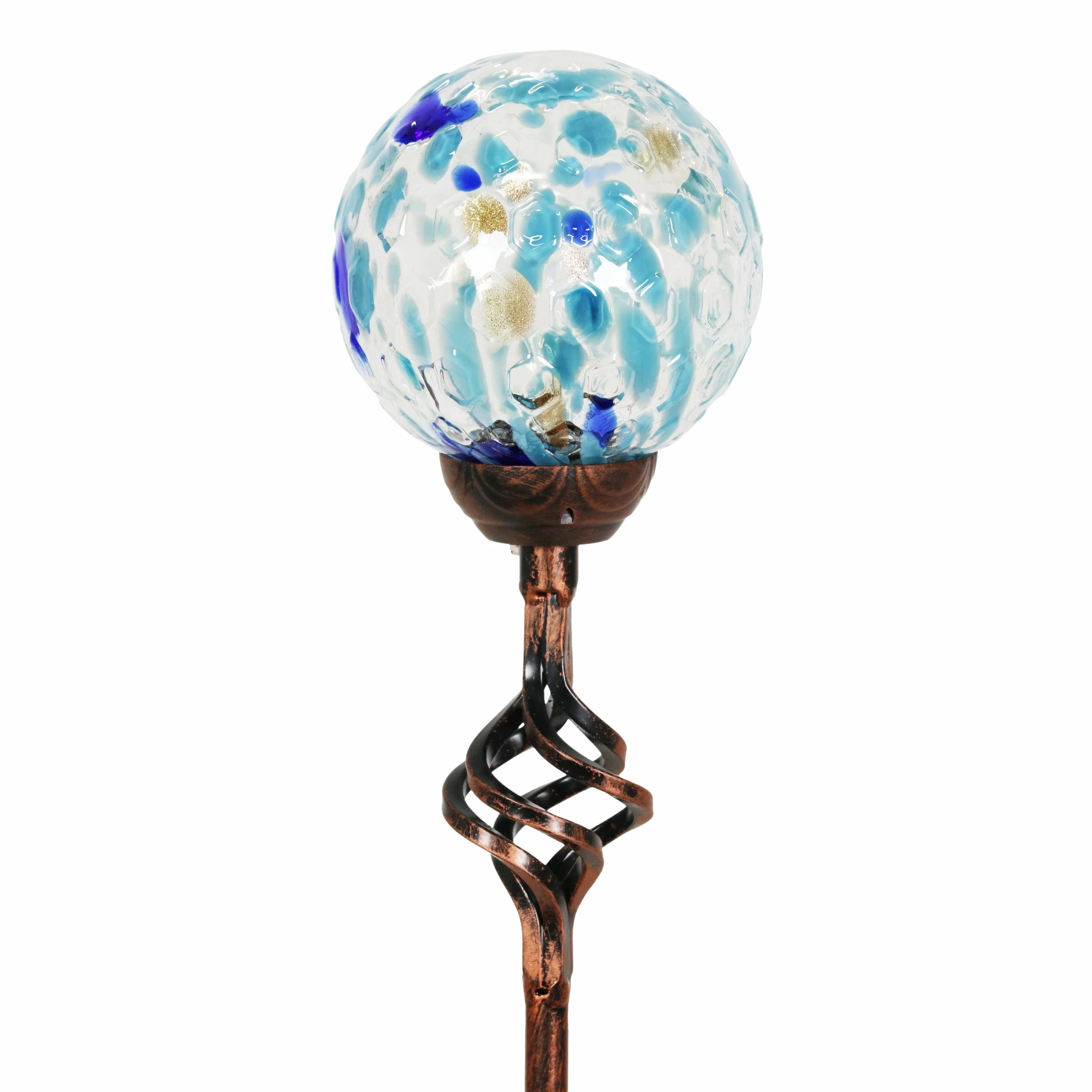 Exquisite solar pearlized honeycomb glass stake illuminates adding gorgeous color and life to your garden day and night. As the sun sets and dusk settles in, watch your beautiful glass stake glow from within. The spiraling metal finial adds an extra touch of elegance. Makes a thoughtful gift and a wonderful addition to any landscape. Exhart hand-blown glass pieces are one-of-a-kind and present with slight color variations.