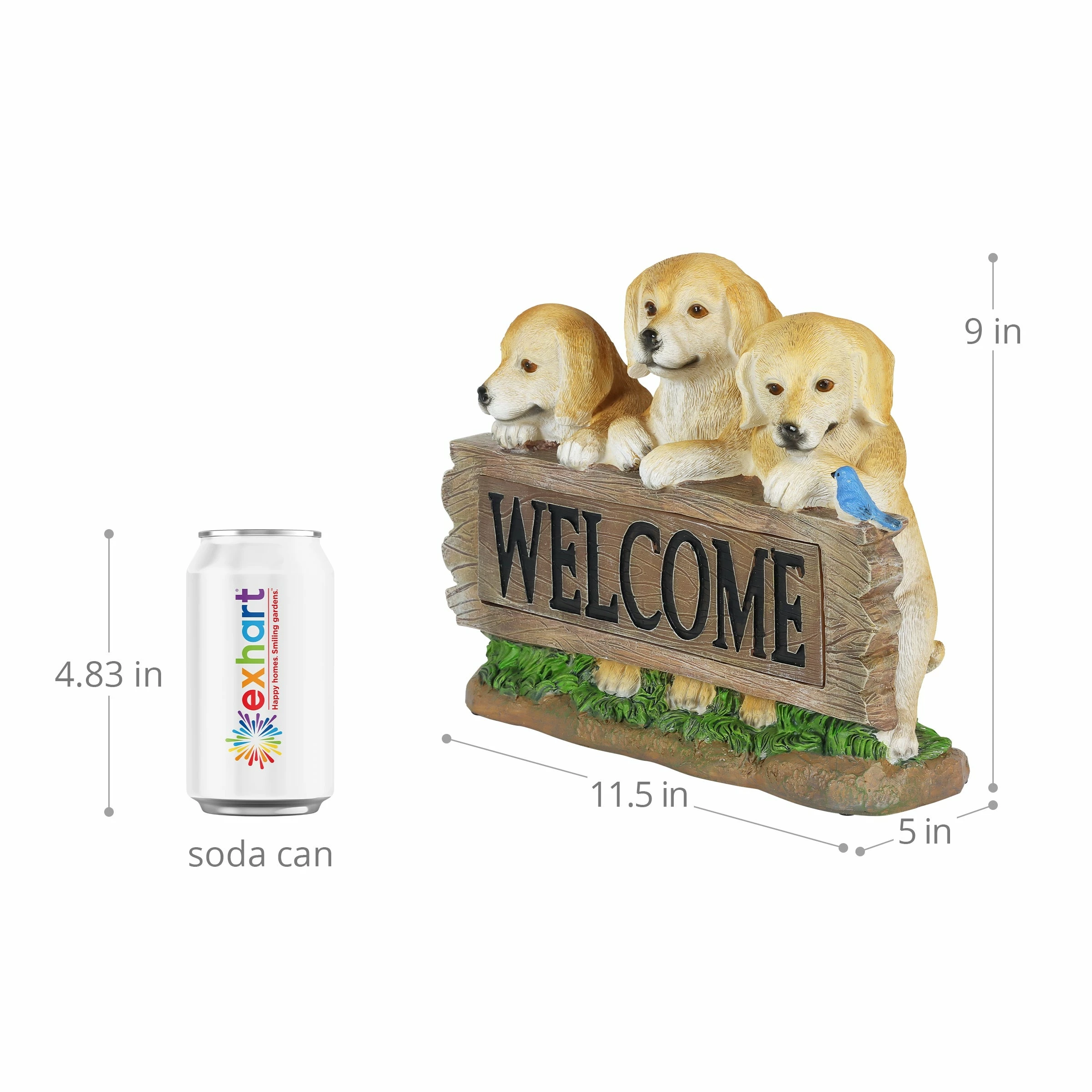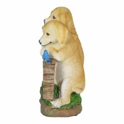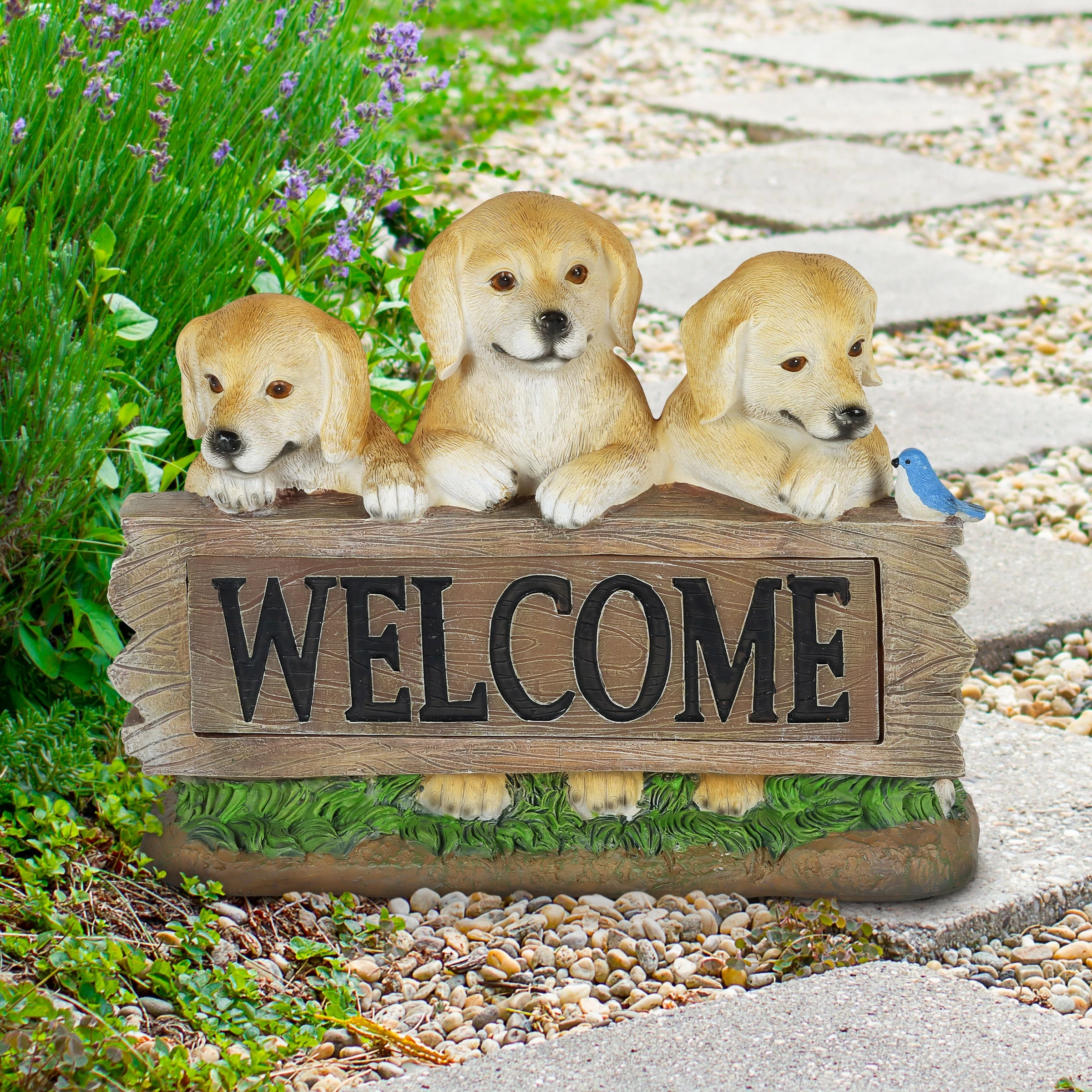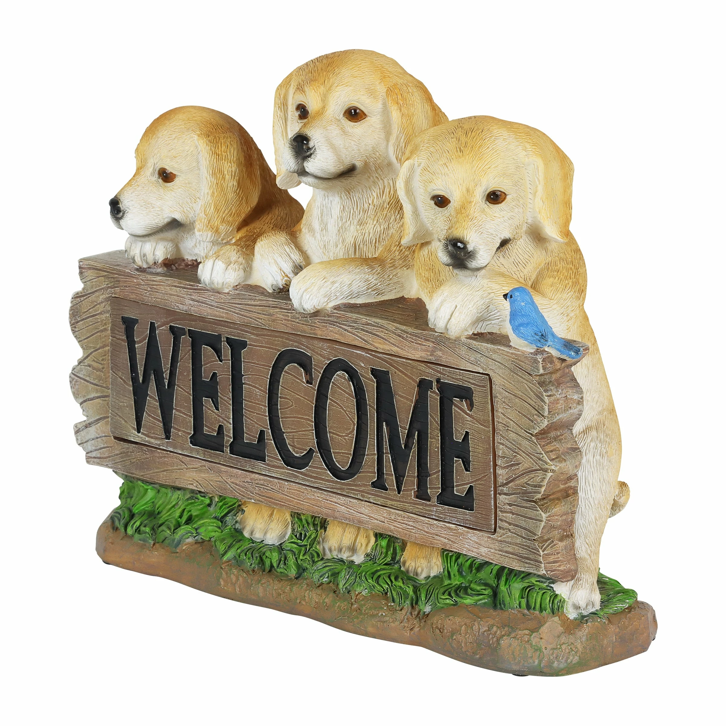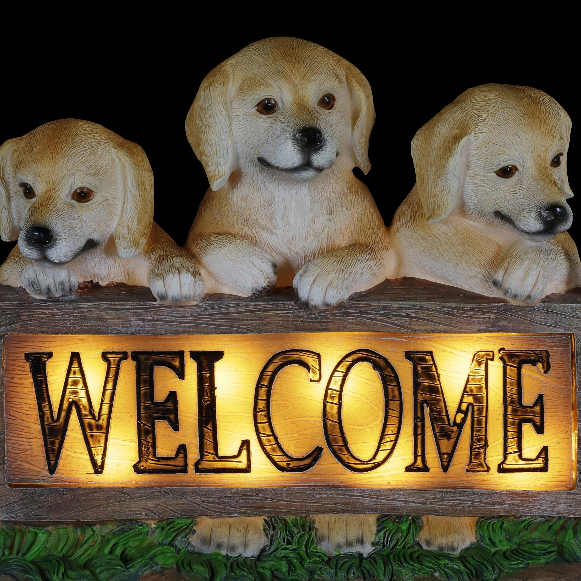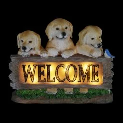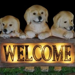 These three adorable Labradors frame a wooden looking log with an illuminating engraved WELCOME sign! At dusk, the sign in this garden statue will automatically glow with solar powered LED light. Greet your friends and neighbors day or night with this beautifully hand painted Labrador Welcome Sign Statuary. Adds instant charm to any pet lover’s home or garden.