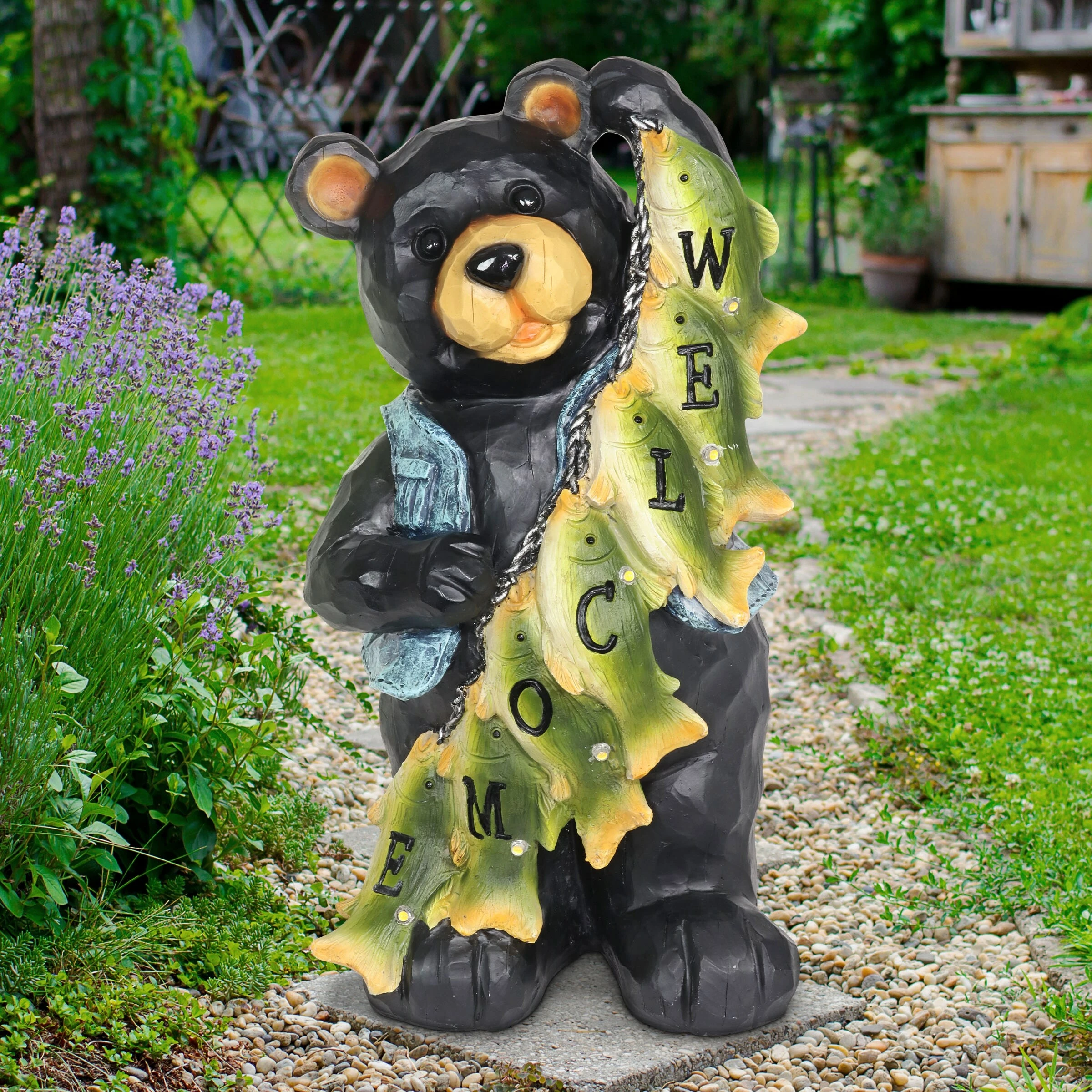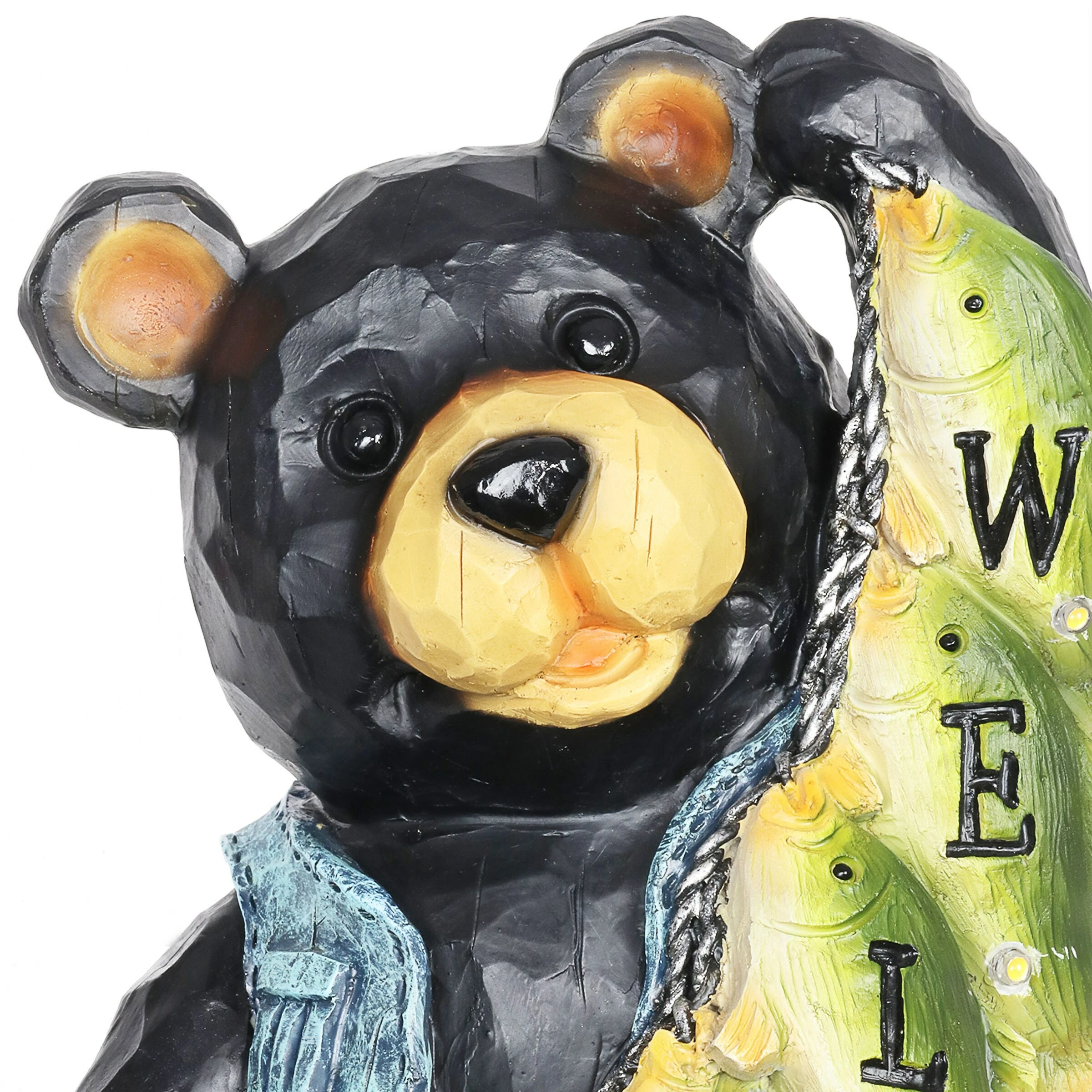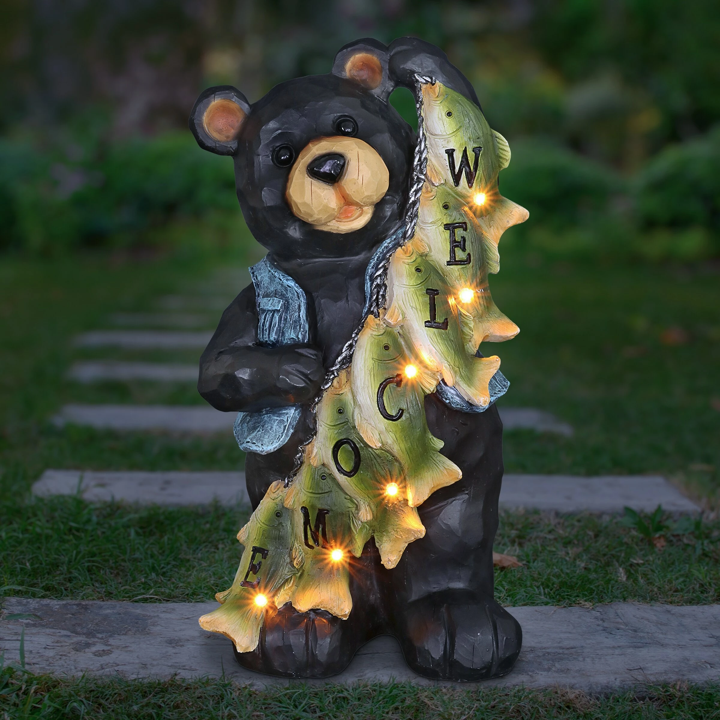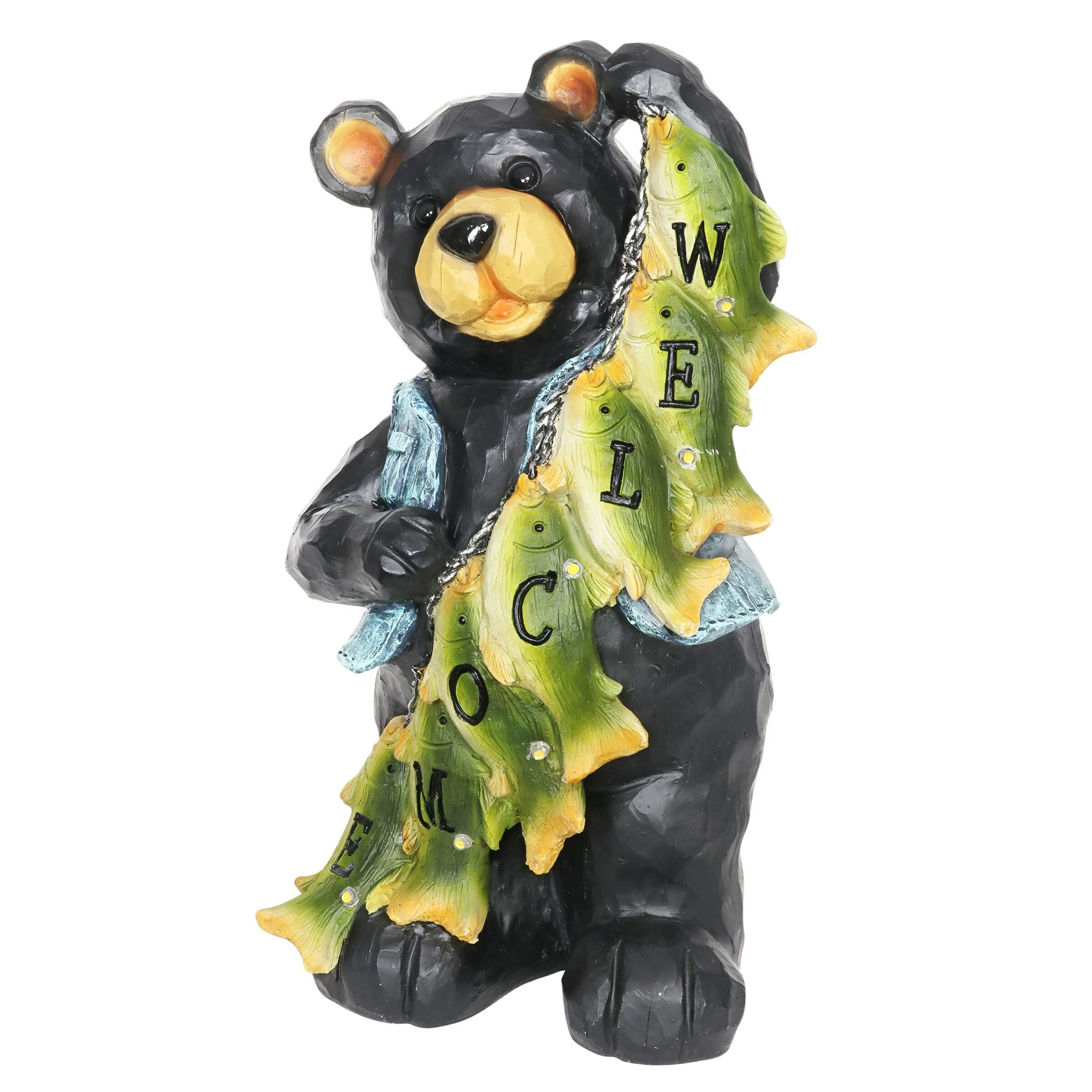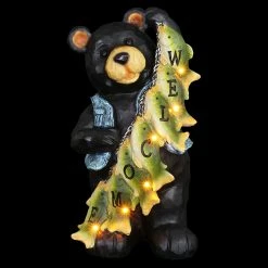 A most well deserved smile is donned by this proud fisherman bear and his string of freshly caught fish! Each little fish helps to spell out a welcome sign for all your guests. Watch it illuminate at dusk with it’s solar powered LED light. A charming gift for the fisherman in your life and an adorable addition to any home!