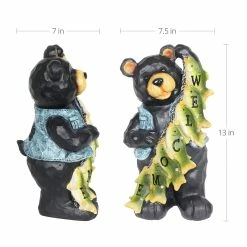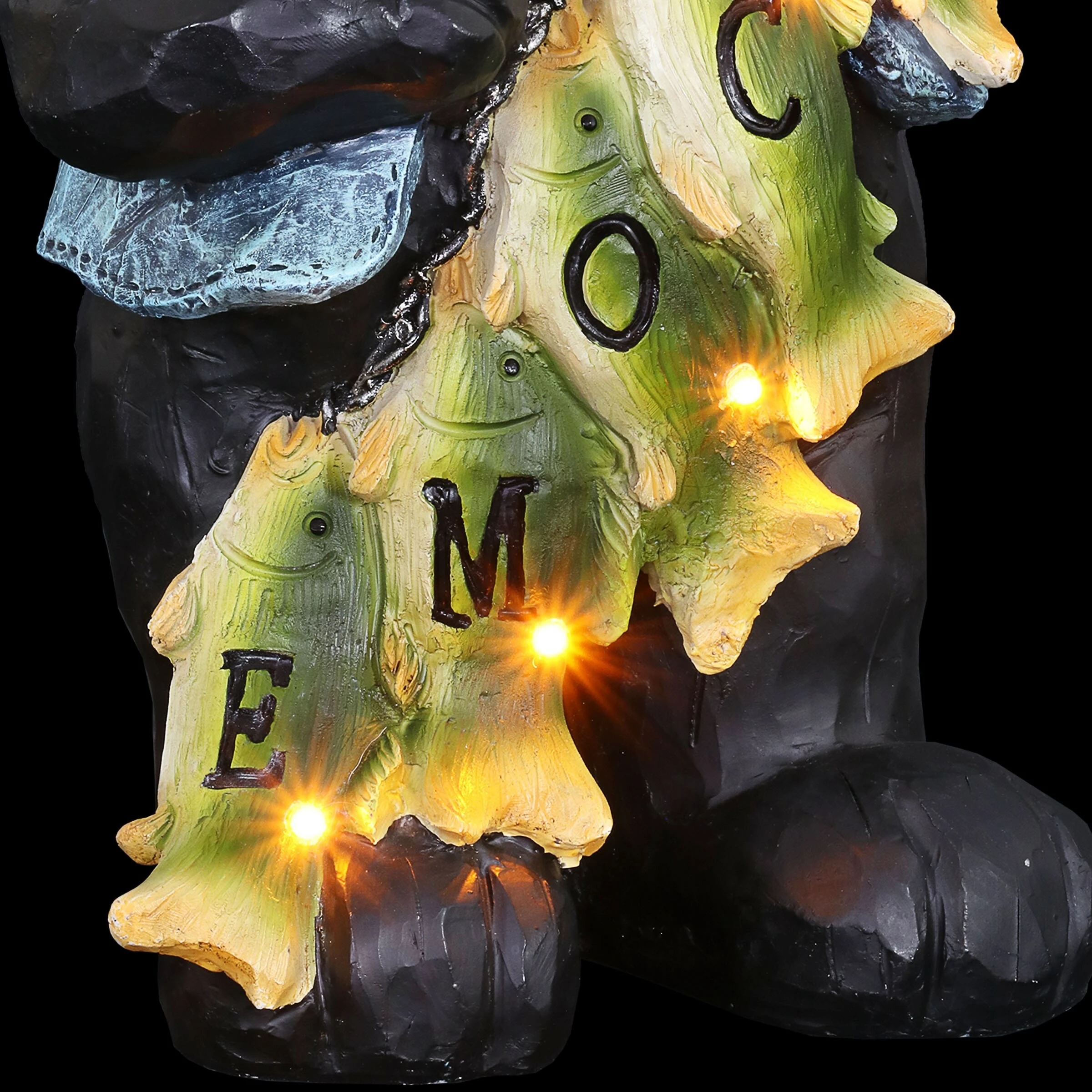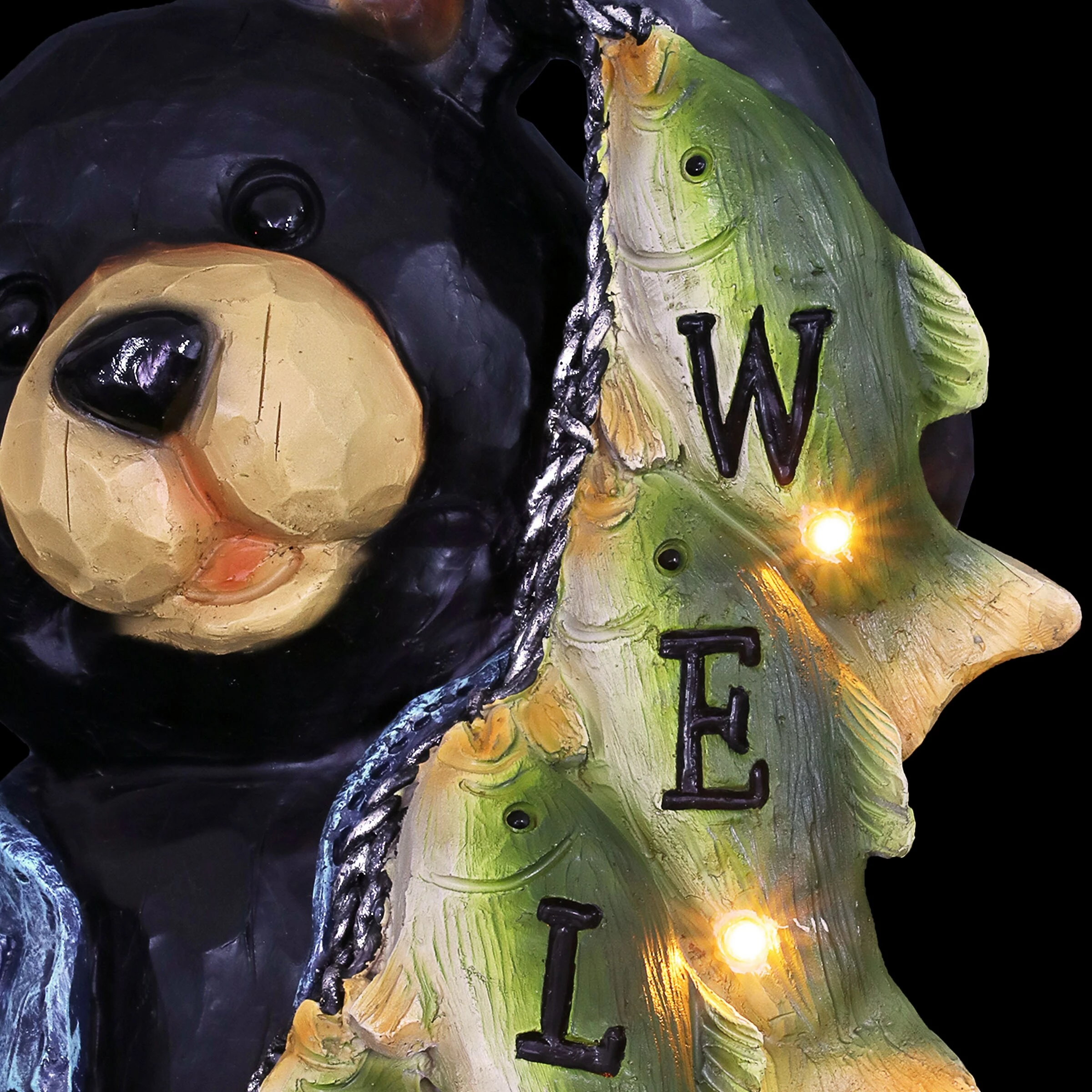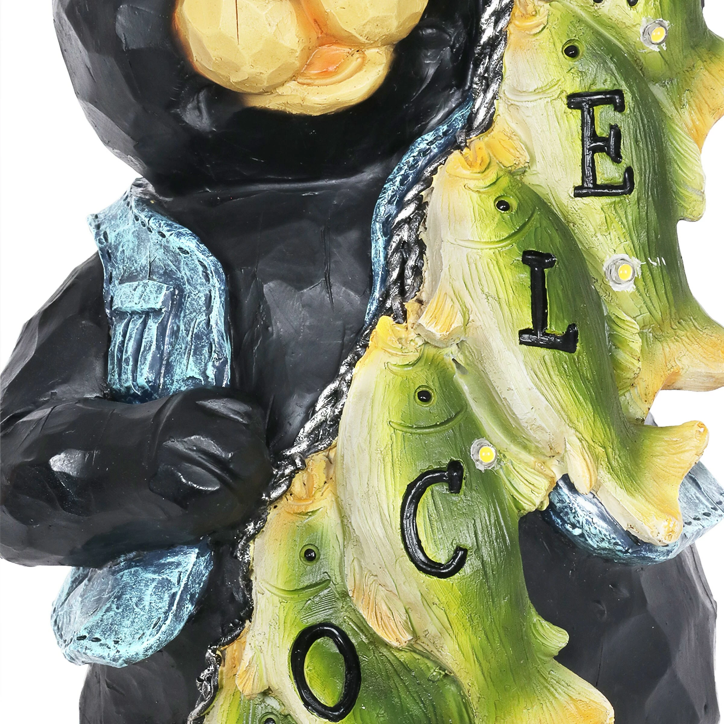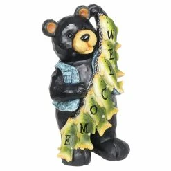 A most well deserved smile is donned by this proud fisherman bear and his string of freshly caught fish! Each little fish helps to spell out a welcome sign for all your guests. Watch it illuminate at dusk with it’s solar powered LED light. A charming gift for the fisherman in your life and an adorable addition to any home!
