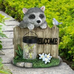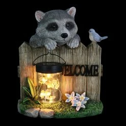 This curious racoon is peaking over a welcome fence with a jar full of illuminating bumblebees! At dusk, the solar powered LED lights will magically illuminate in the jar, bringing this adorable garden art to life. Beautifully hand painted details make this garden statuary a wonderful addition to your home or garden and a great gift idea for the animal lover too!