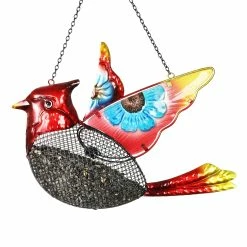 Create a welcoming space birds will love to visit with a beautiful hanging bird feeder! Birds will flock from near and far to feed from this colorfully hand-painted cardinal bird feeder. Feeder easily hangs from it’s chain anywhere you wish to place it: a patio, awning, tree branch, shepard’s hook and more. This piece is crafted in durable metal, painted in colorful metallic paint and UV treated to resist fading. It convenient metal mesh basket holds the visible birdseed as it welcomes your feathered friends to come enjoy a meal in your garden. Adds instant charm to your yard and makes a wonderful gift for the bird watching enthusiast!