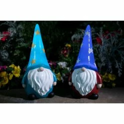 - LED light illuminates the gnome’s blue hat from within