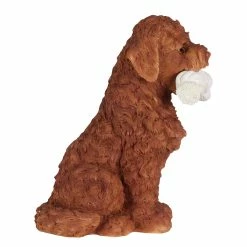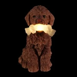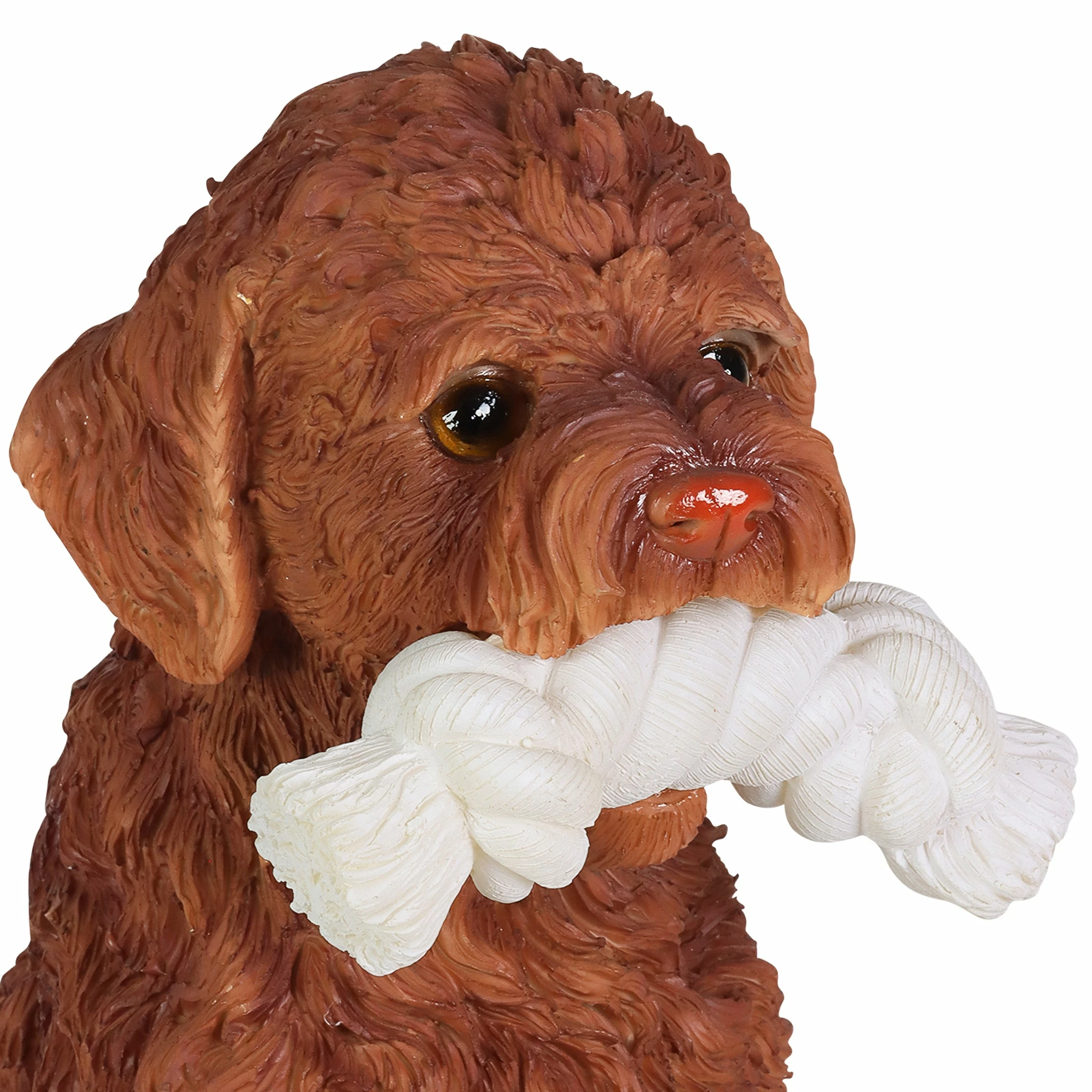 This adorable brown doodle dog holds his illuminating rope toy in his mouth. At dusk the rope will automatically glow with solar powered LED light, so he can play day or night! Beautifully hand painted resin statuary makes a wonderful addition to any garden and a great gift for the animal lover in your life!