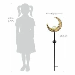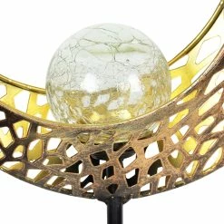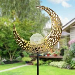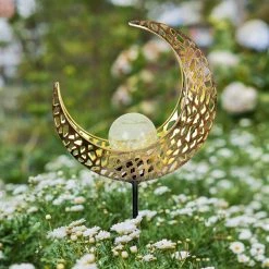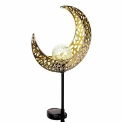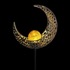 Add a sophisticated touch of light to your garden with this gorgeous Solar Golden Crescent Moon Stake! This celestial design is crafted in metal filigree and cradles a crackle finished ball at its center that will illuminate with Solar powered LED light at dusk. Enjoy the exquisitely crafted beauty of Exhart garden art.
