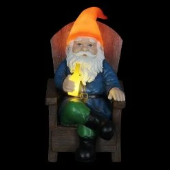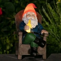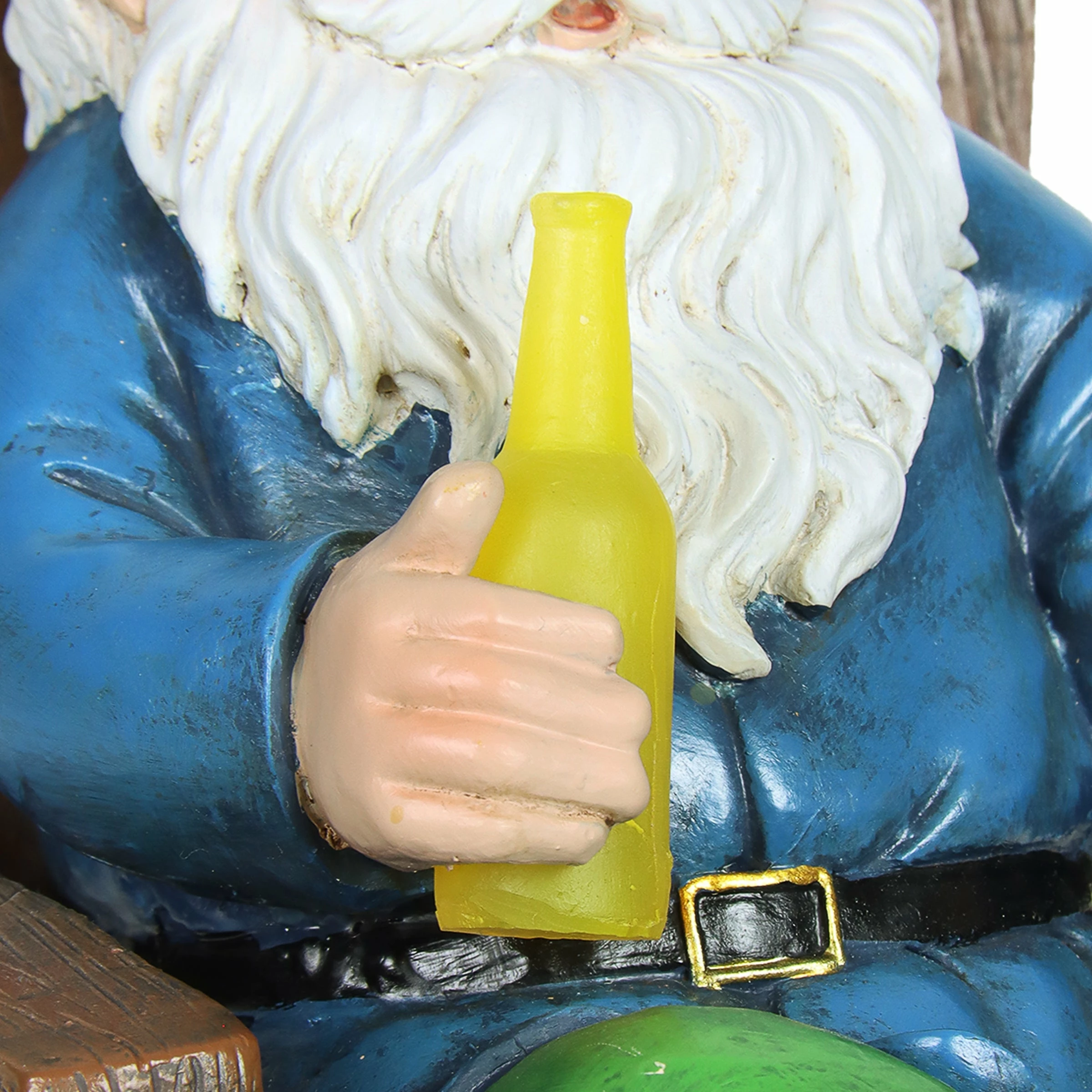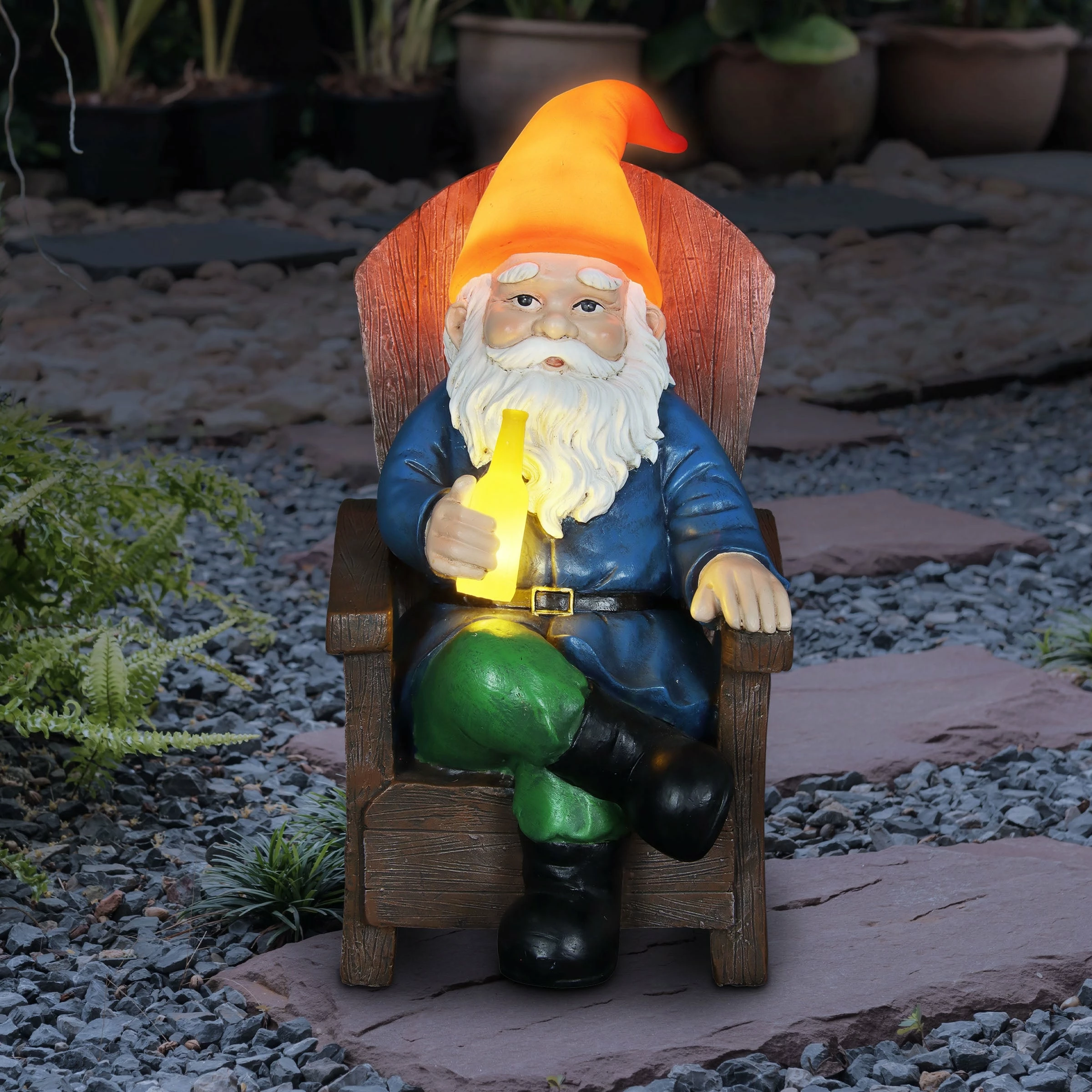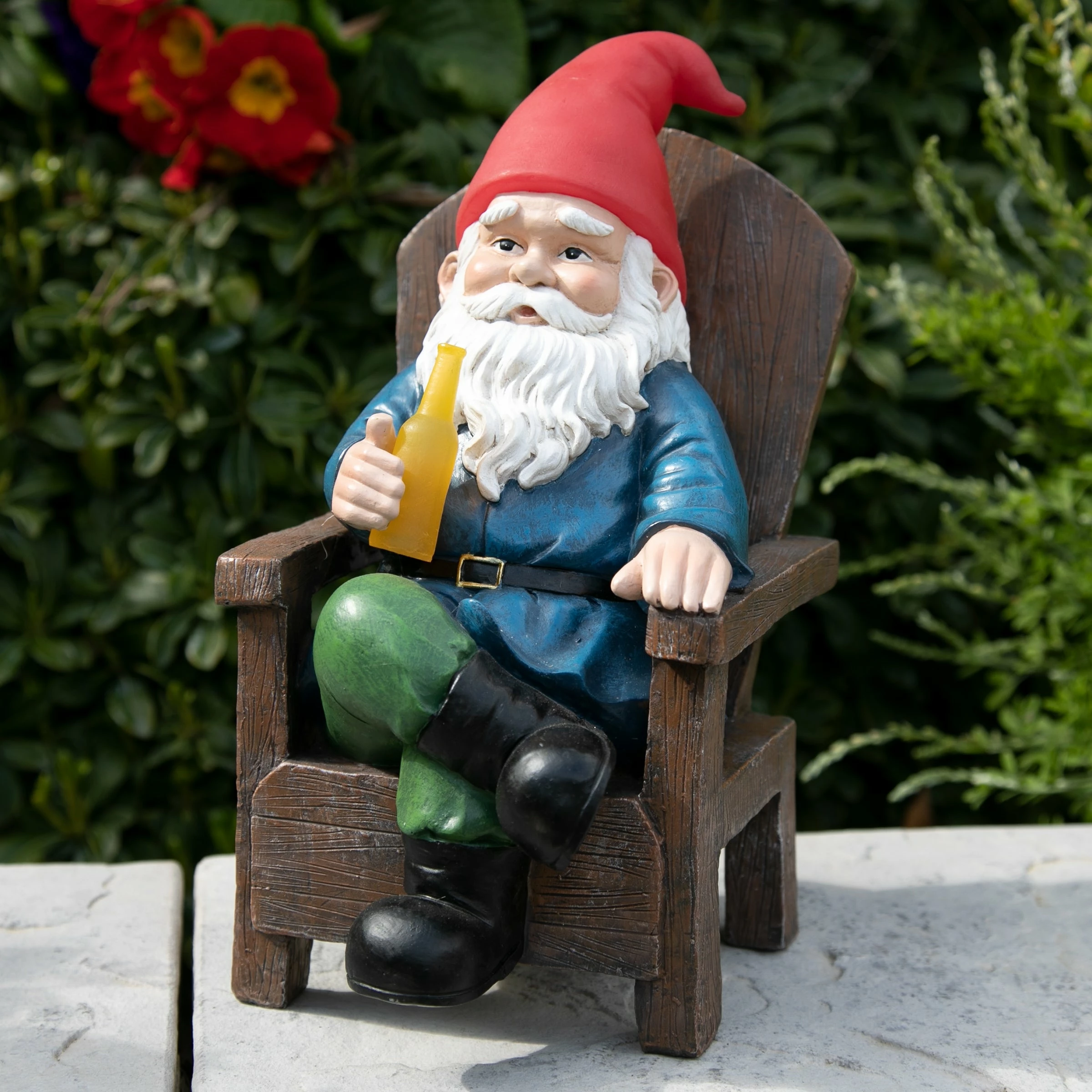 Life can be hard. Kick back with drinking Danny, the solar powered Good Time Gnome in his favorite adirondack chair, and remember not to take it too seriously! Watch as the LEDs in his gnome hat and bottled beverage automatically illuminate with light, so you can enjoy this fun statue day or night! The solar powered LED lights will charge during the day for your convenience. Makes a great reminder to take a load off once in a while, you deserve it. Danny the gnome adds a little whimsy and a touch of good natured fun to your garden!