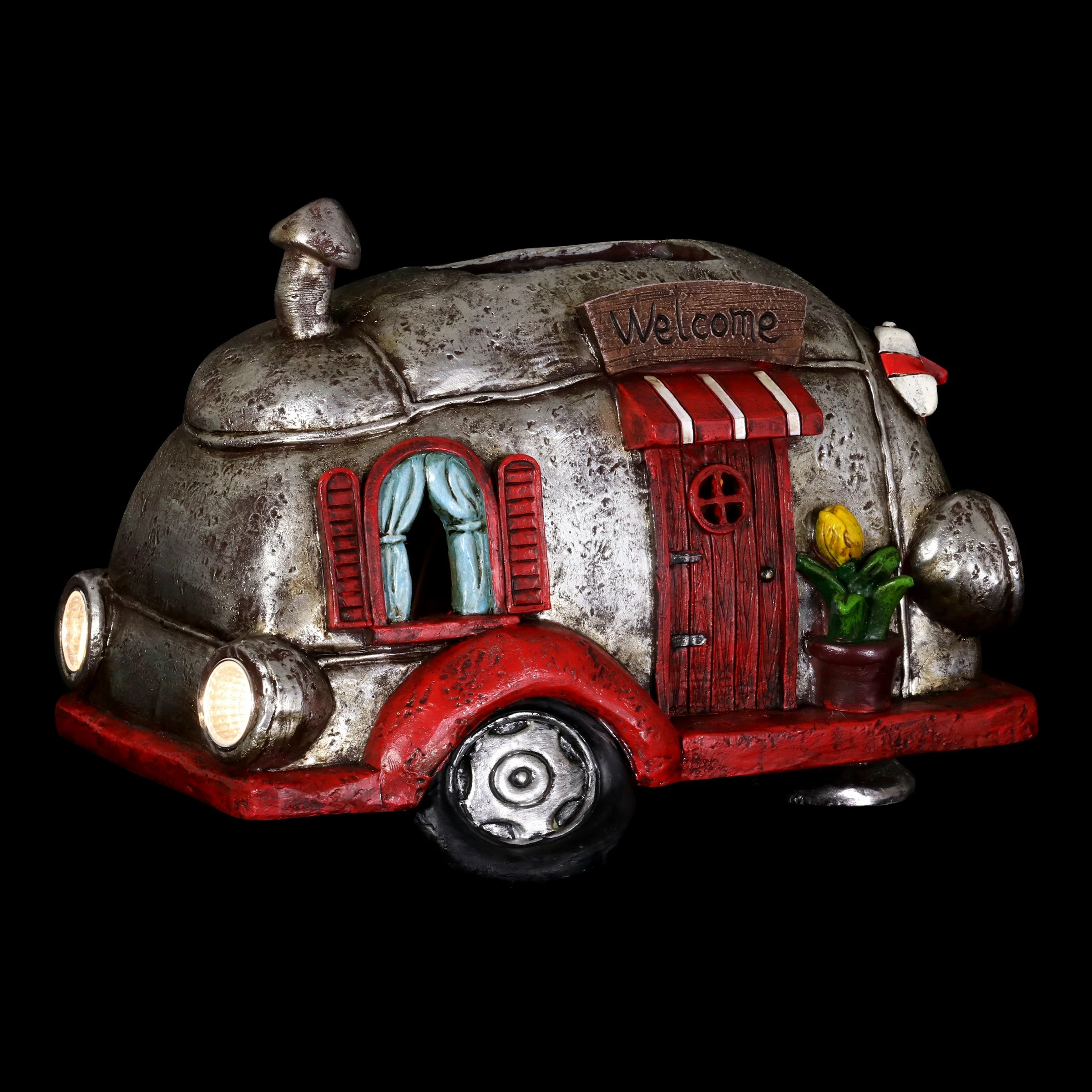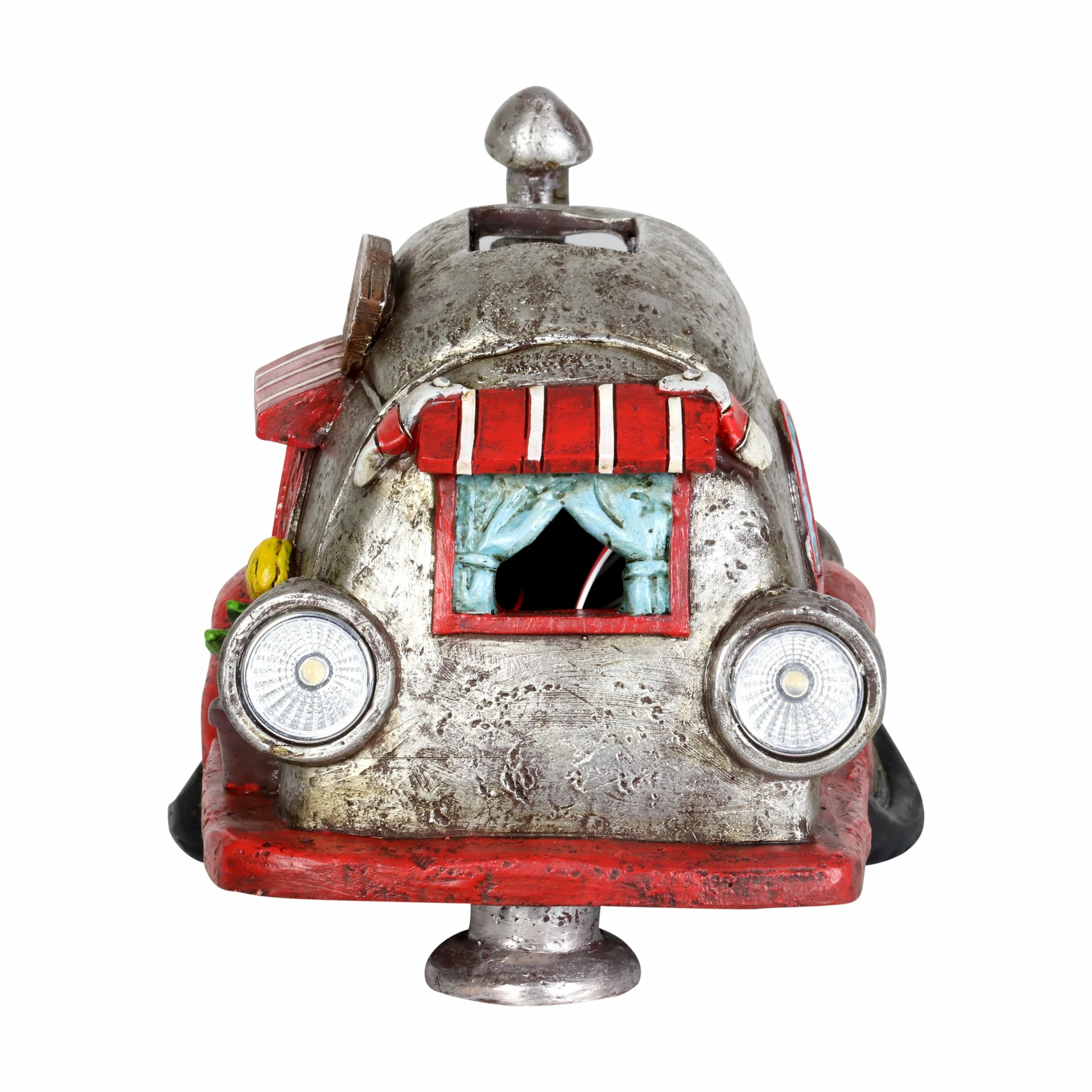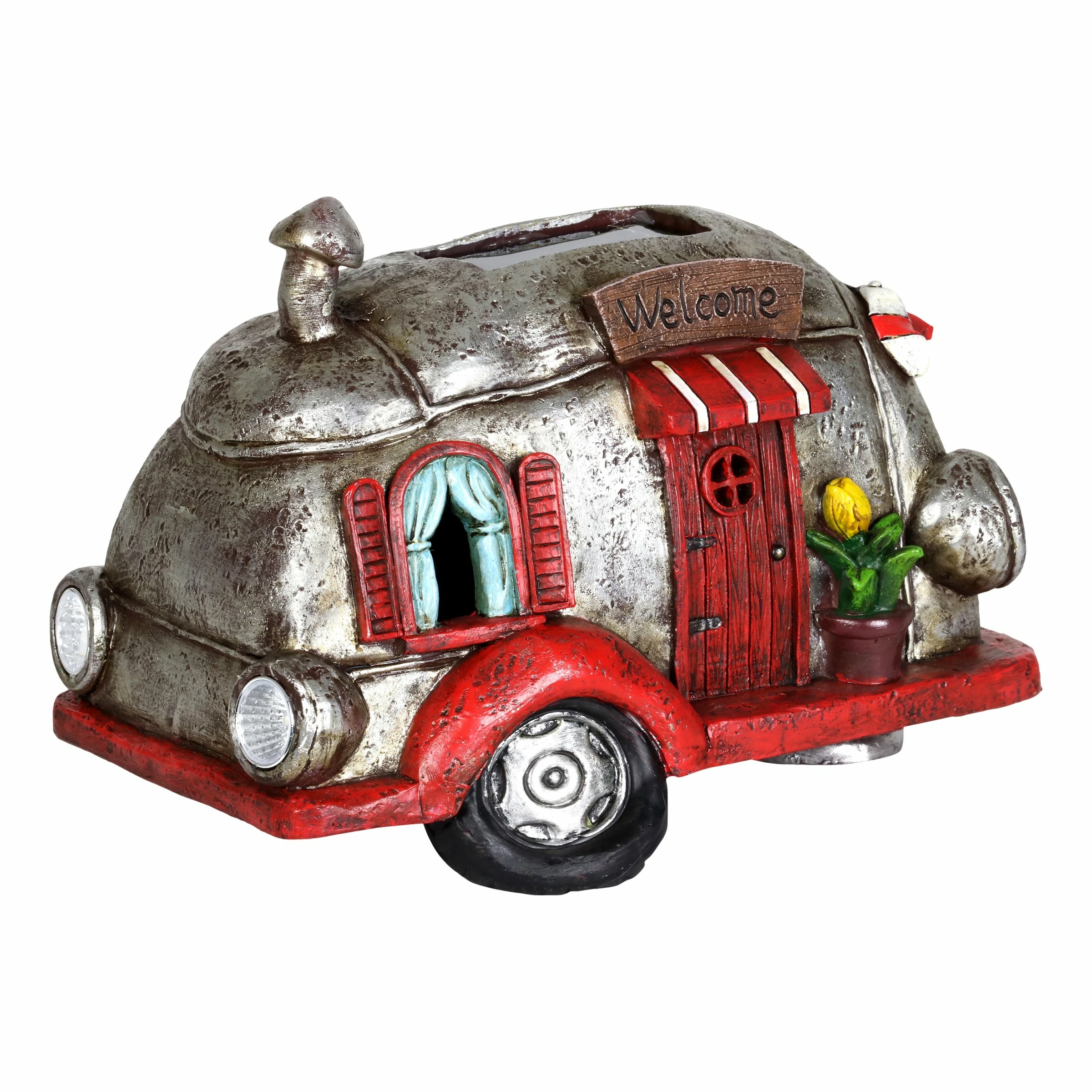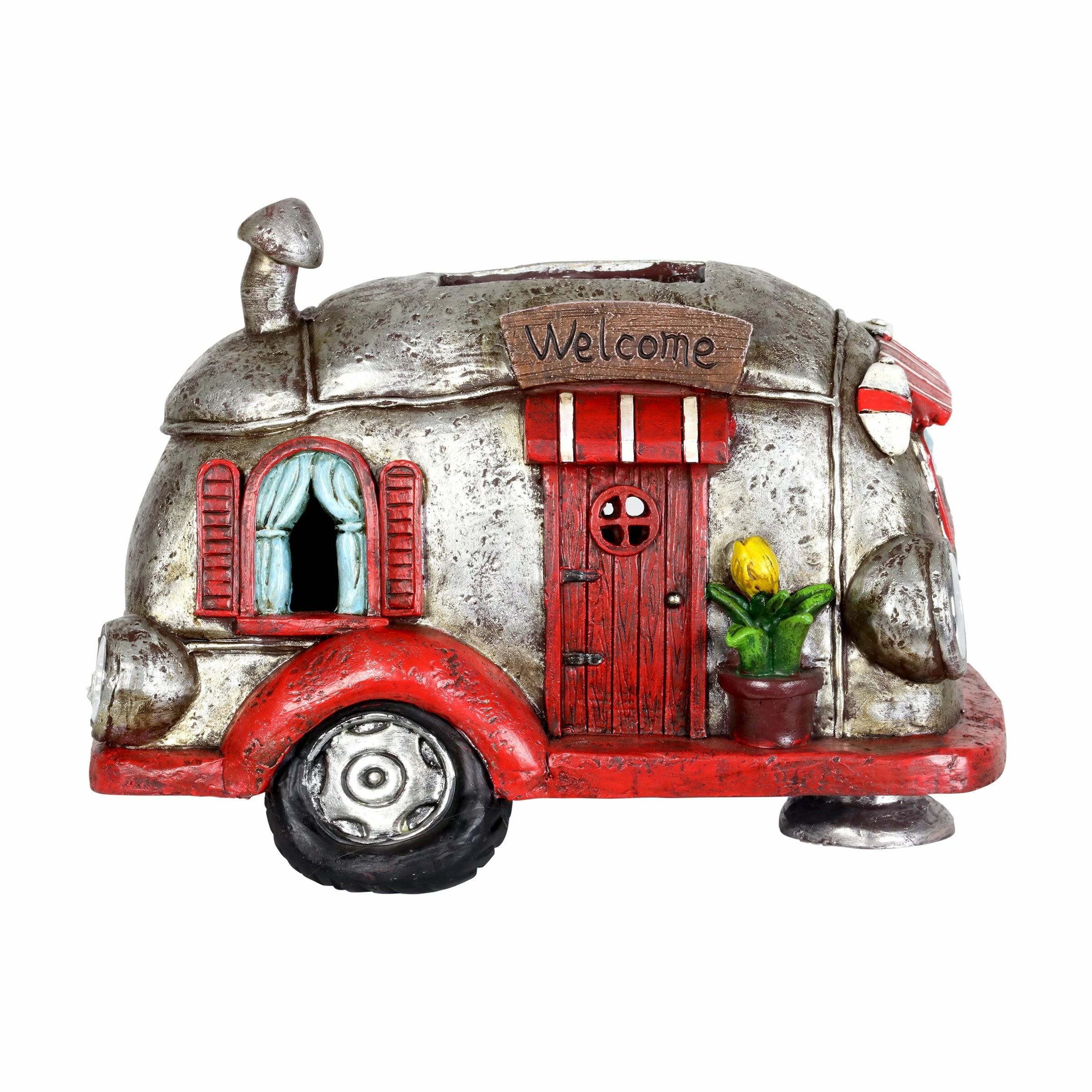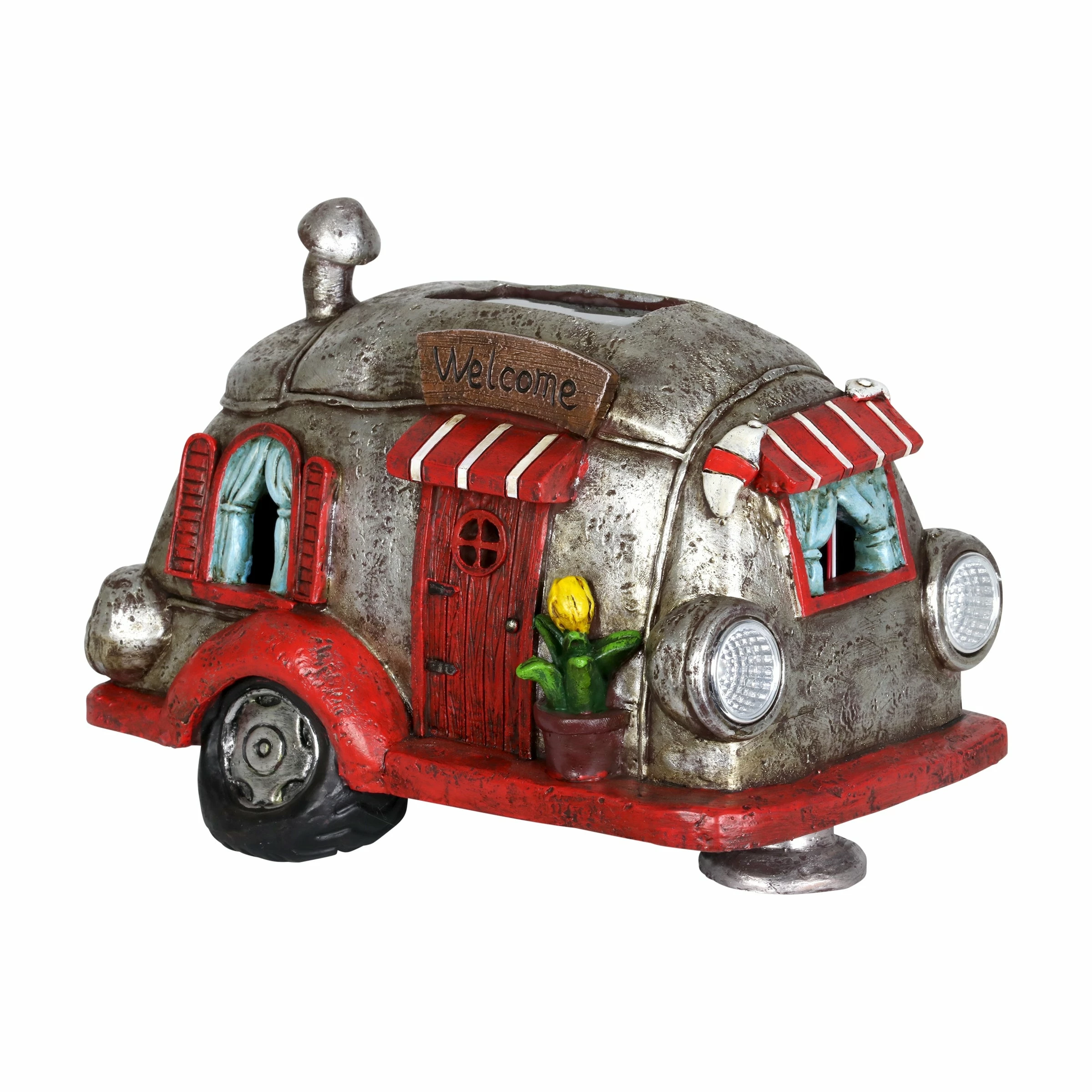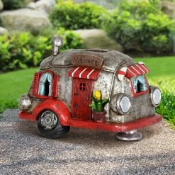 Cruise down memory lane in this charming vintage Solar Red and Silver Retro Camper Garden Statue! Its beautiful hand painted details include a charming potted plant, striped awnings and adorable headlights. Enjoy the glowing solar light as it automatically illuminates at dusk bringing a nostalgic sense of fun to your garden!