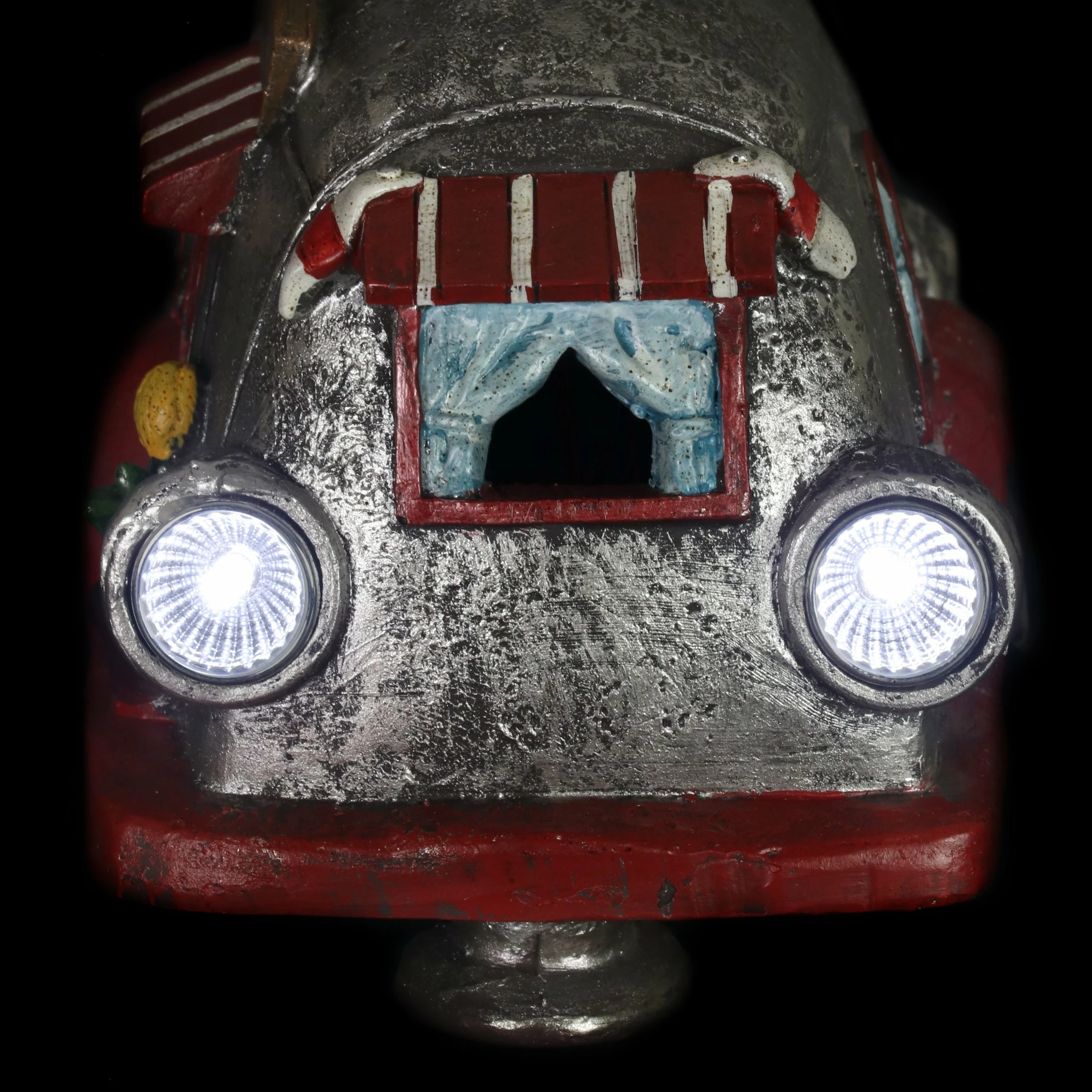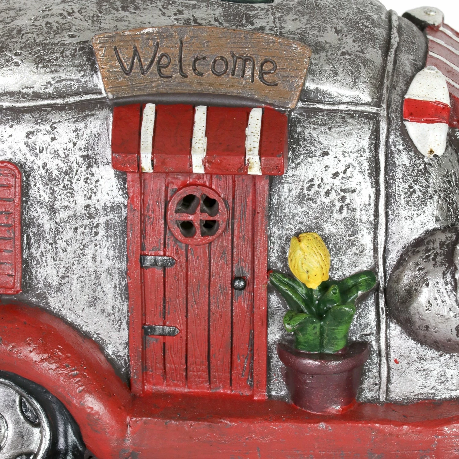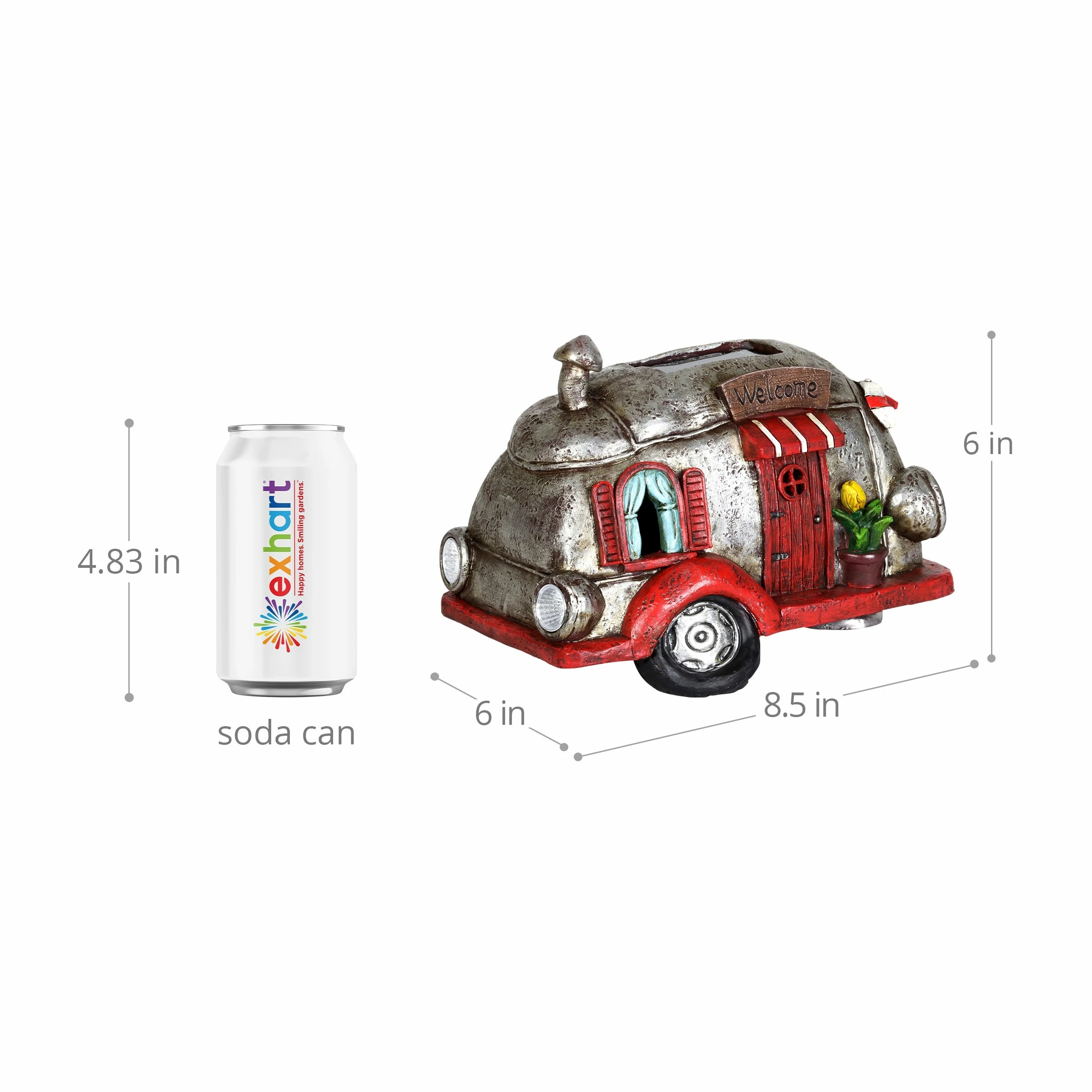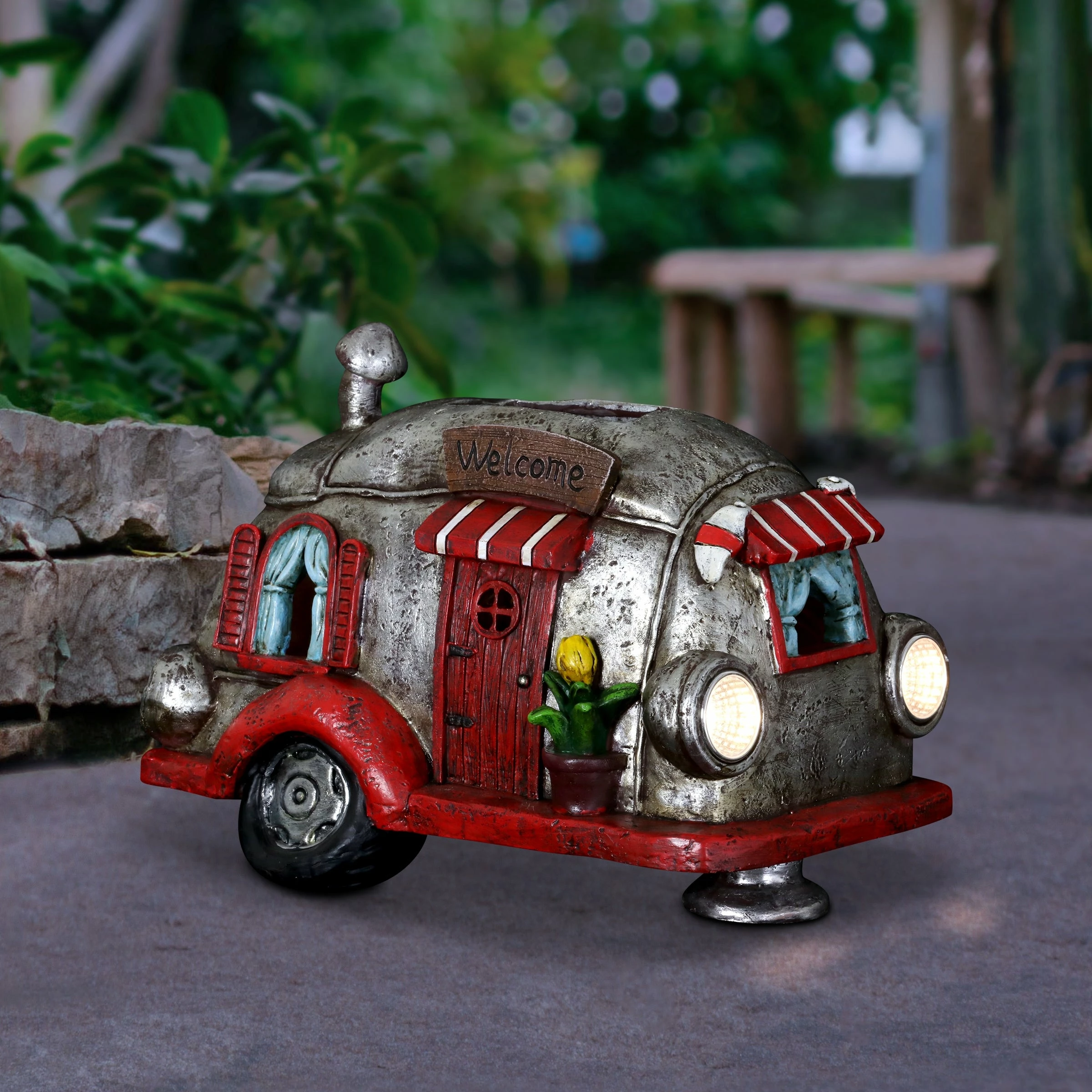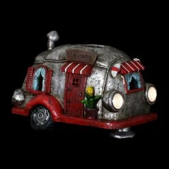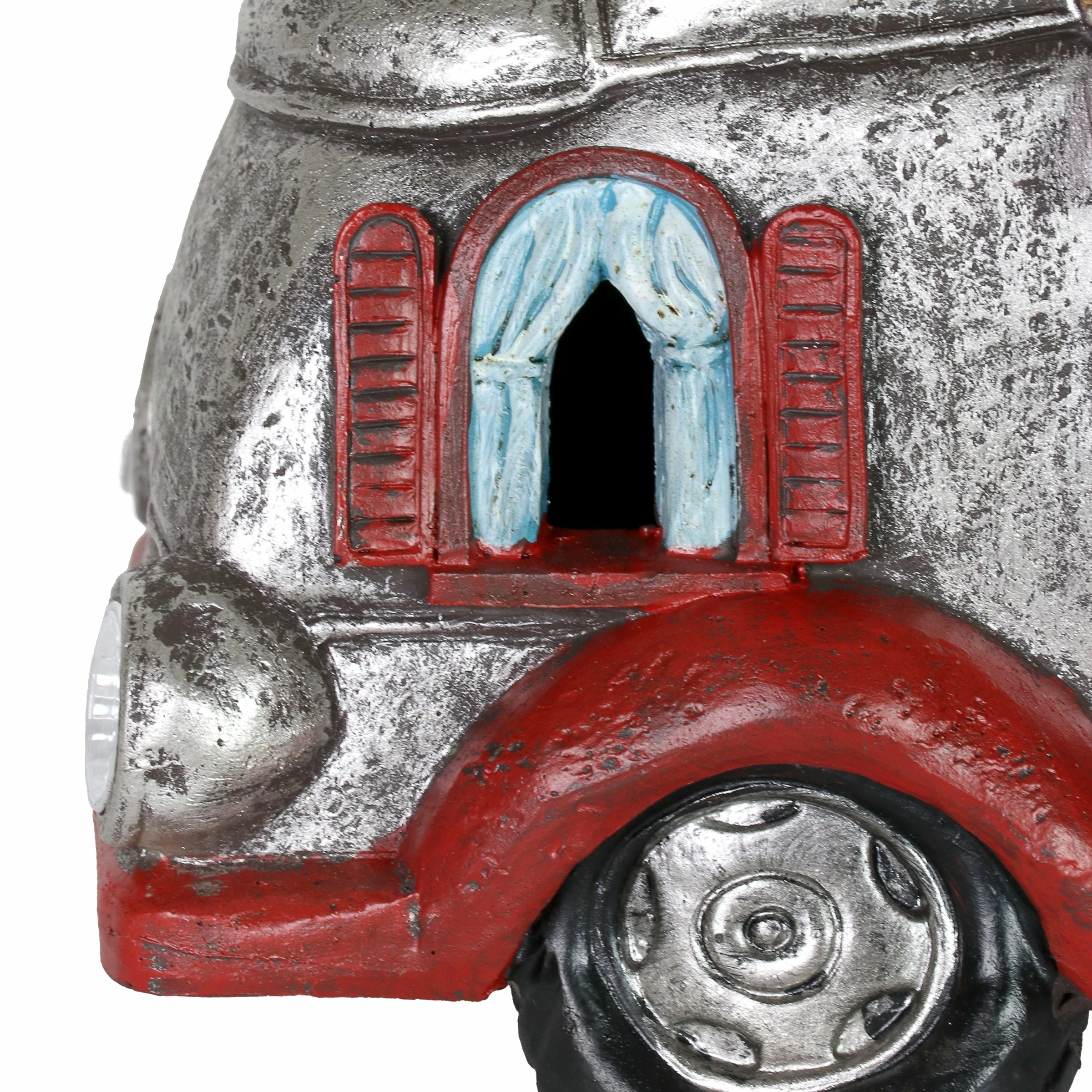 Cruise down memory lane in this charming vintage Solar Red and Silver Retro Camper Garden Statue! Its beautiful hand painted details include a charming potted plant, striped awnings and adorable headlights. Enjoy the glowing solar light as it automatically illuminates at dusk bringing a nostalgic sense of fun to your garden!