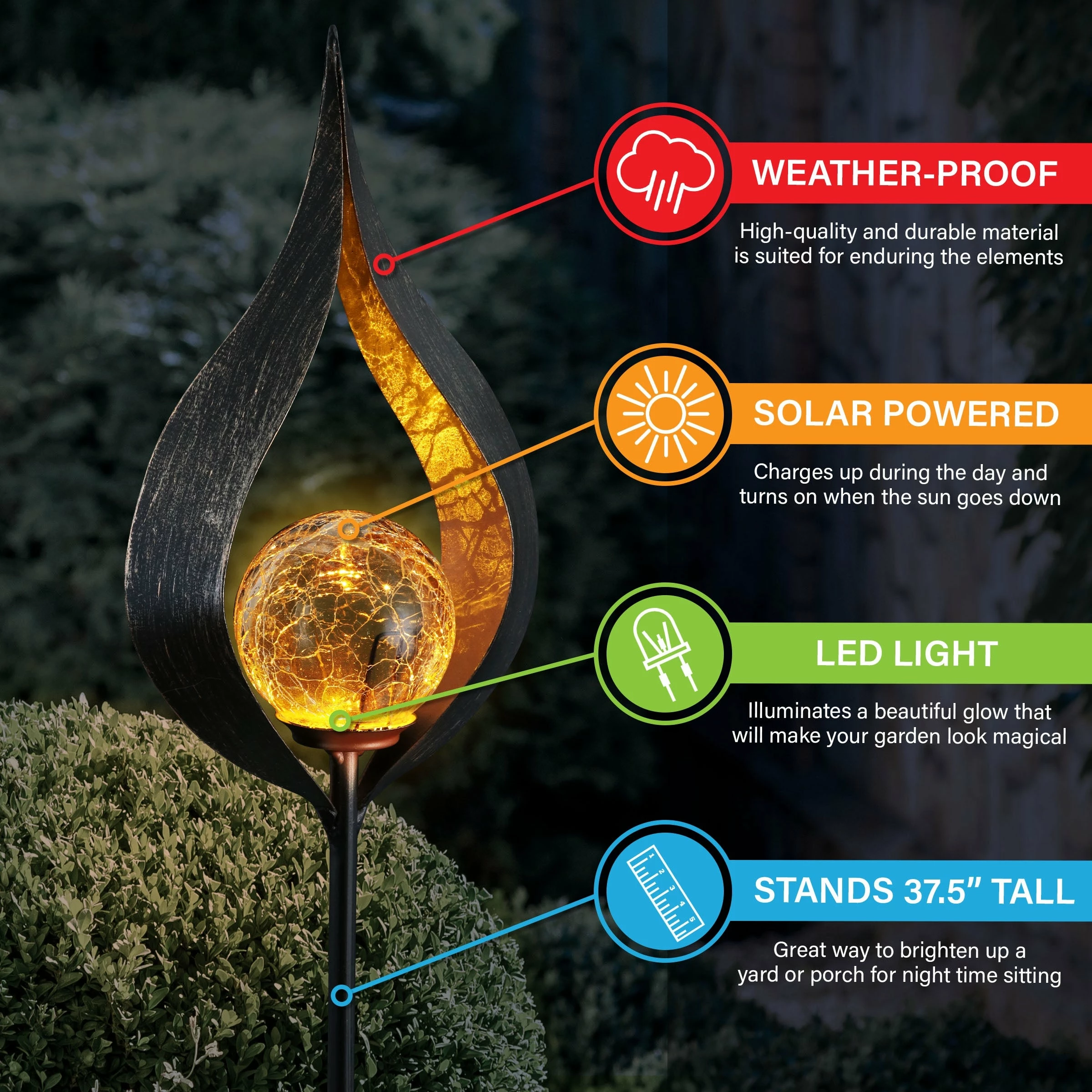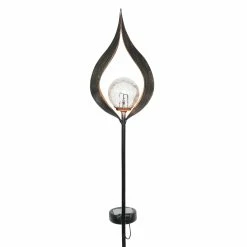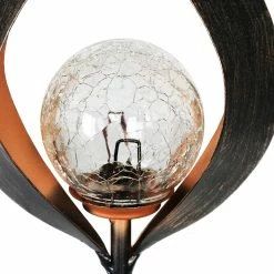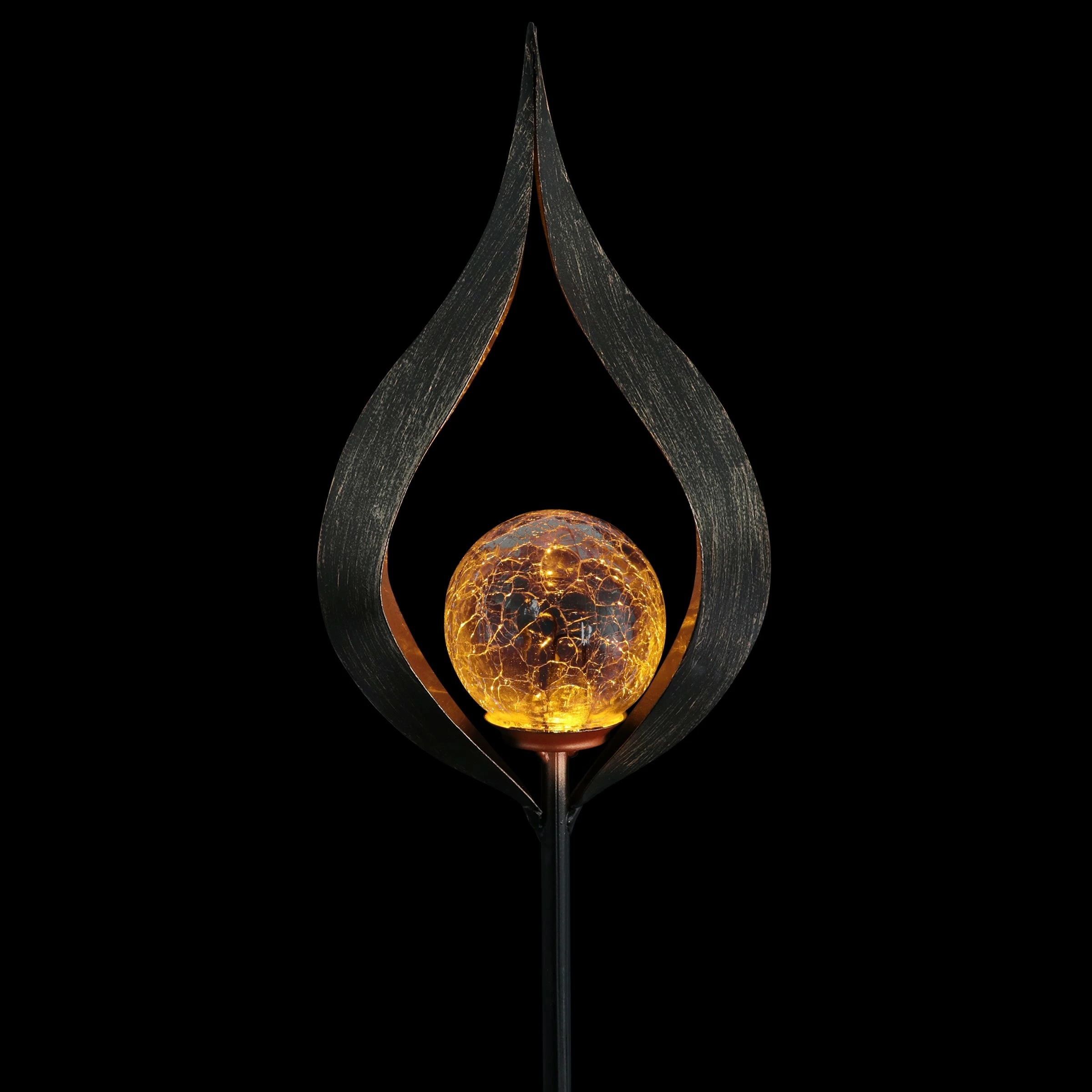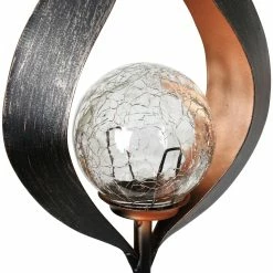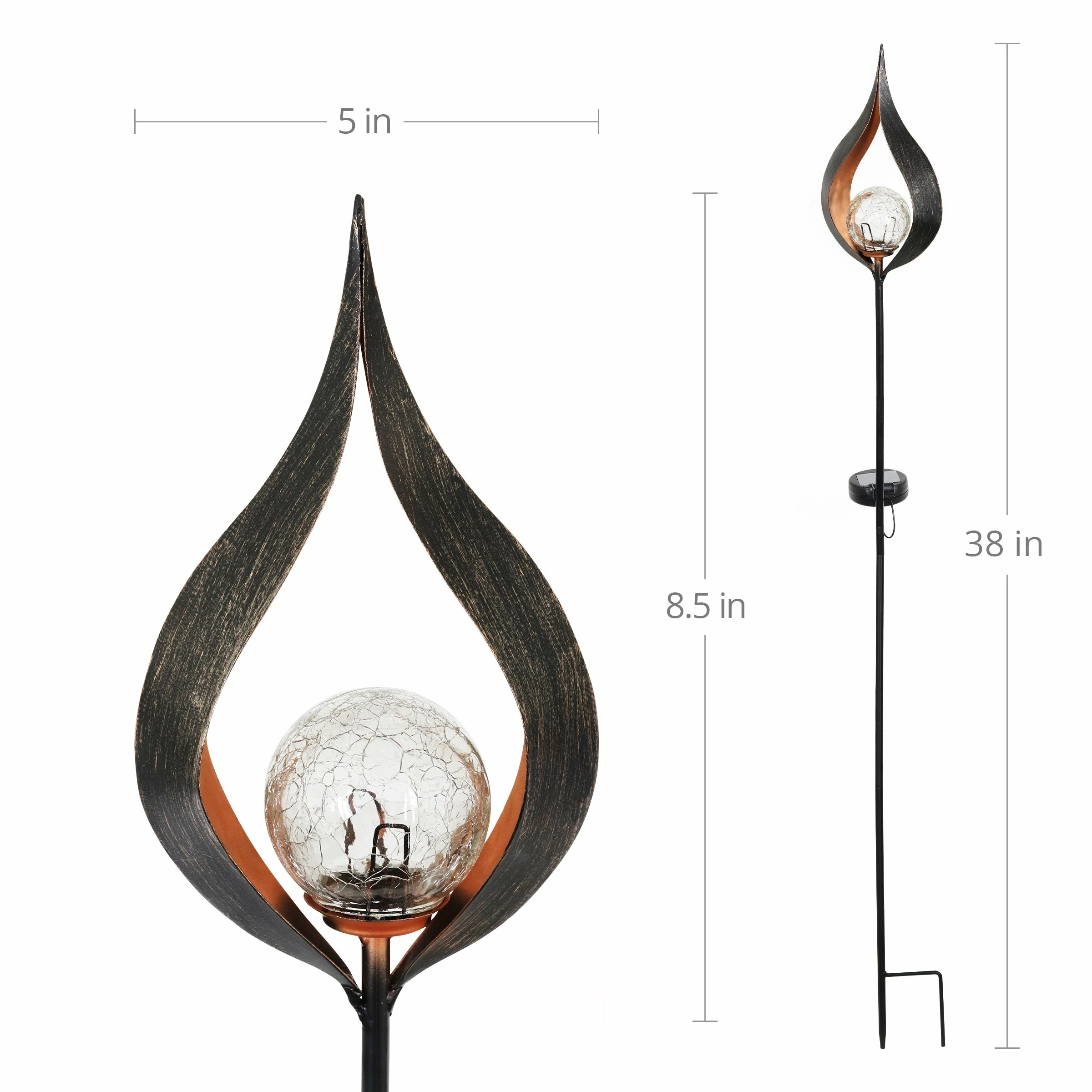 Light your garden with this Solar Torch Garden Stake! Beautifully designed metal with a glass orb with a Solar powered LED light. Enjoy the flickering glow that automatically begins at dusk from the center of this beautiful garden art.