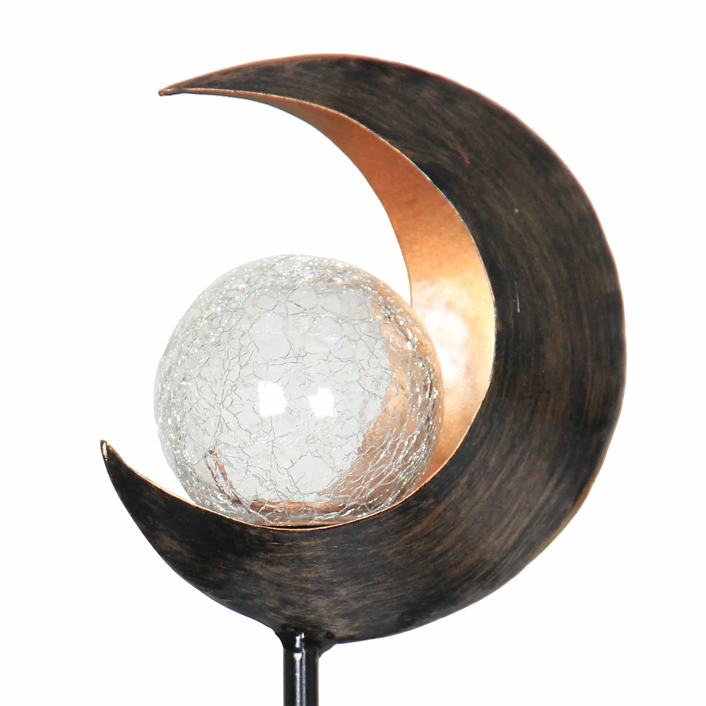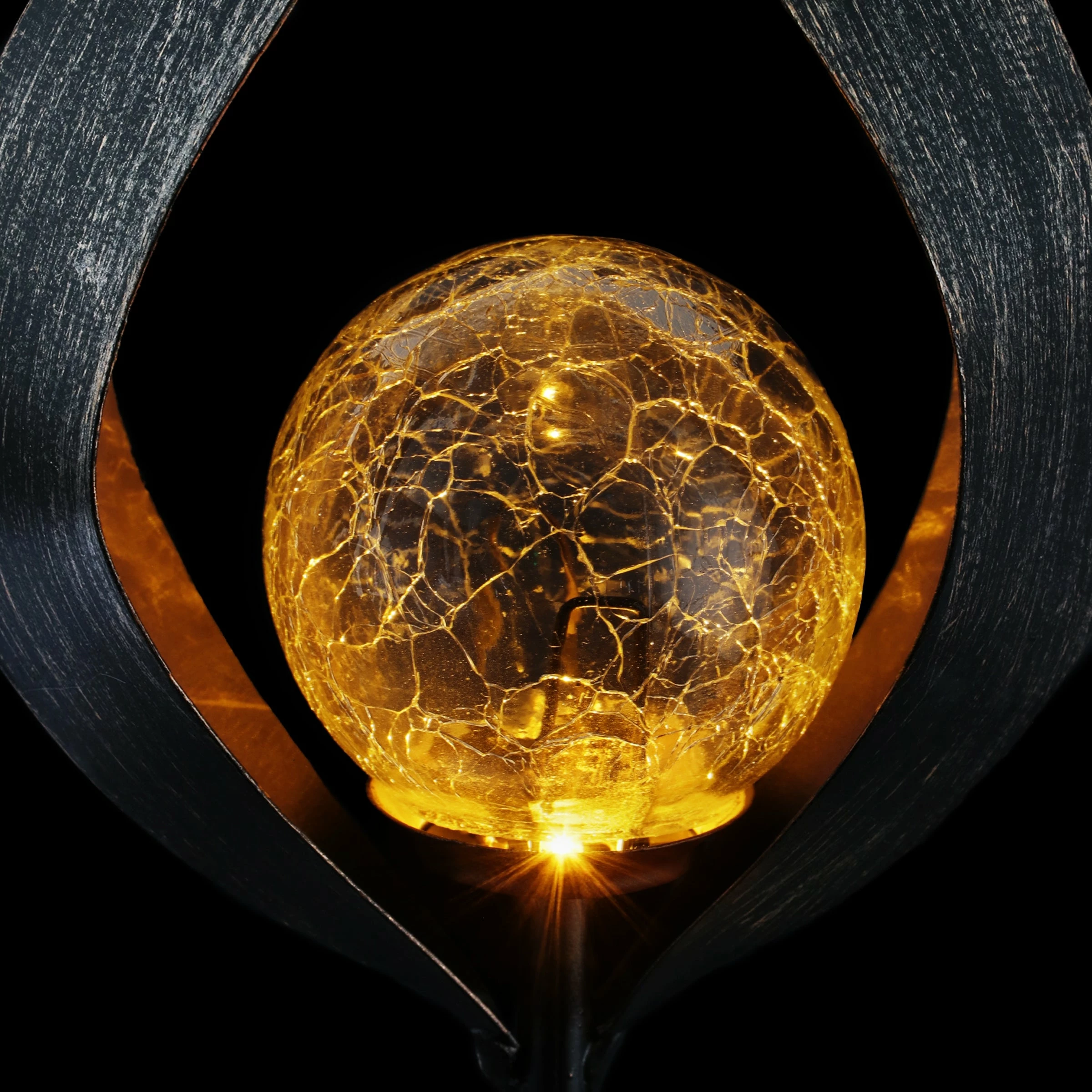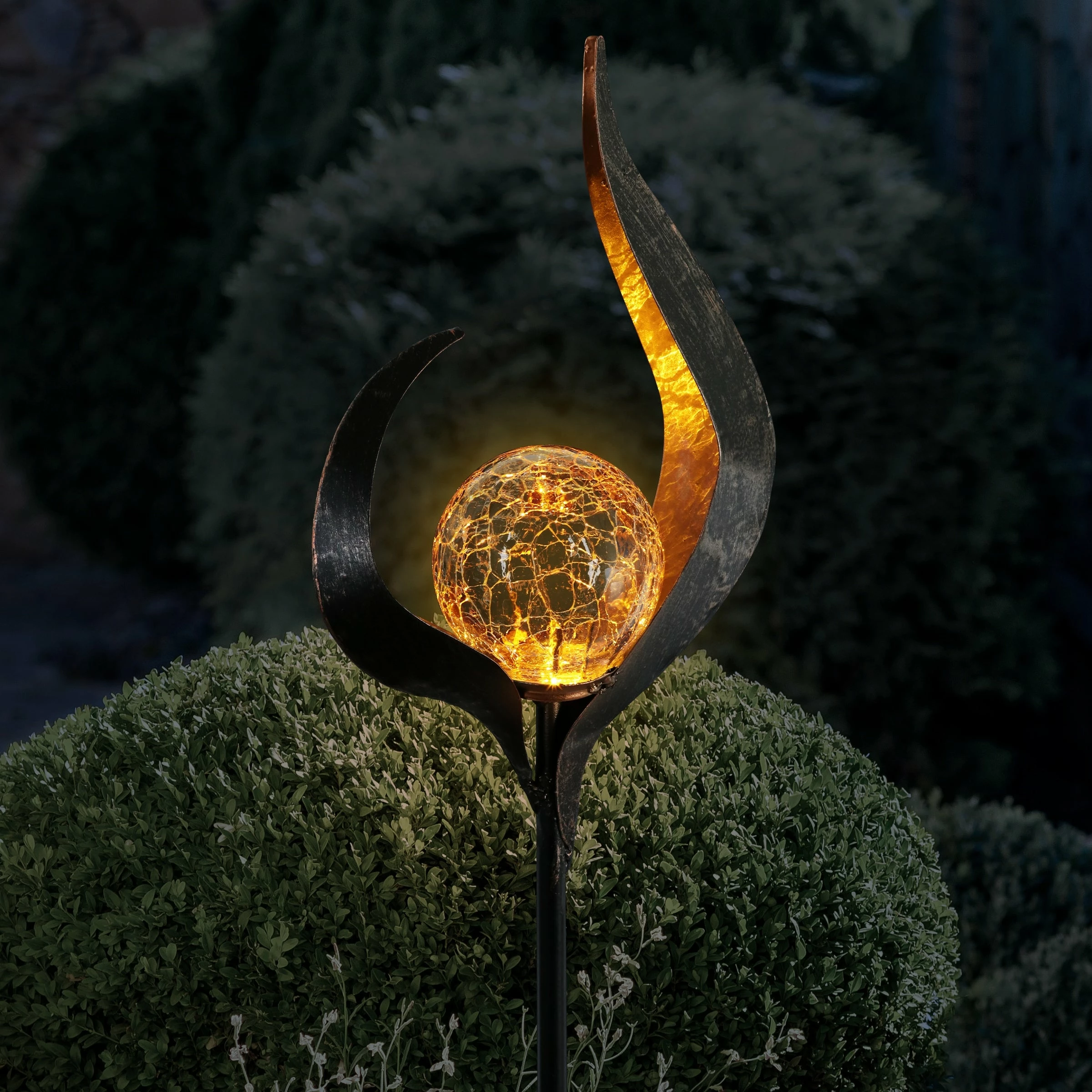 Light your garden with this Solar Torch Garden Stake! Beautifully designed metal with a glass orb with a Solar powered LED light. Enjoy the flickering glow that automatically begins at dusk from the center of this beautiful garden art.