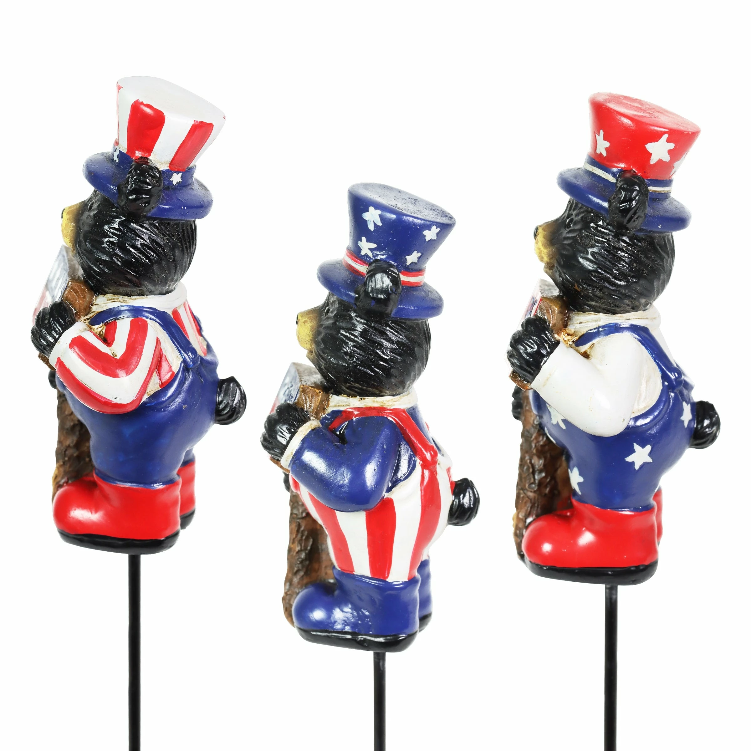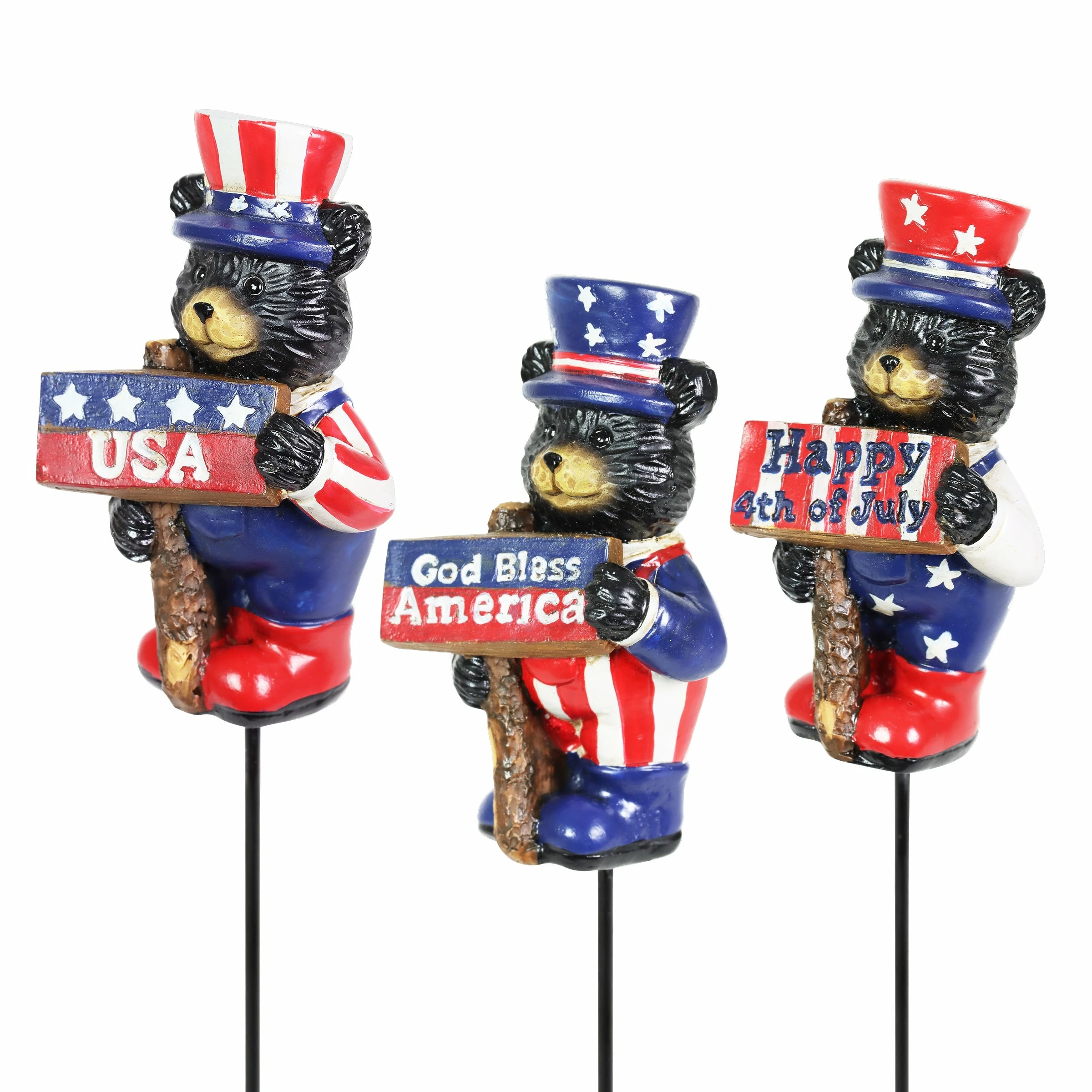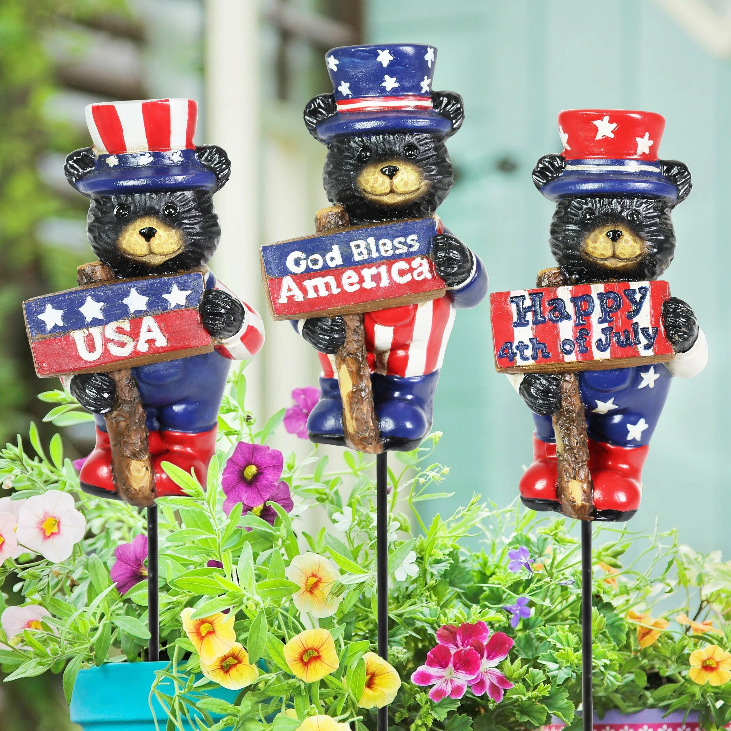 Share your patriotic pride with these adorable hand painted USA Bear Pot Stakes. These adorable bears are holding signs that read: “USA”, “God Bless America” and “Happy 4th of July”. These beautifully detailed stakes are pieces art, adding color and personality to any potted plant while imparting your American pride!