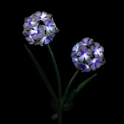 Enjoy the full bloom and decorative glow of this gorgeous double solar hydrangea garden stake day and night! At dusk, 34 solar-powered LED lights will automatically illuminate the beautifully hand-painted flowers. Add an instant touch of color, light and elegance to your garden. Makes a fabulous gift that’s always in bloom!