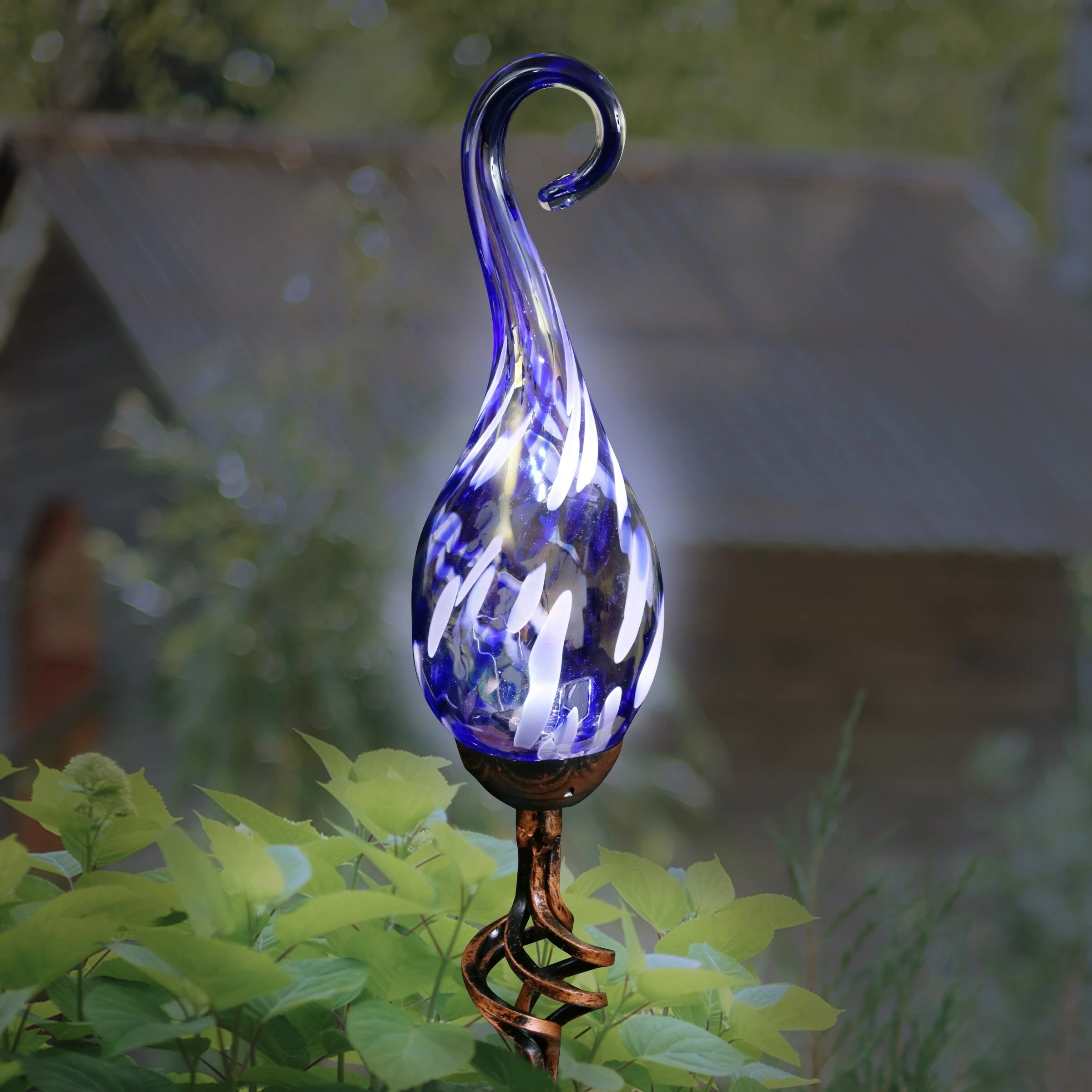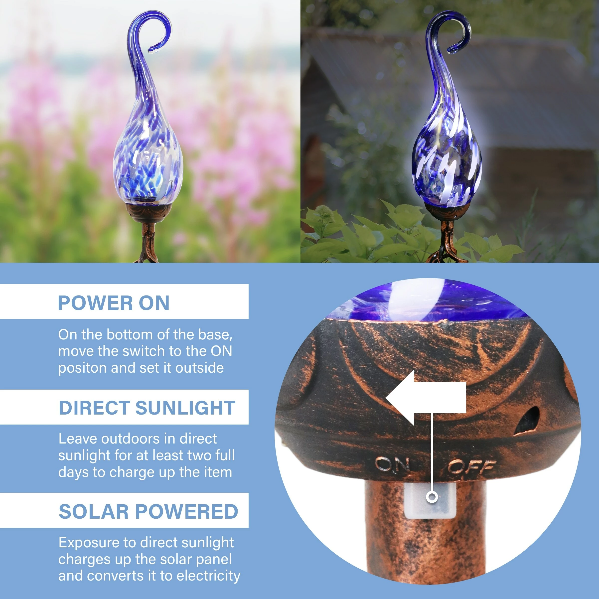 - Solar powered LED light automatically illuminates the blue glass at dusk