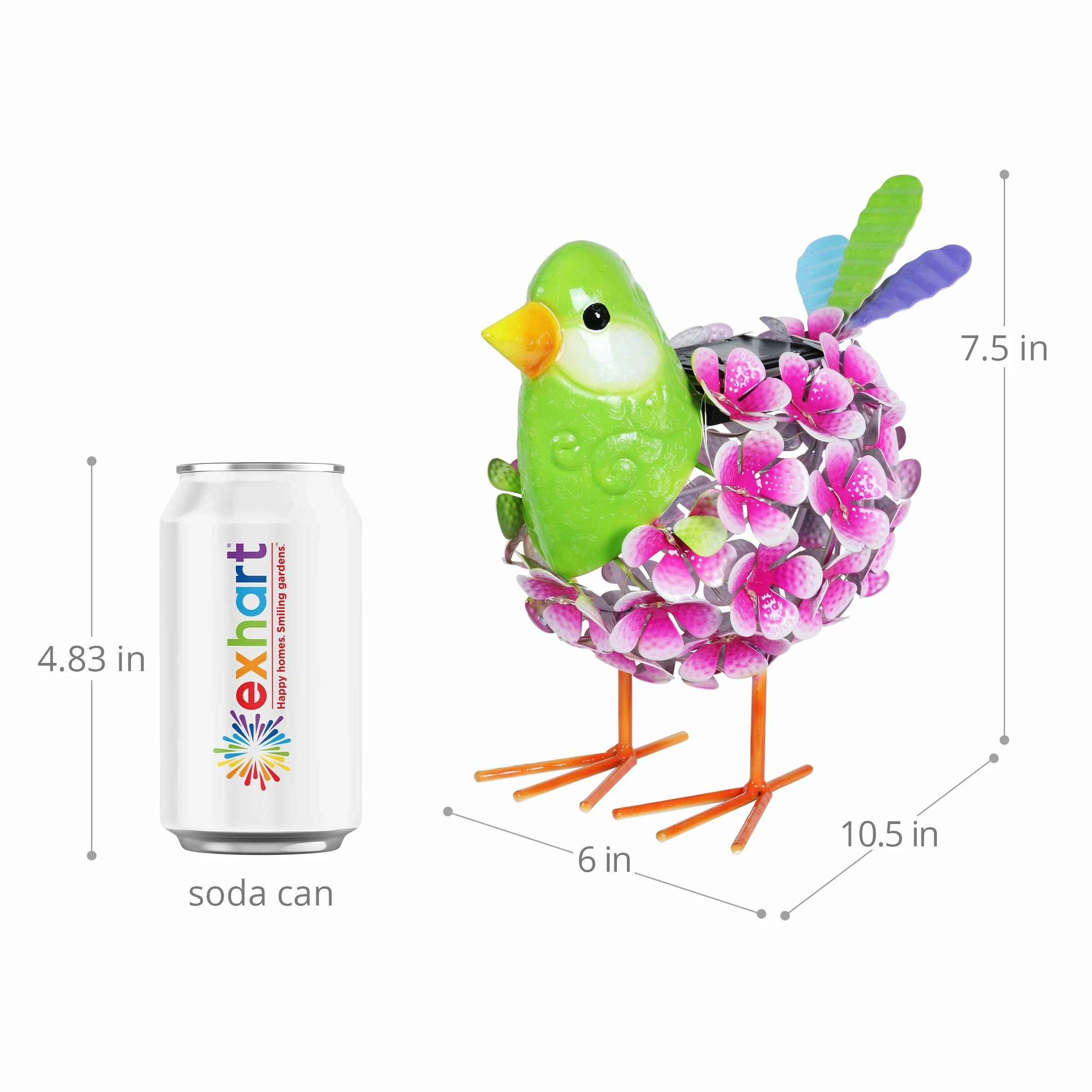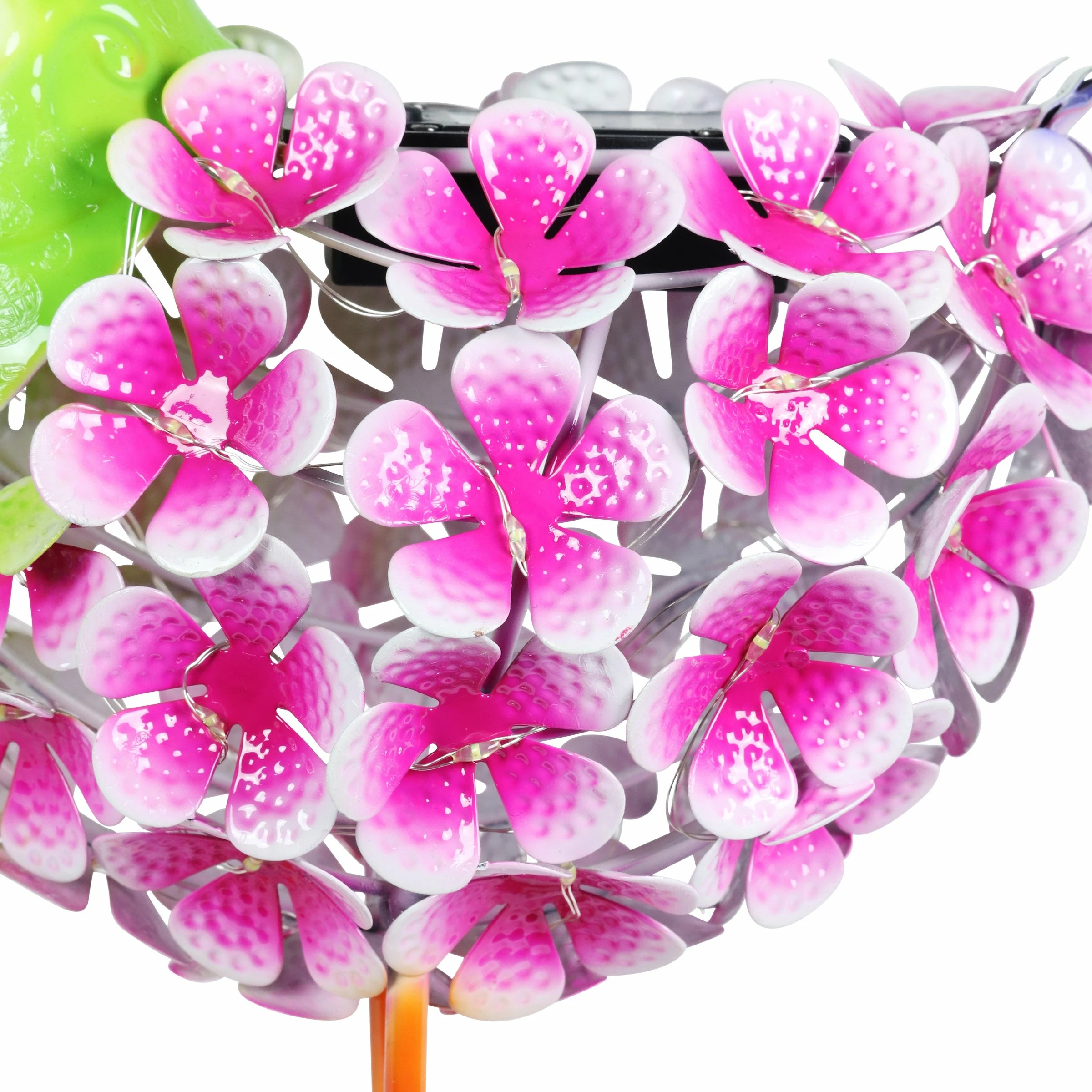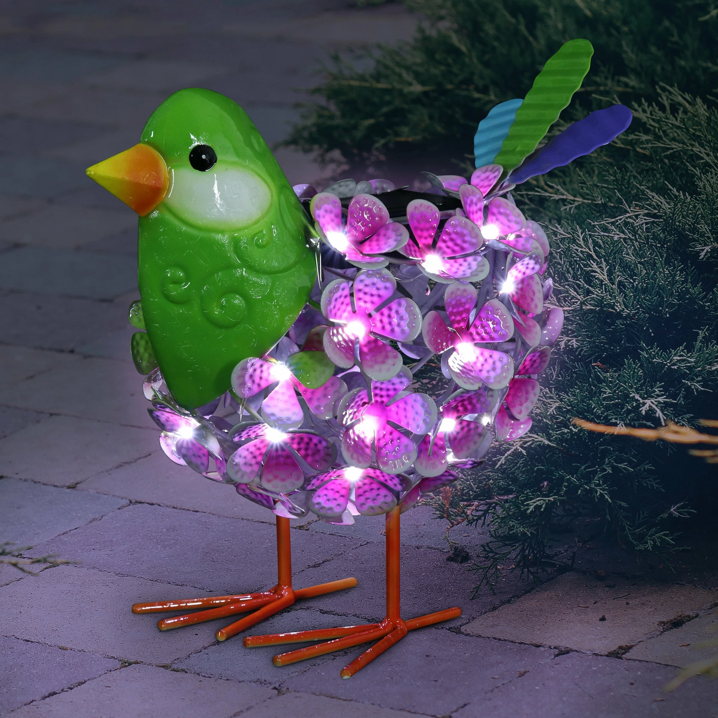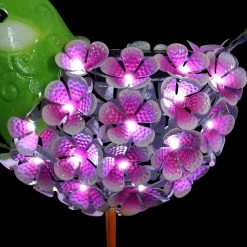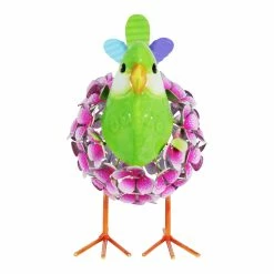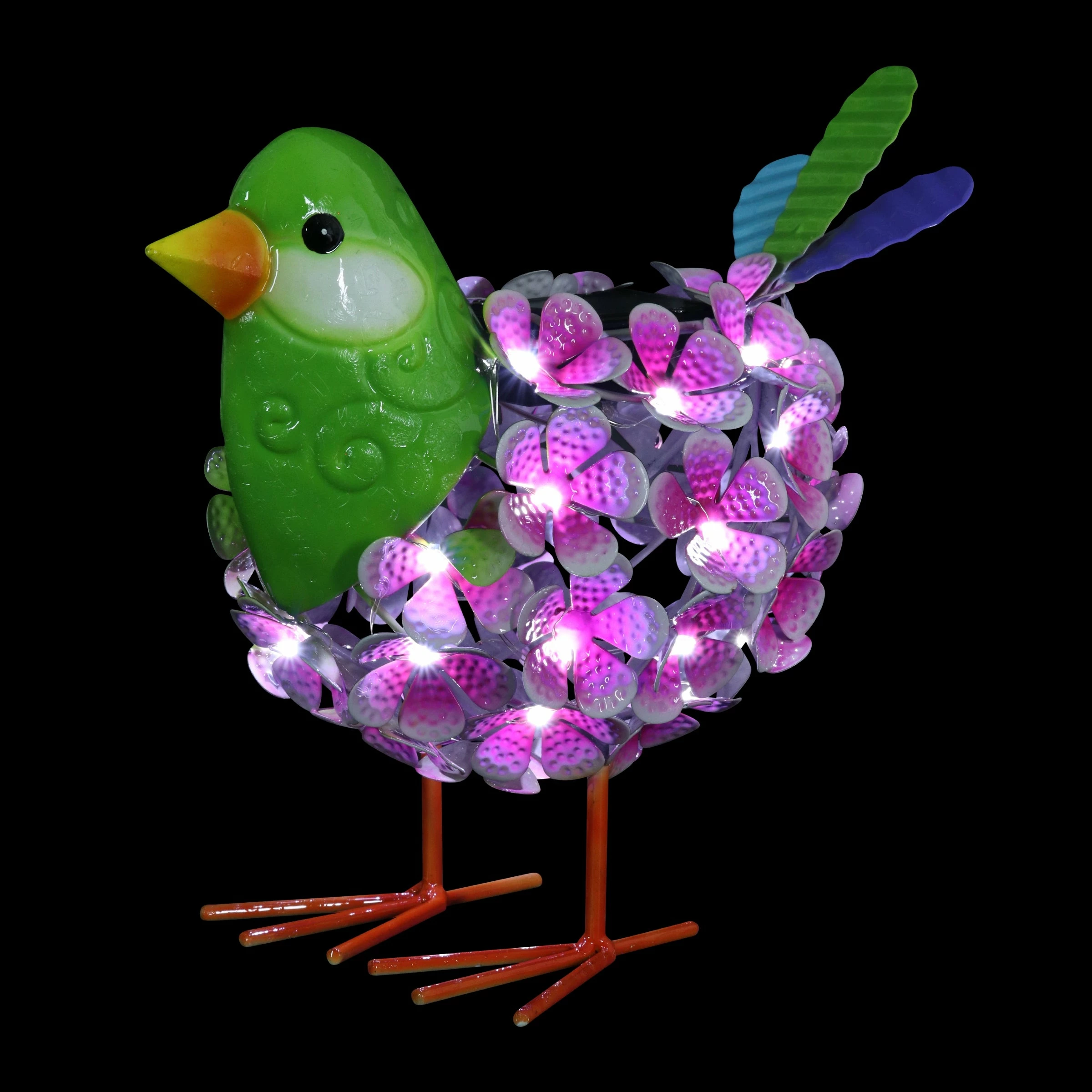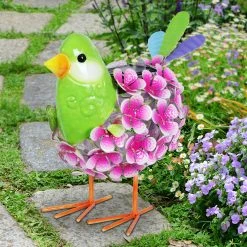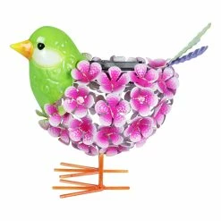 An illuminating solar pink and green bird statue adds charm and warmth to any garden! The metal body is constructed from hand painted flowers interspersed with 38 LED lights that will automatically glow at dusk! This adorable garden statuary makes a wonderful addition to any yard and a fabulous gift idea too.