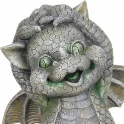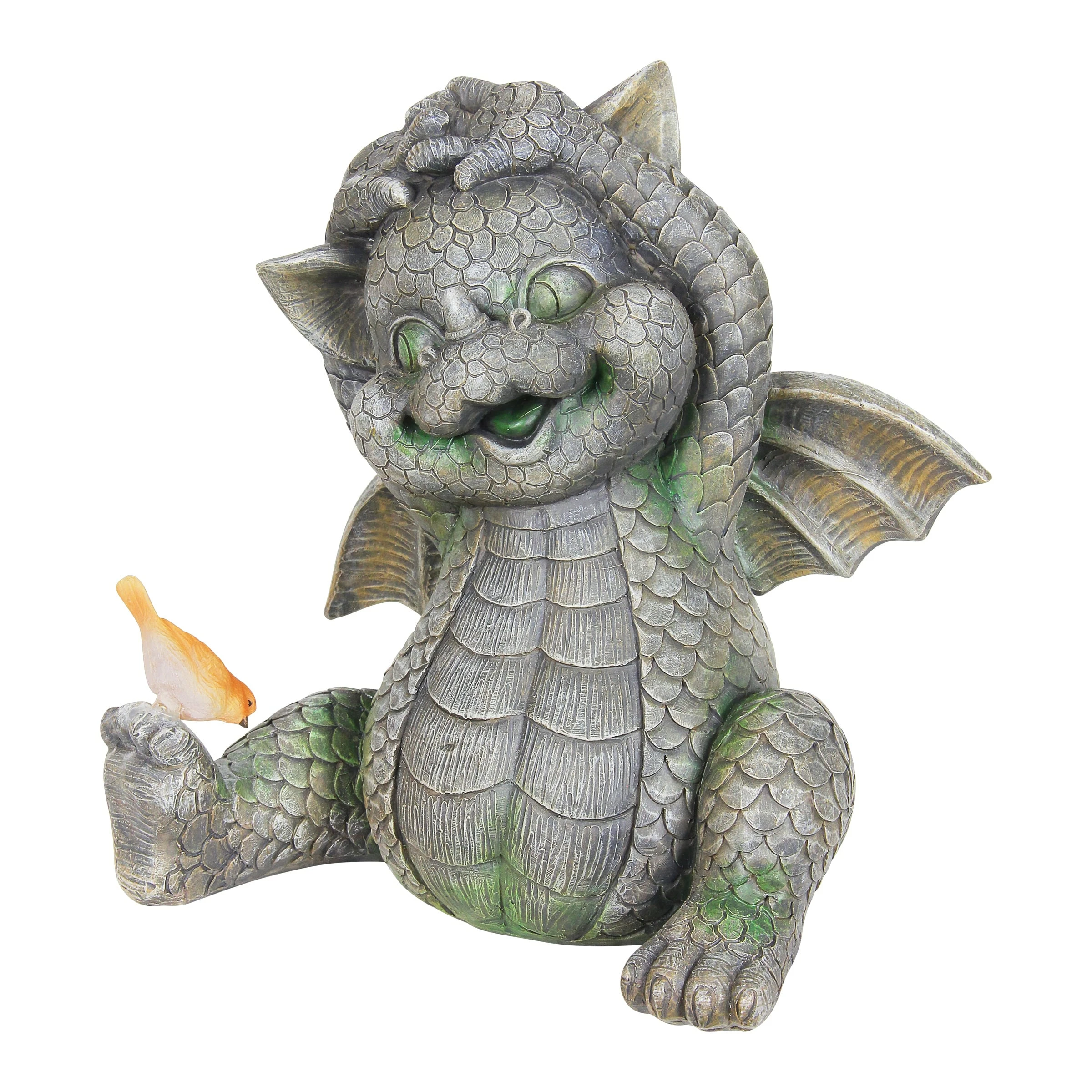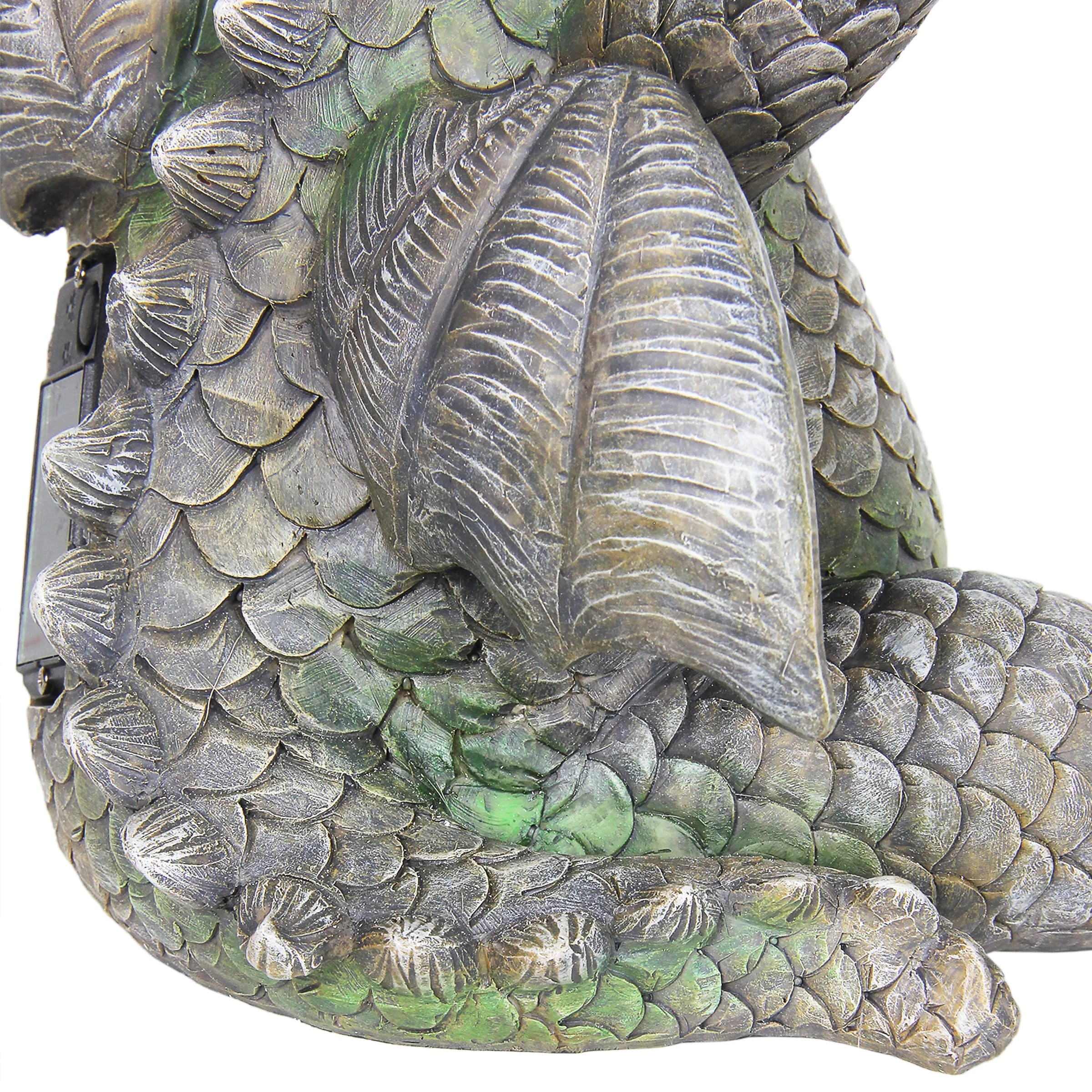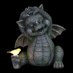 An illuminating bird has landed on an adorable dragon while he performs his morning stretches! This beautifully designed solar dragon statue adds magical charm to any garden. The solar powered LED light in the little bird will automatically glow at dusk with the prefect touch of light to bring this gorgeous art to life. Constructed from durable resin and painted to look like heavy stone, this statue makes a wonderful addition to any yard and a fabulous gift idea too.