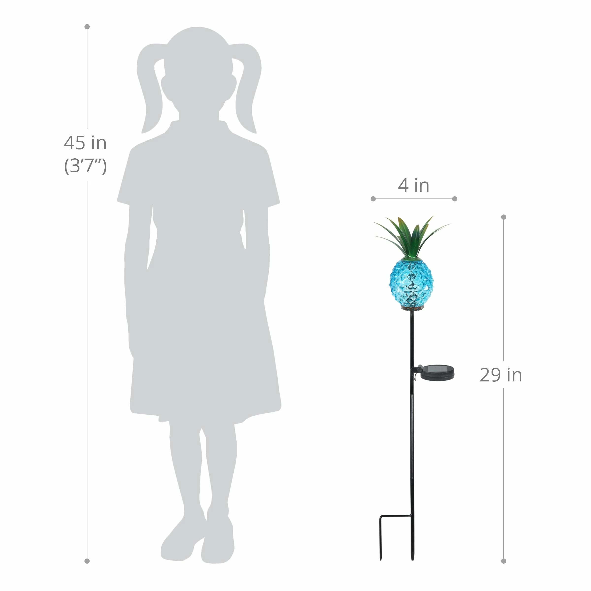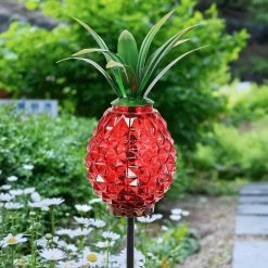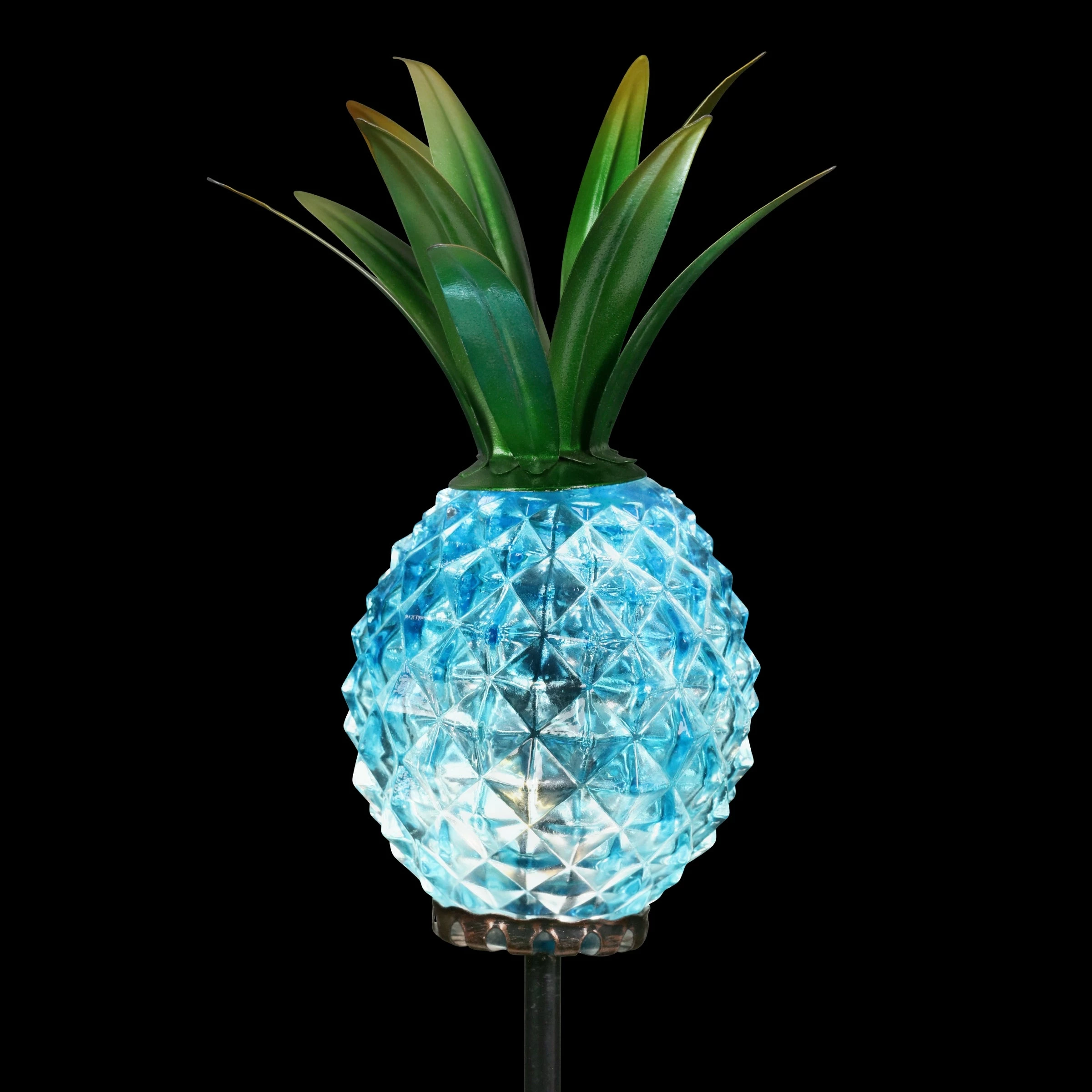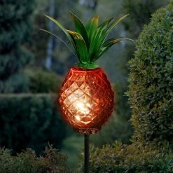 A symbol of fun and hospitality, this illuminating Pineapple Garden Stake will light the way in your garden! The Solar powered LED light automatically glows from within at night. Textured hand blown glass and metal leafy crown give the pineapple a realistic touch and a designer flair. Makes a wonderful gift as well!