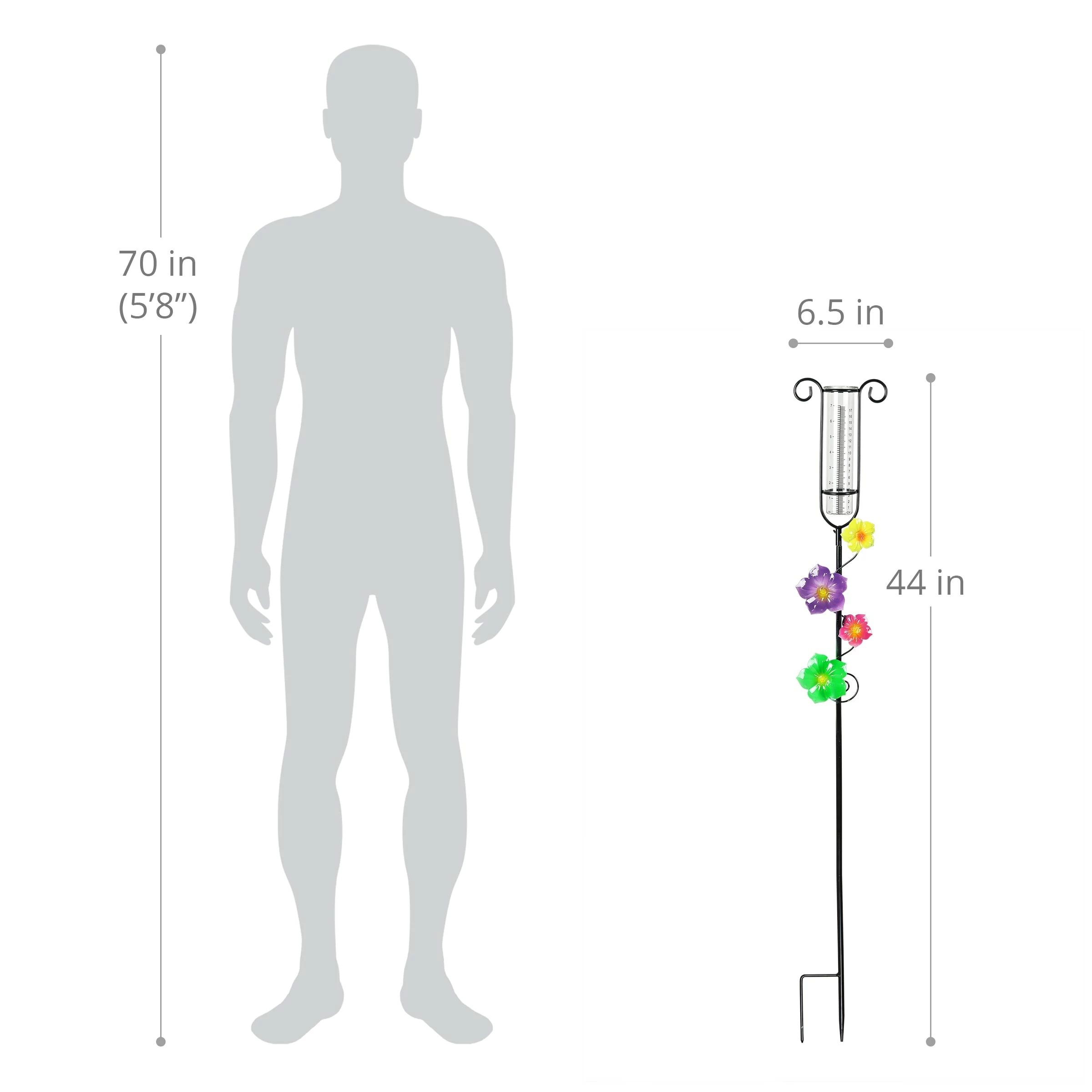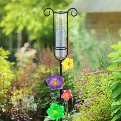 Beautifully hand painted flowers adorn this elegant Glass and Metal Rain Gauge Garden Stake. The easy-to-read rain gauge stake combines elegant style and practical function! Makes a beautiful gift for the gardener in your life and a fun addition to any home.