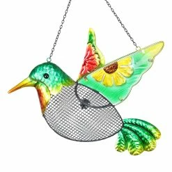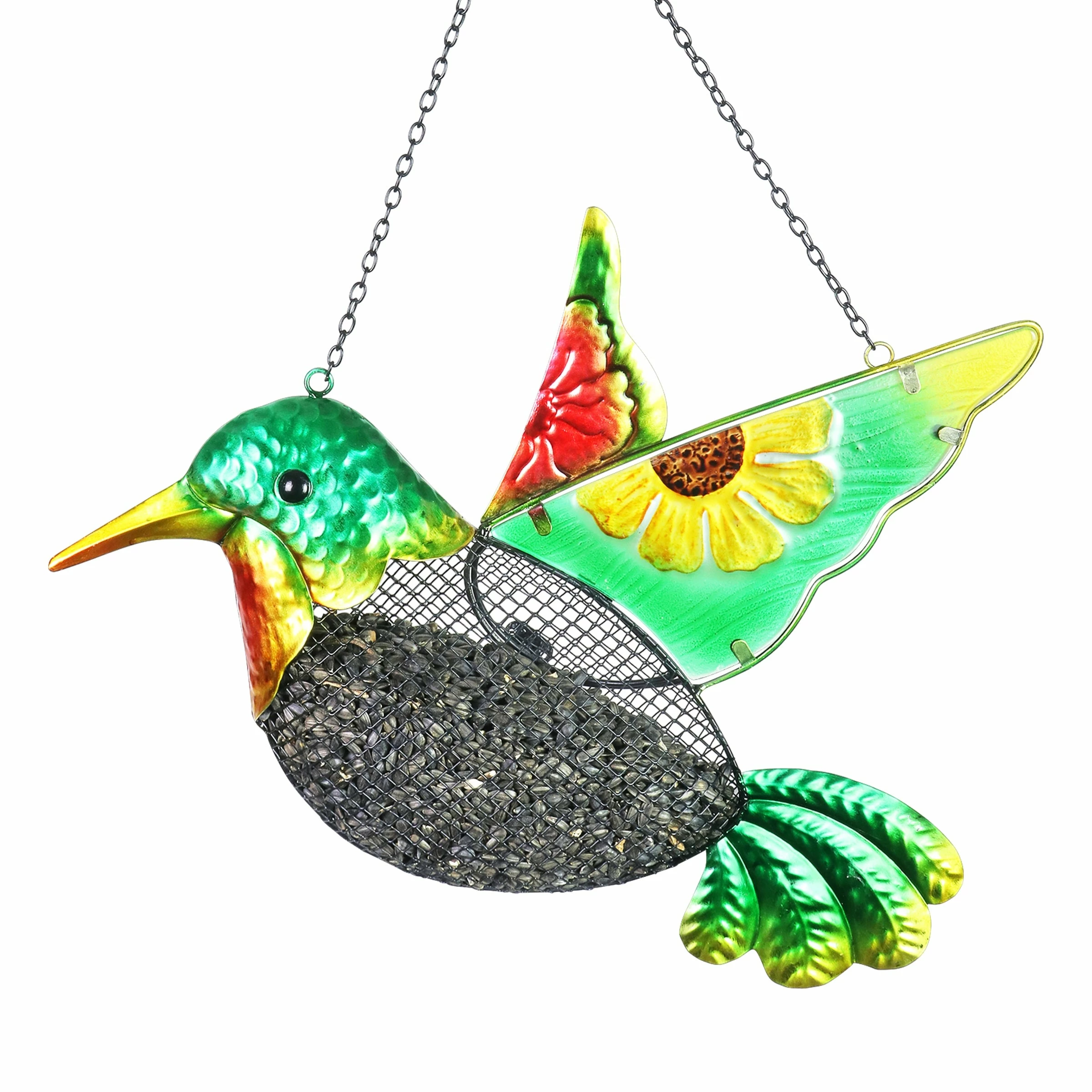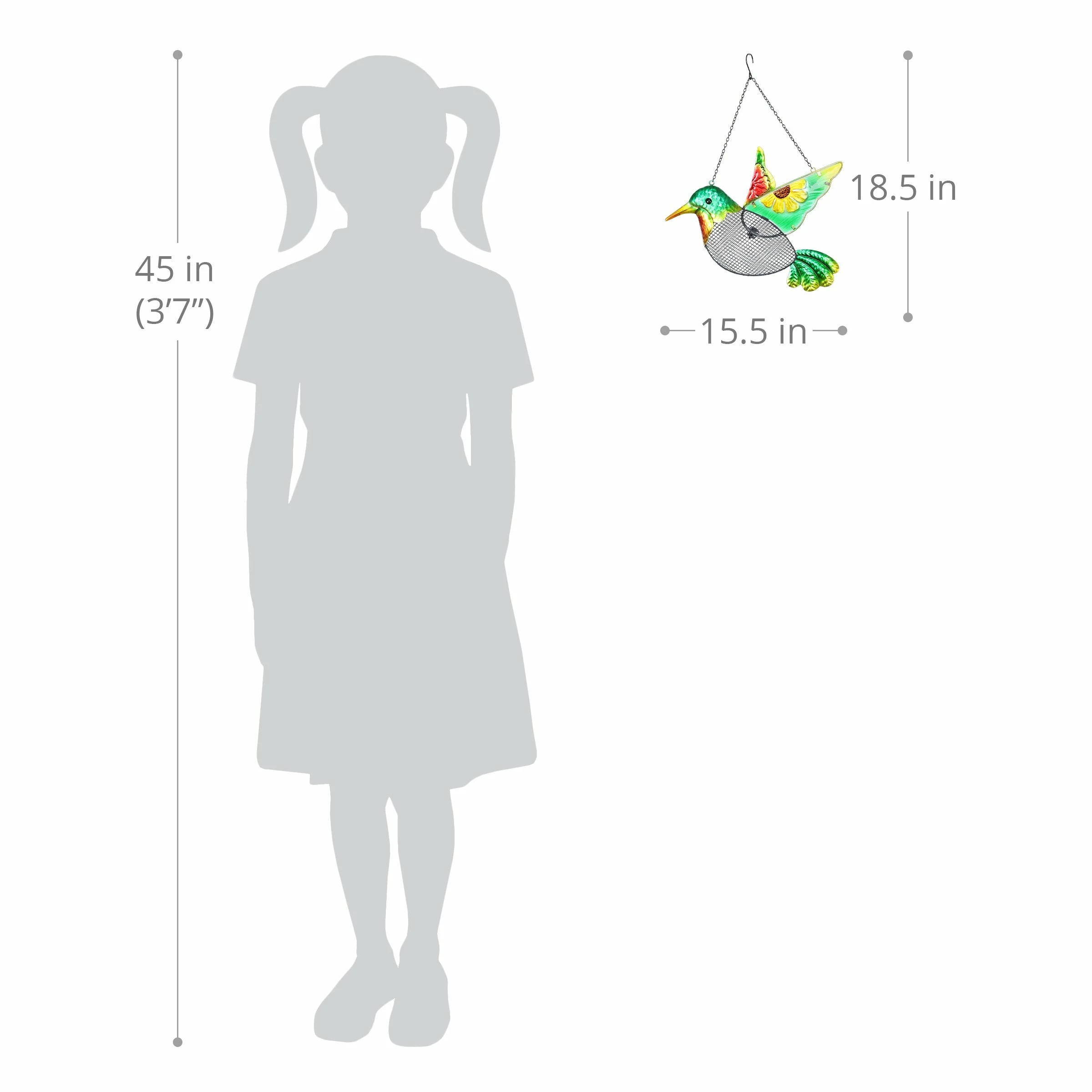 Create a welcoming space birds will love to visit with a beautiful hanging bird feeder! Birds will flock from near and far to feed from this colorfully hand-painted hummingbird bird feeder. Feeder easily hangs from it’s chain anywhere you wish to place it: a patio, awning, tree branch, shepard’s hook and more. This piece is crafted in durable metal, painted in colorful metallic paint and UV treated to resist fading. It convenient metal mesh basket holds the visible birdseed as it welcomes your feathered friends to come enjoy a meal in your garden. Adds instant charm to your yard and makes a wonderful gift for the bird watching enthusiast!