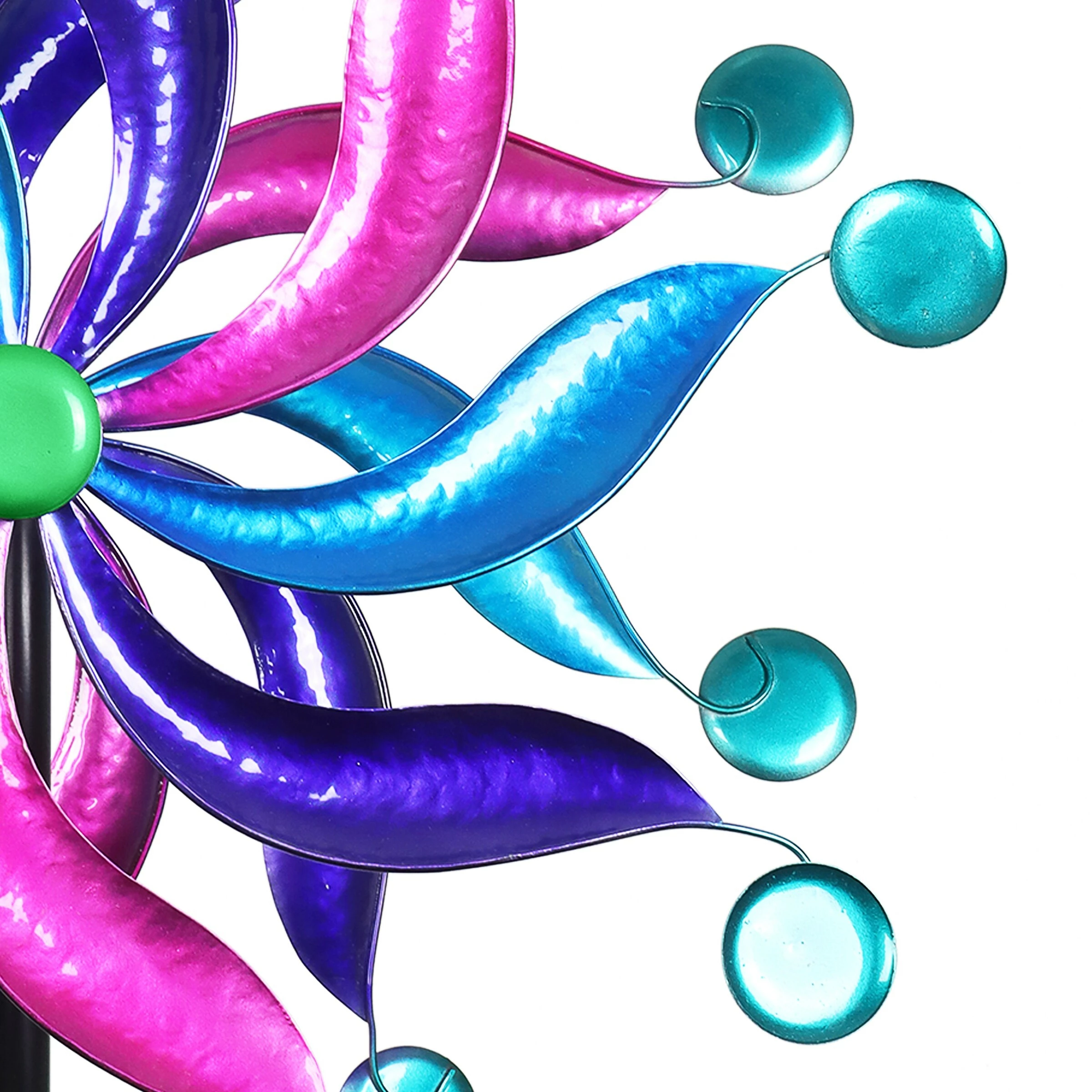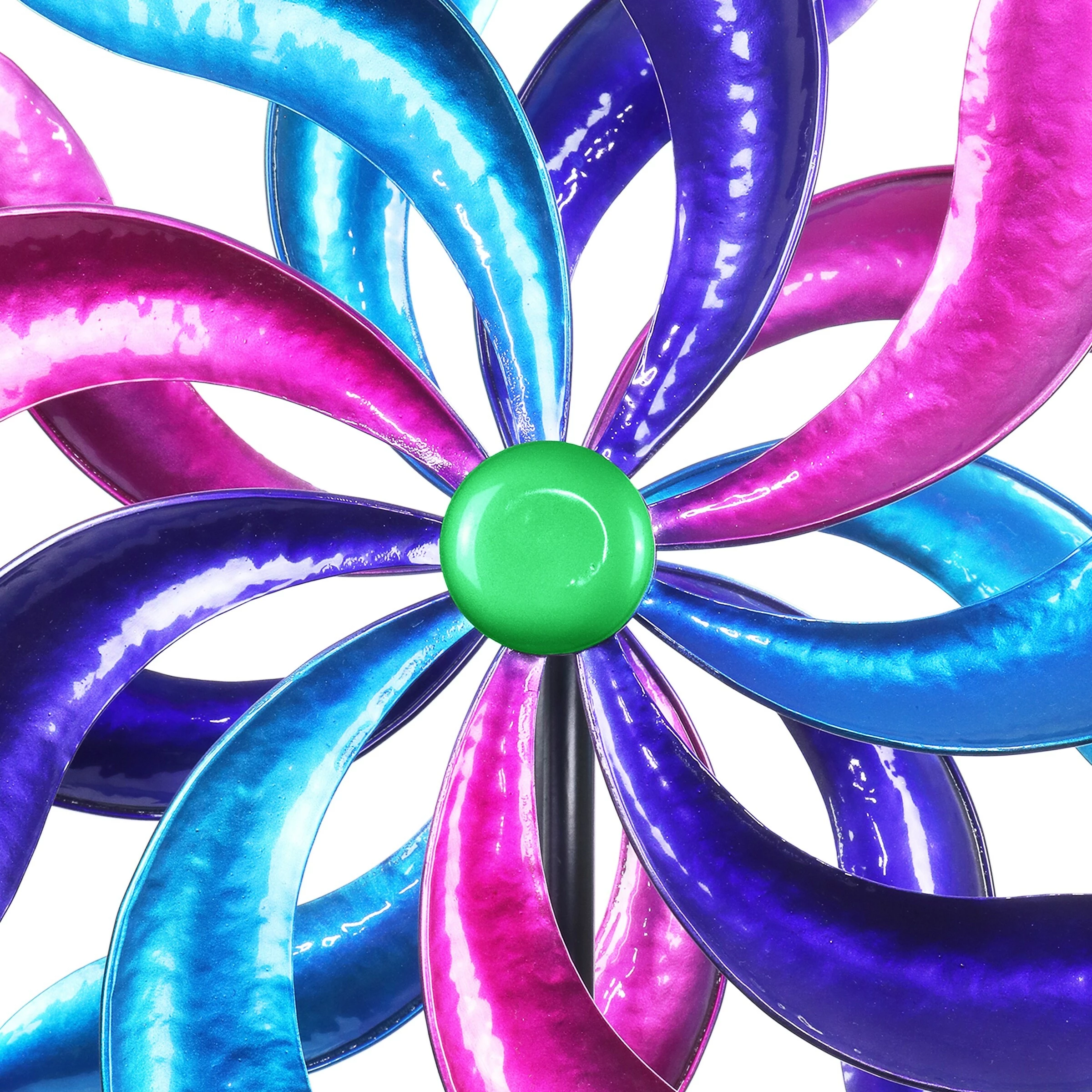 Add an explosion of fun to your garden with this beautifully hand painted Pinwheel Spinner Garden Stake. This elegant kinetic stake is crafted in metal with metallic shades of blues and pink, making this flower a bright and delightful addition to your garden. Guaranteed to make your garden smile!