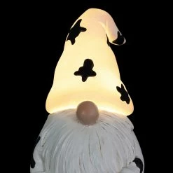 - Solar powered LED light automatically illuminates the gnome’s hat at dusk