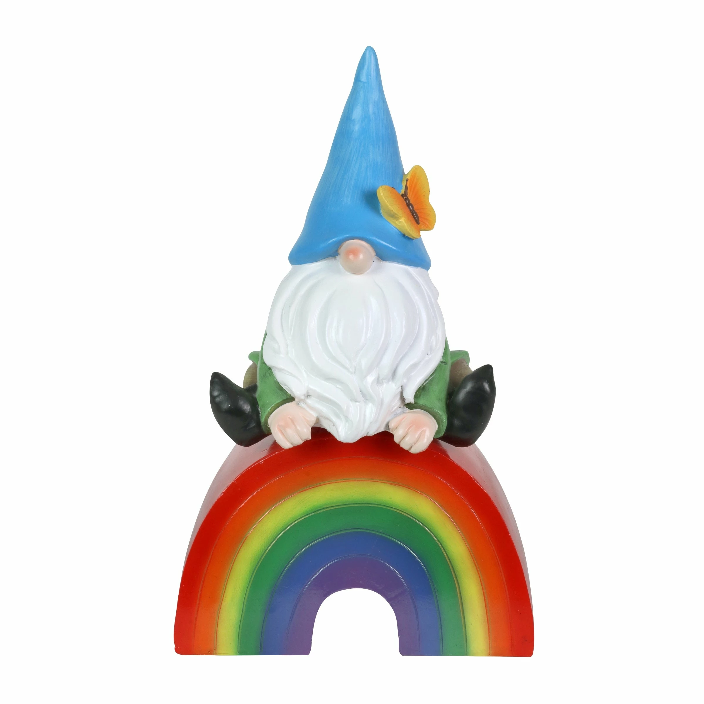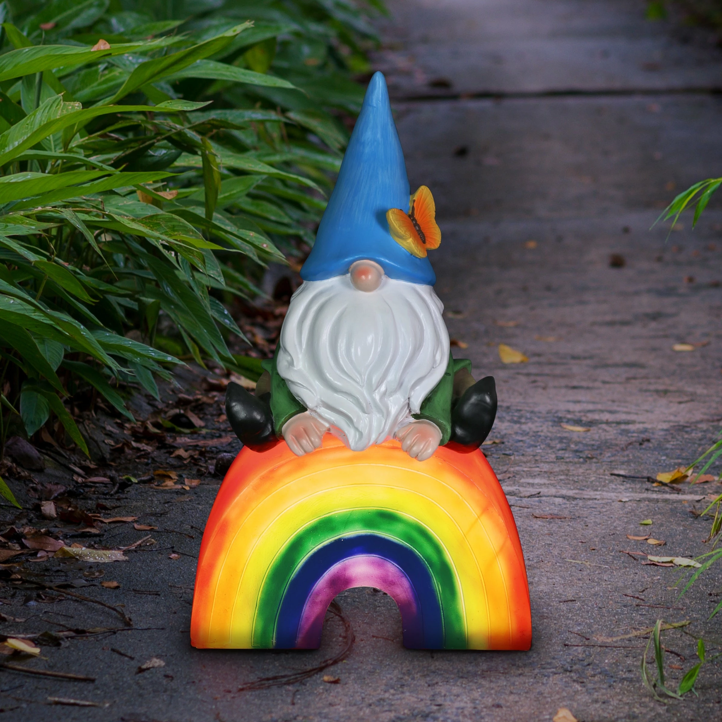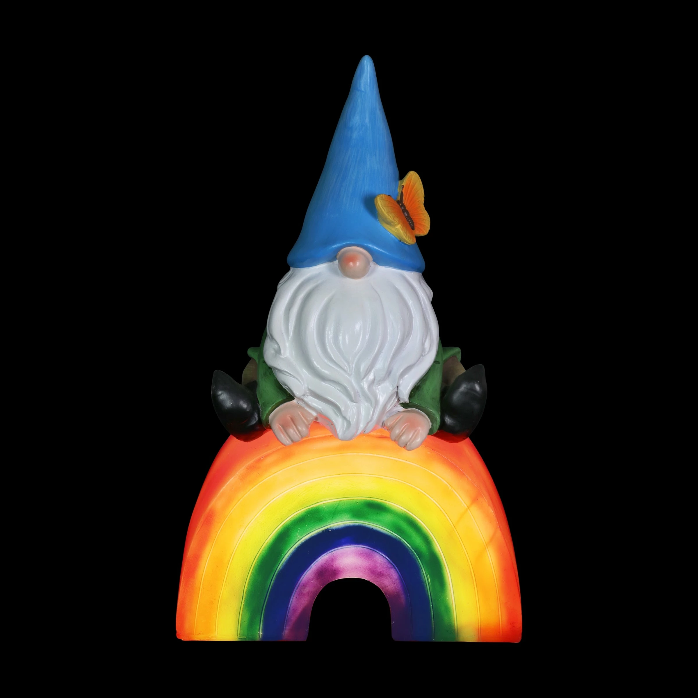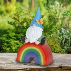 This adorable hand painted garden gnome sits on an illuminating rainbow, spreading the message of love for all! This beautifully crafted statue is on a battery powered timer so you can set the LED light to turn on automatically everyday at your desired hour! Add a touch of whimsy and fun to your home with this charming, beautifully crafted garden art by the Exhart family.