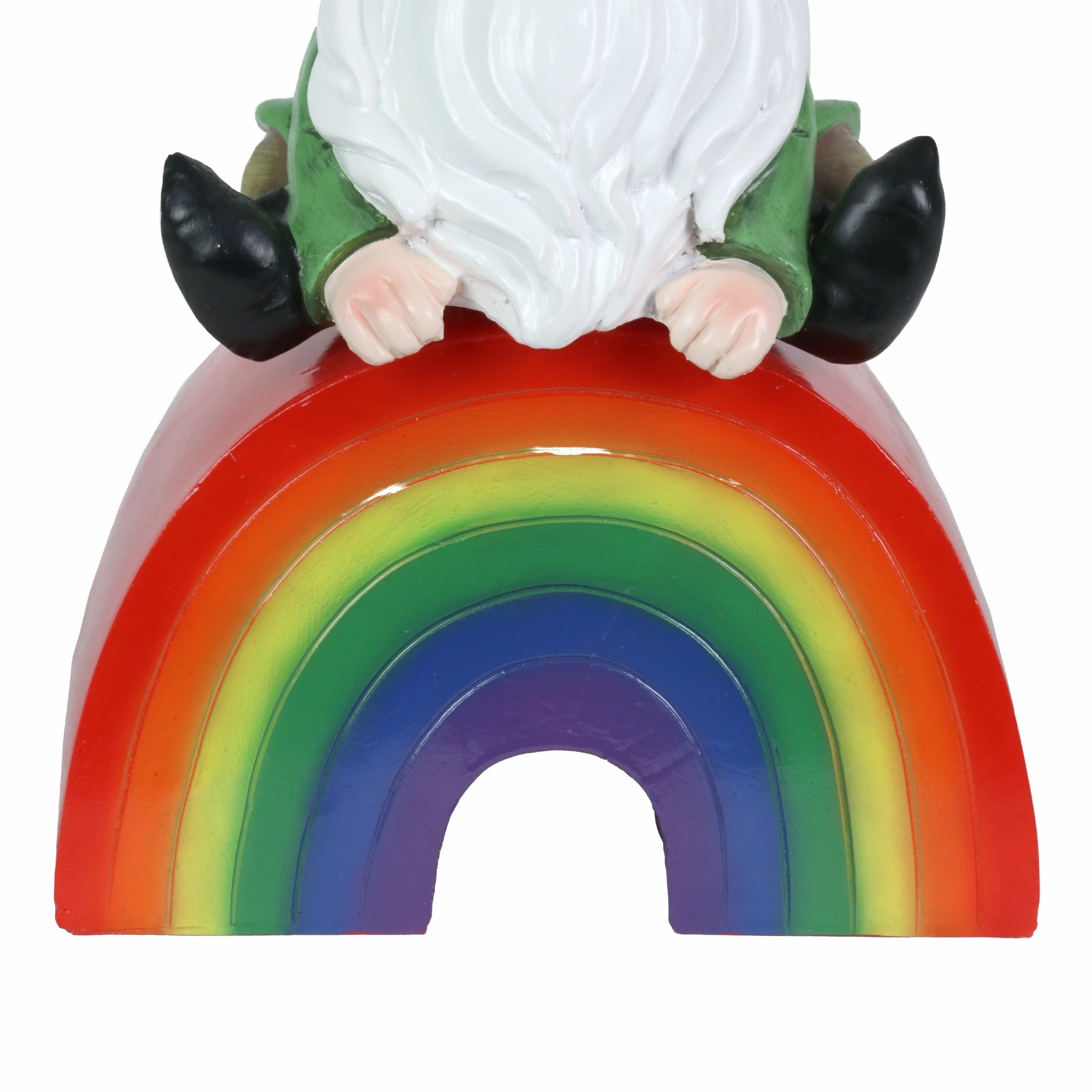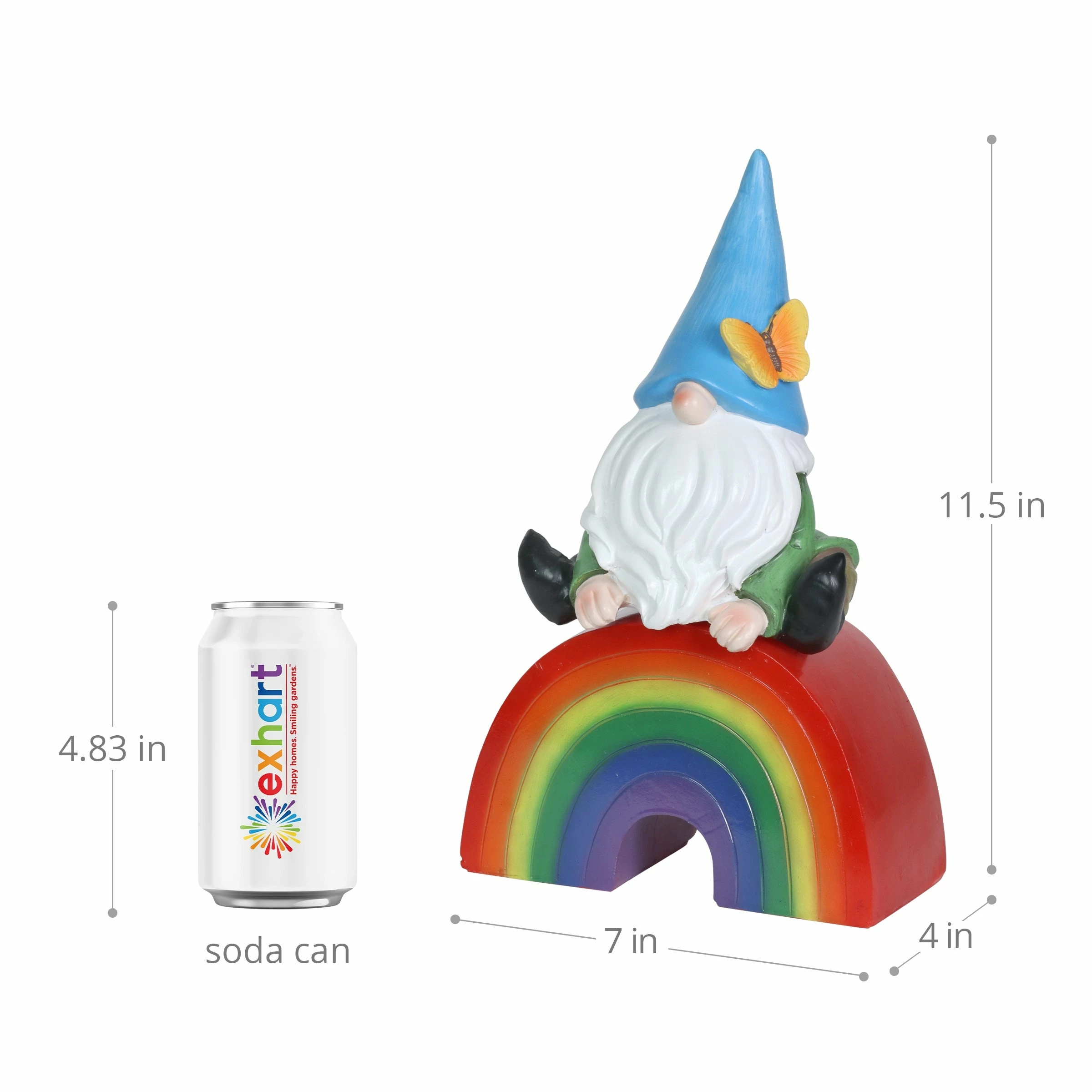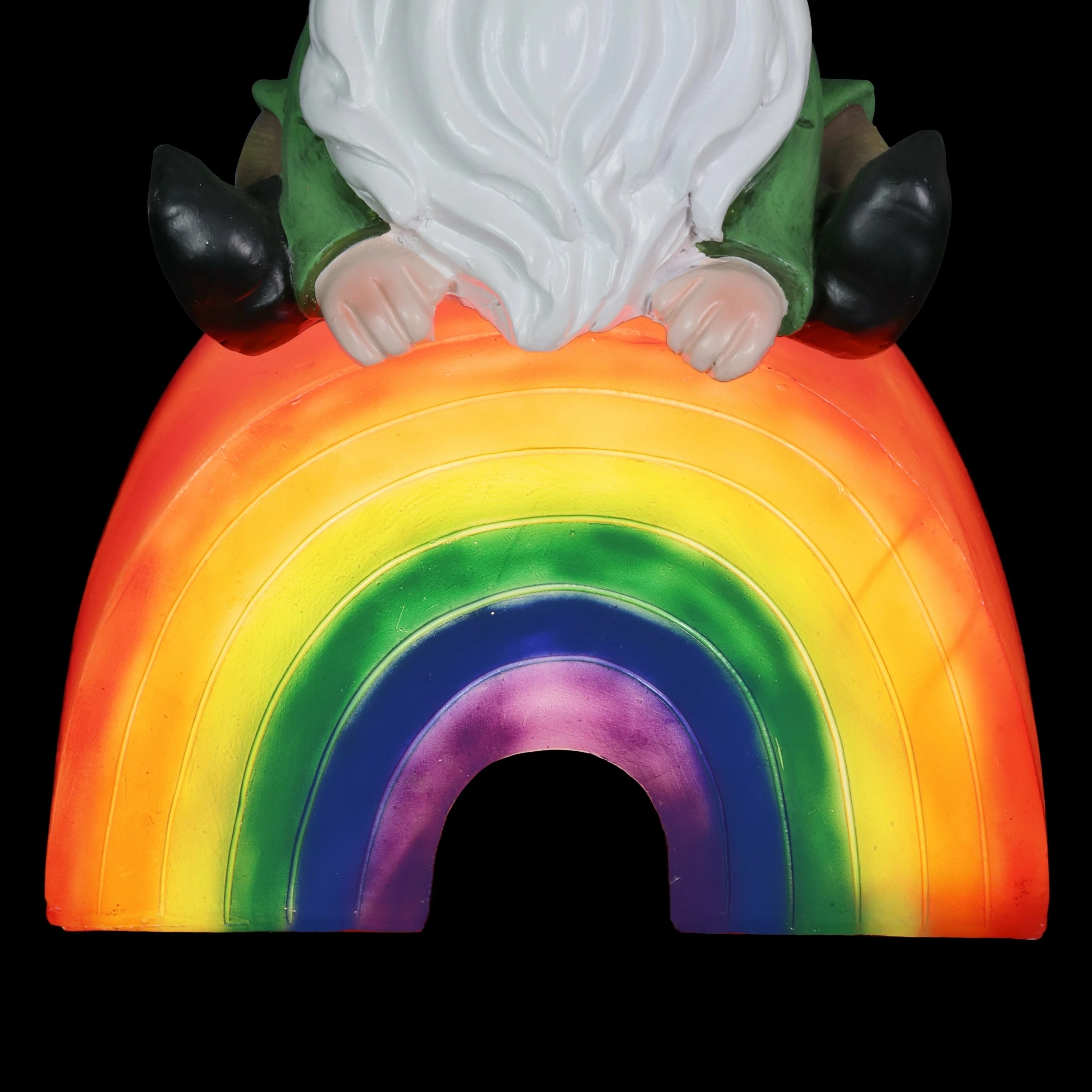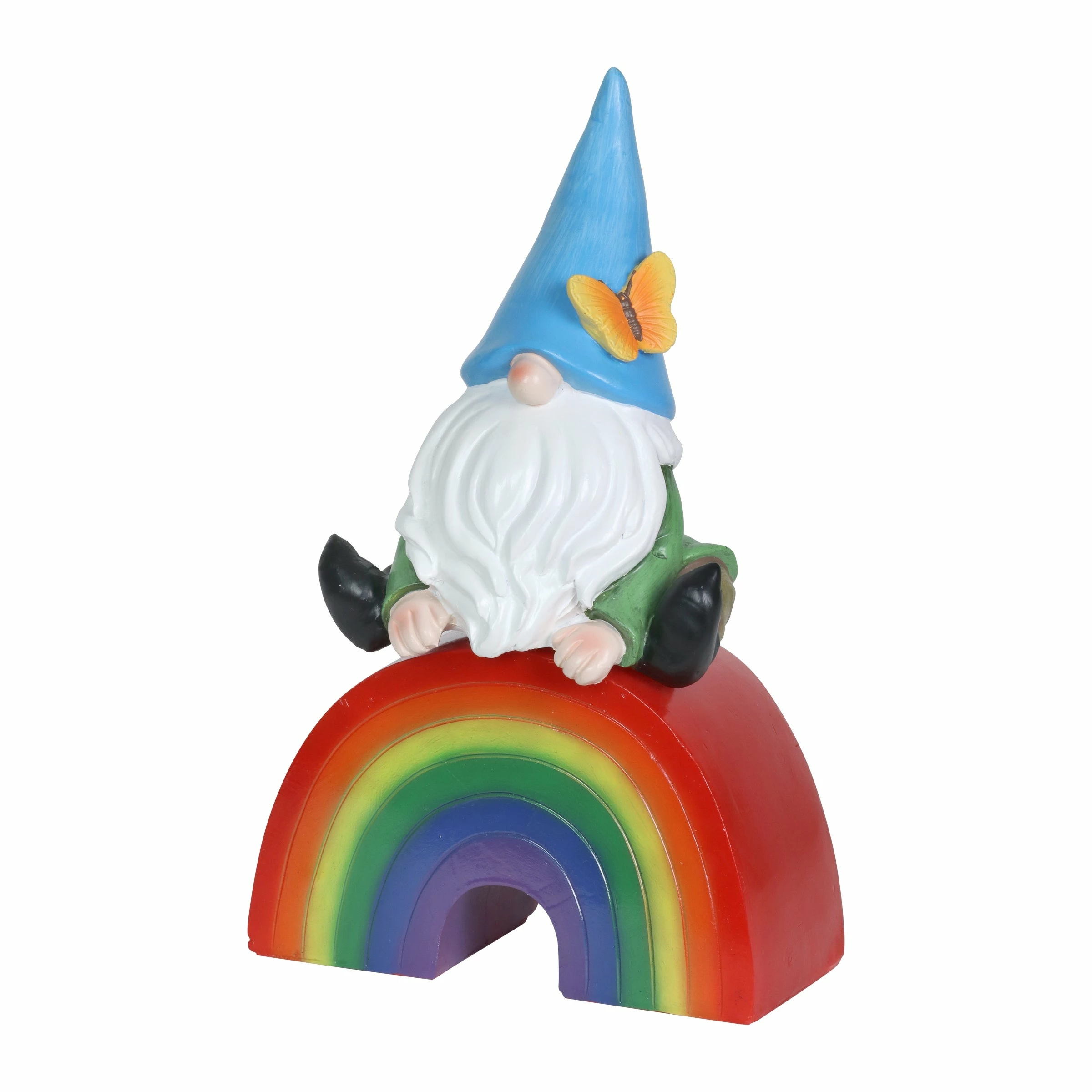 This adorable hand painted garden gnome sits on an illuminating rainbow, spreading the message of love for all! This beautifully crafted statue is on a battery powered timer so you can set the LED light to turn on automatically everyday at your desired hour! Add a touch of whimsy and fun to your home with this charming, beautifully crafted garden art by the Exhart family.